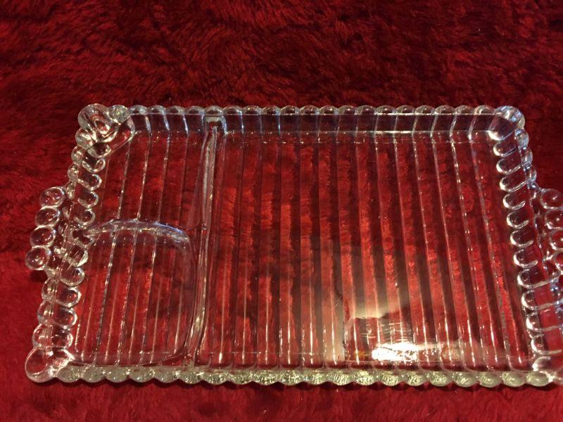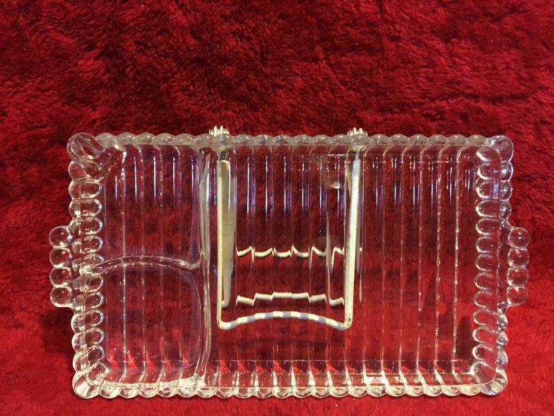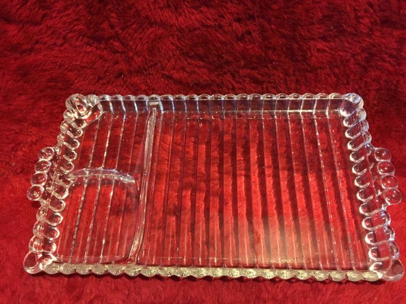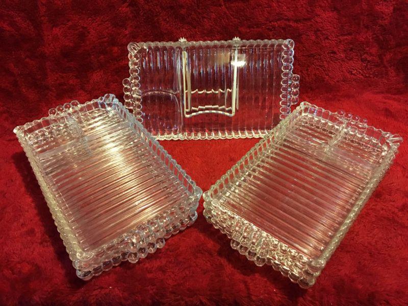 Beautiful 7 luncheon plates were manufactured by the Hazel Atlas company in the Ball and Ribbed pattern or also referred to as Berwick or Boopie style. The plates are made of very heavy clear pressed glass. The glass on top of the plate is smooth. 10" Long x 6" Wide