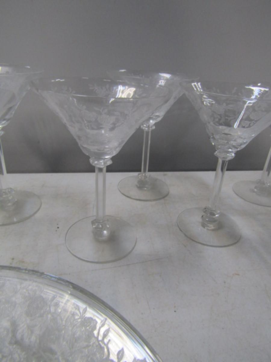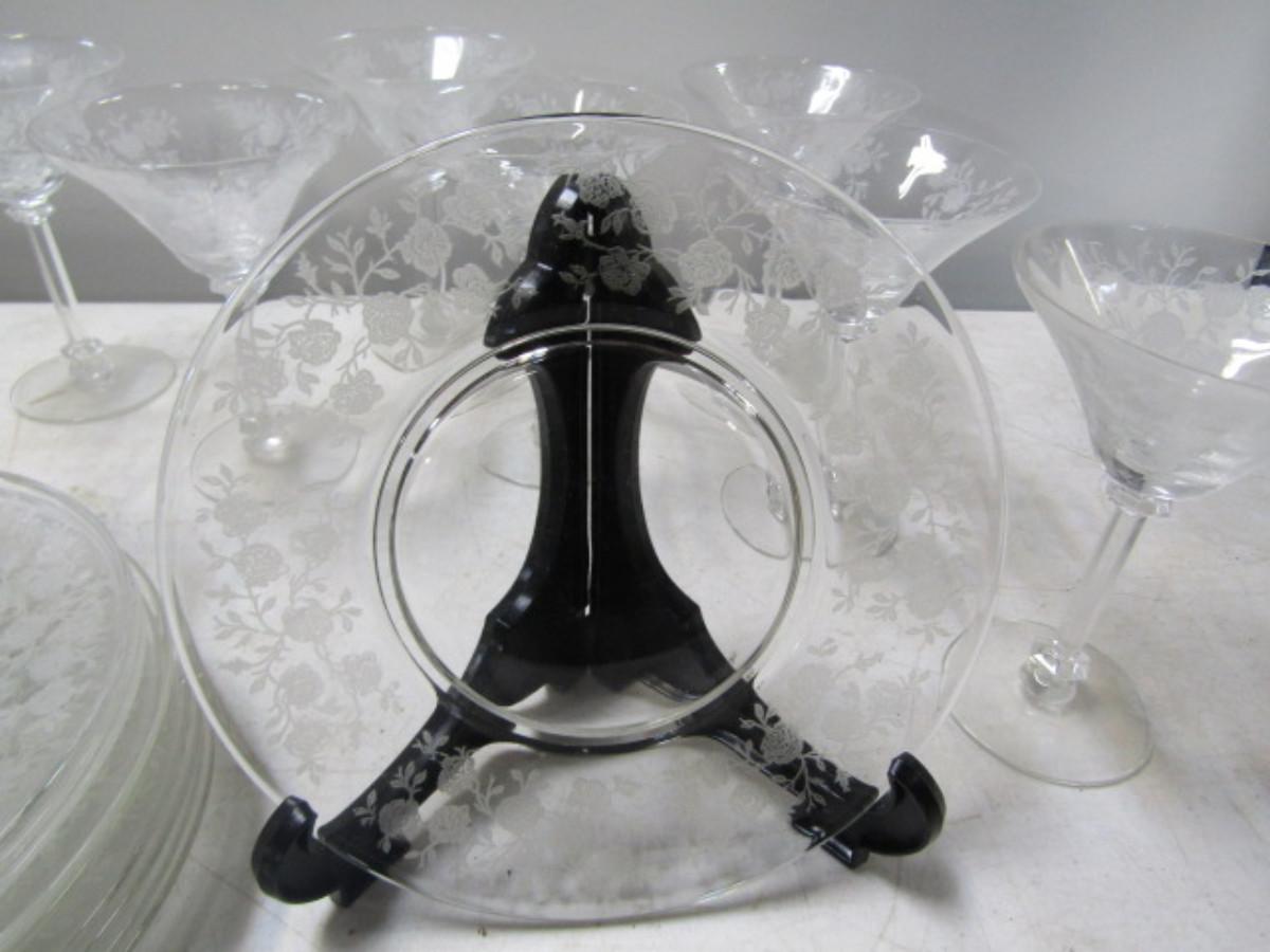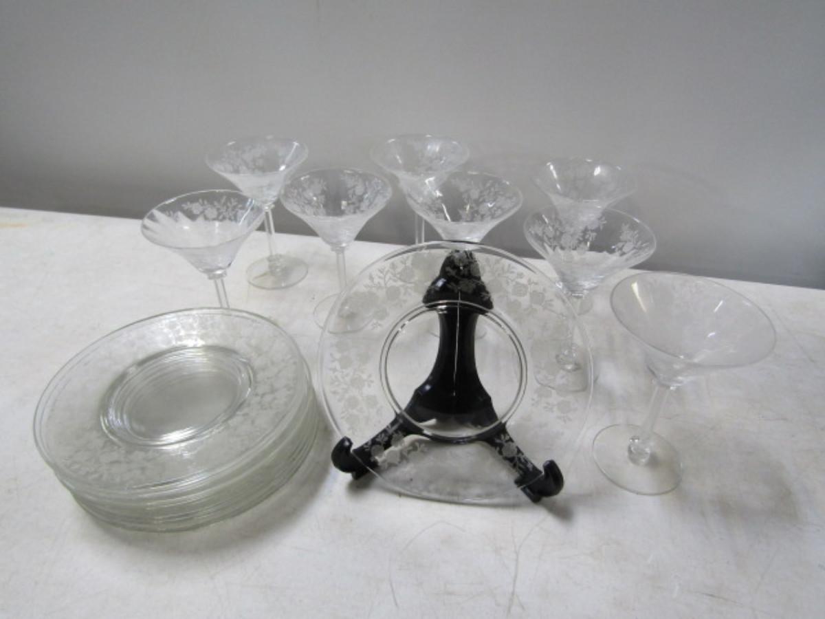Glass Luncheon Plates and Martini Glasses Engraved with Rose Pattern (10 Plates, 8 Glasses)