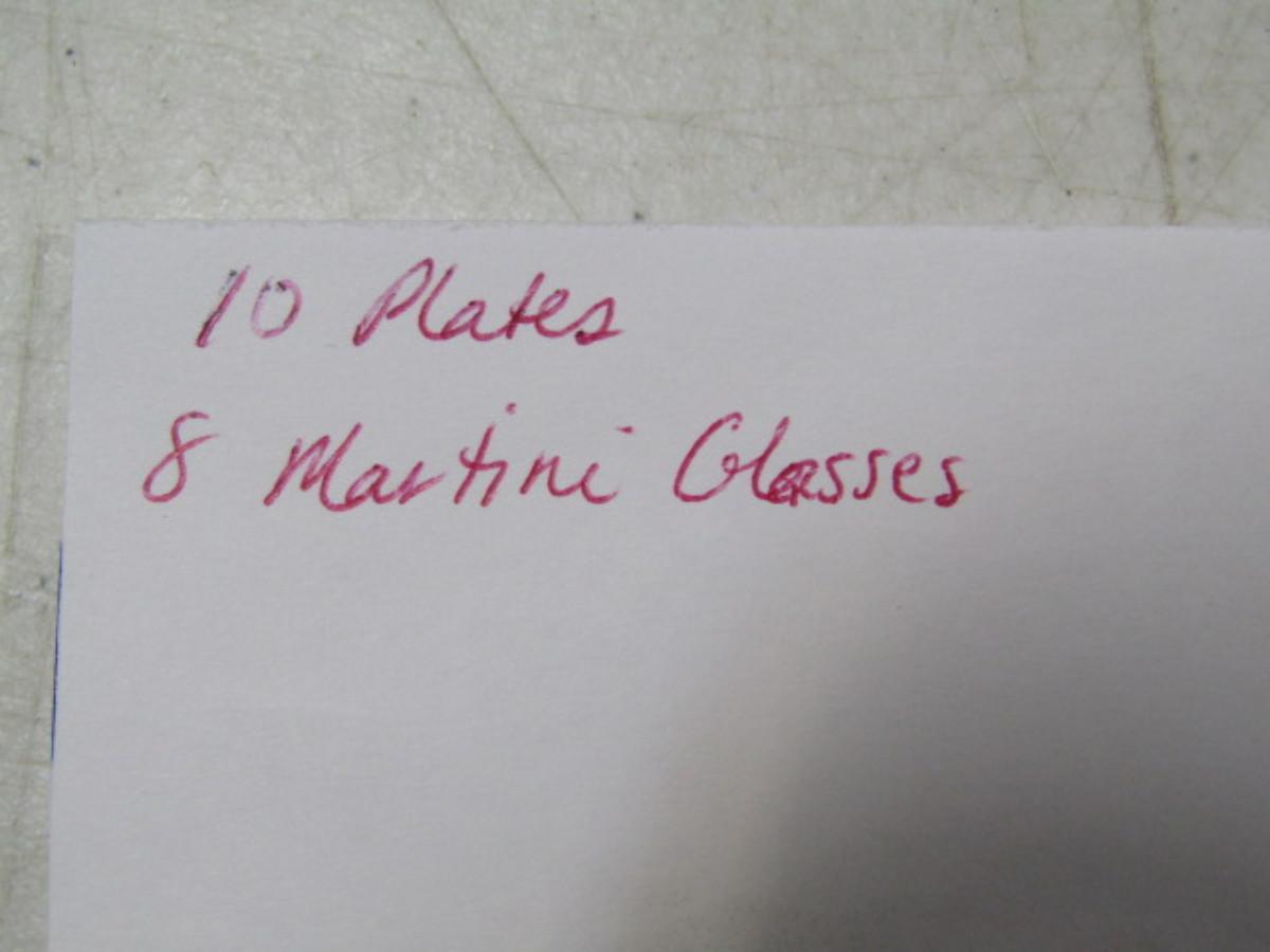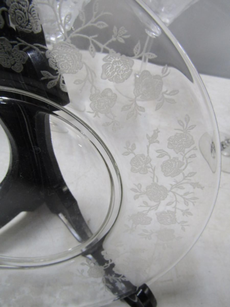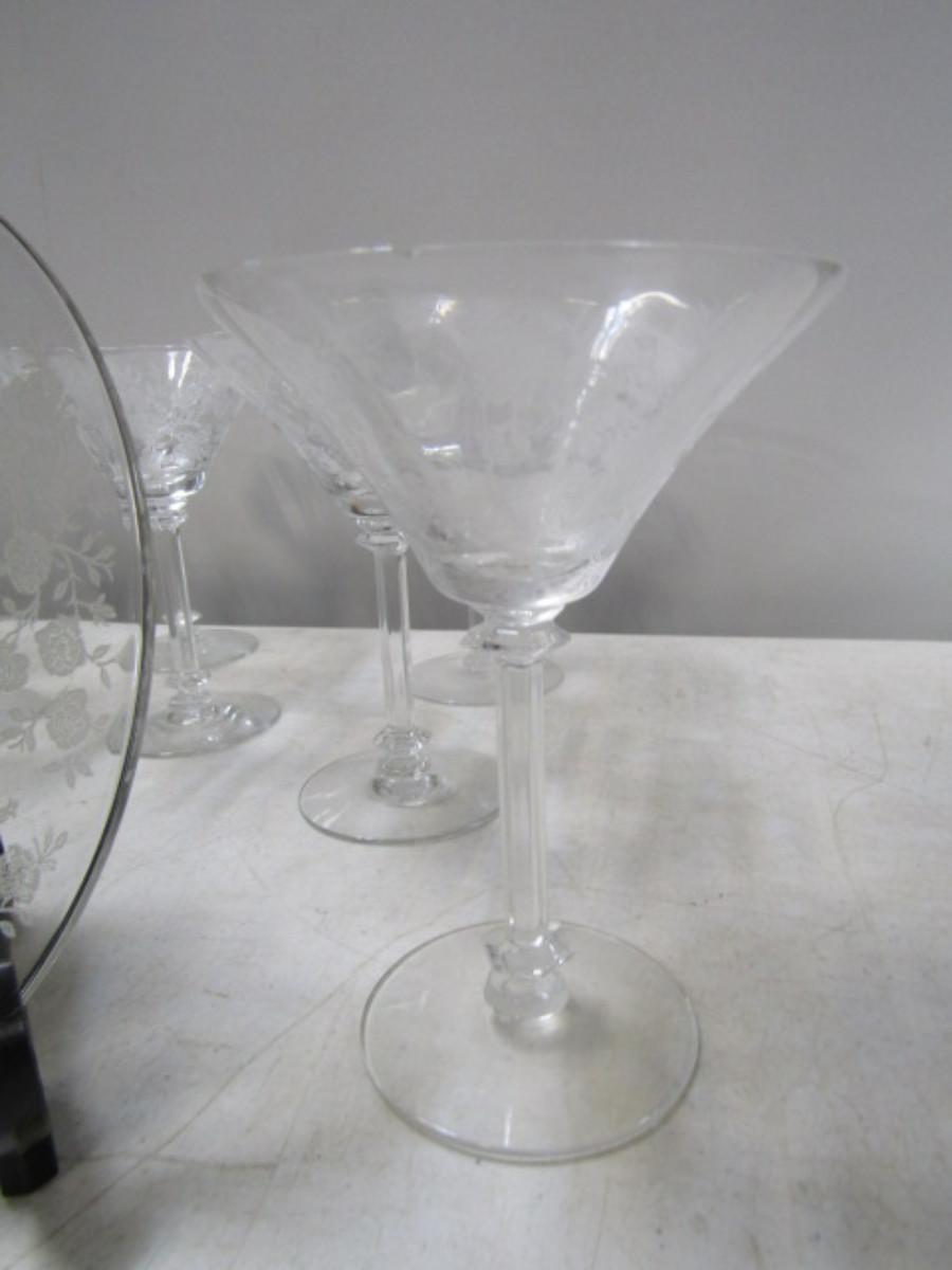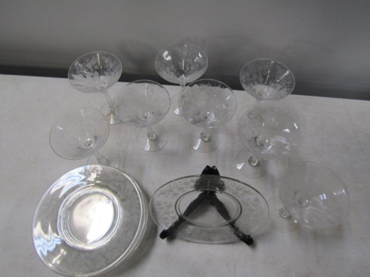 Glass Luncheon Plates and Martini Glasses Engraved with Rose Pattern (10 Plates, 8 Glasses)