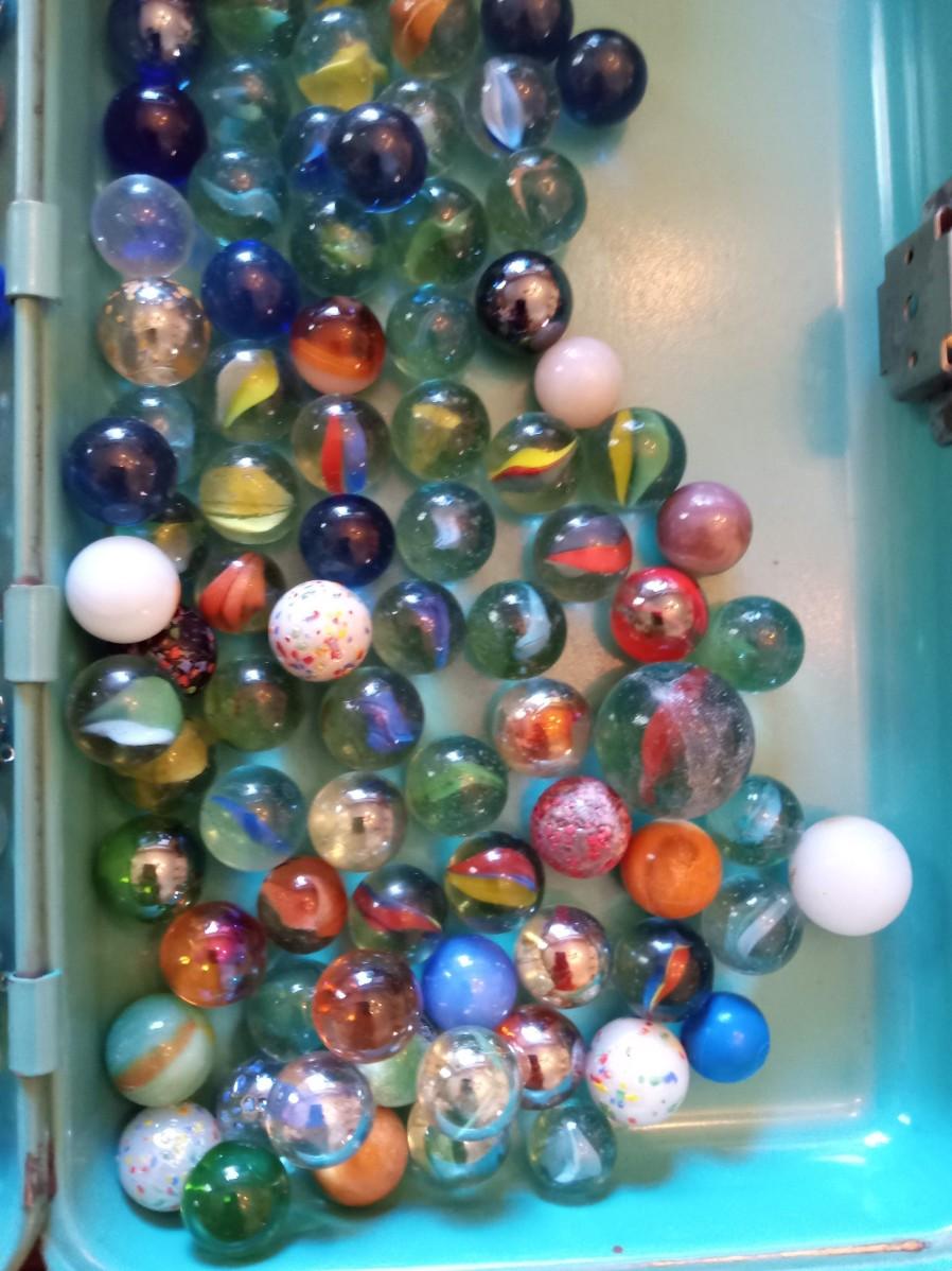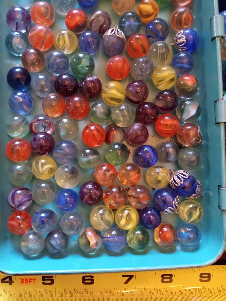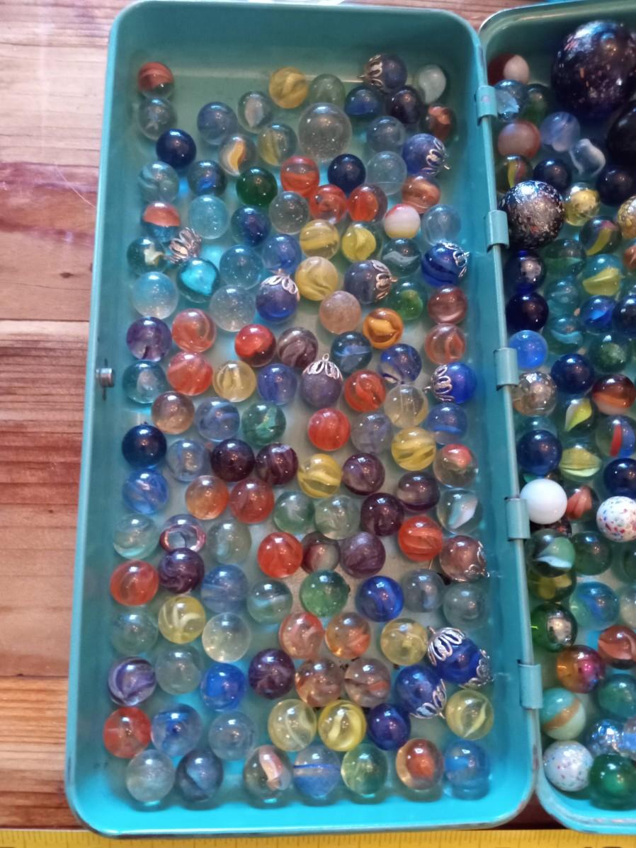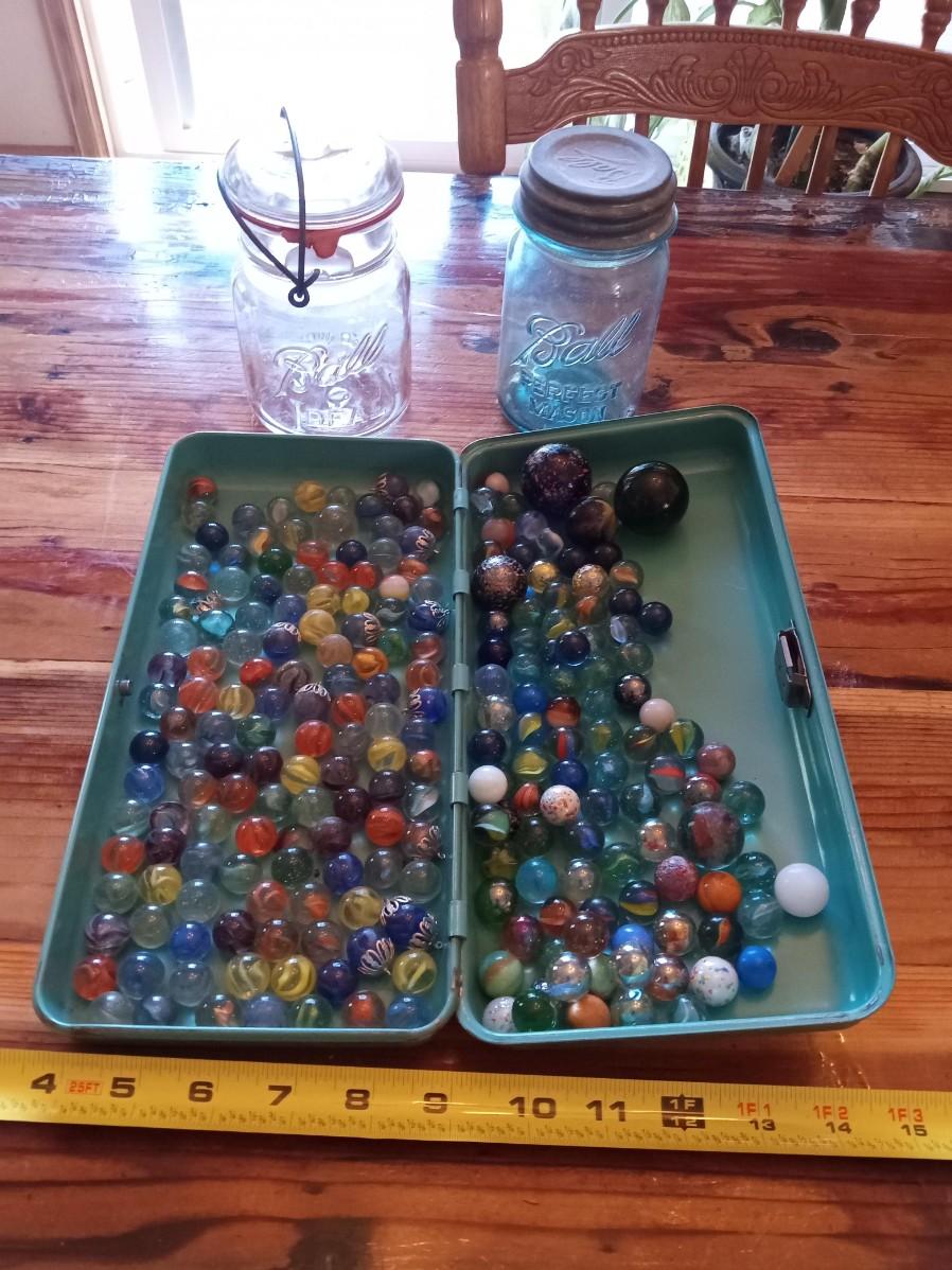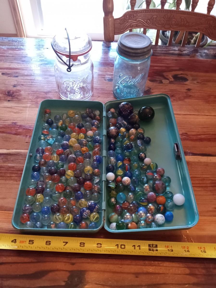 GLASS MARBLES IN A METAL BOX WITH VINTAGE CANNING JARS