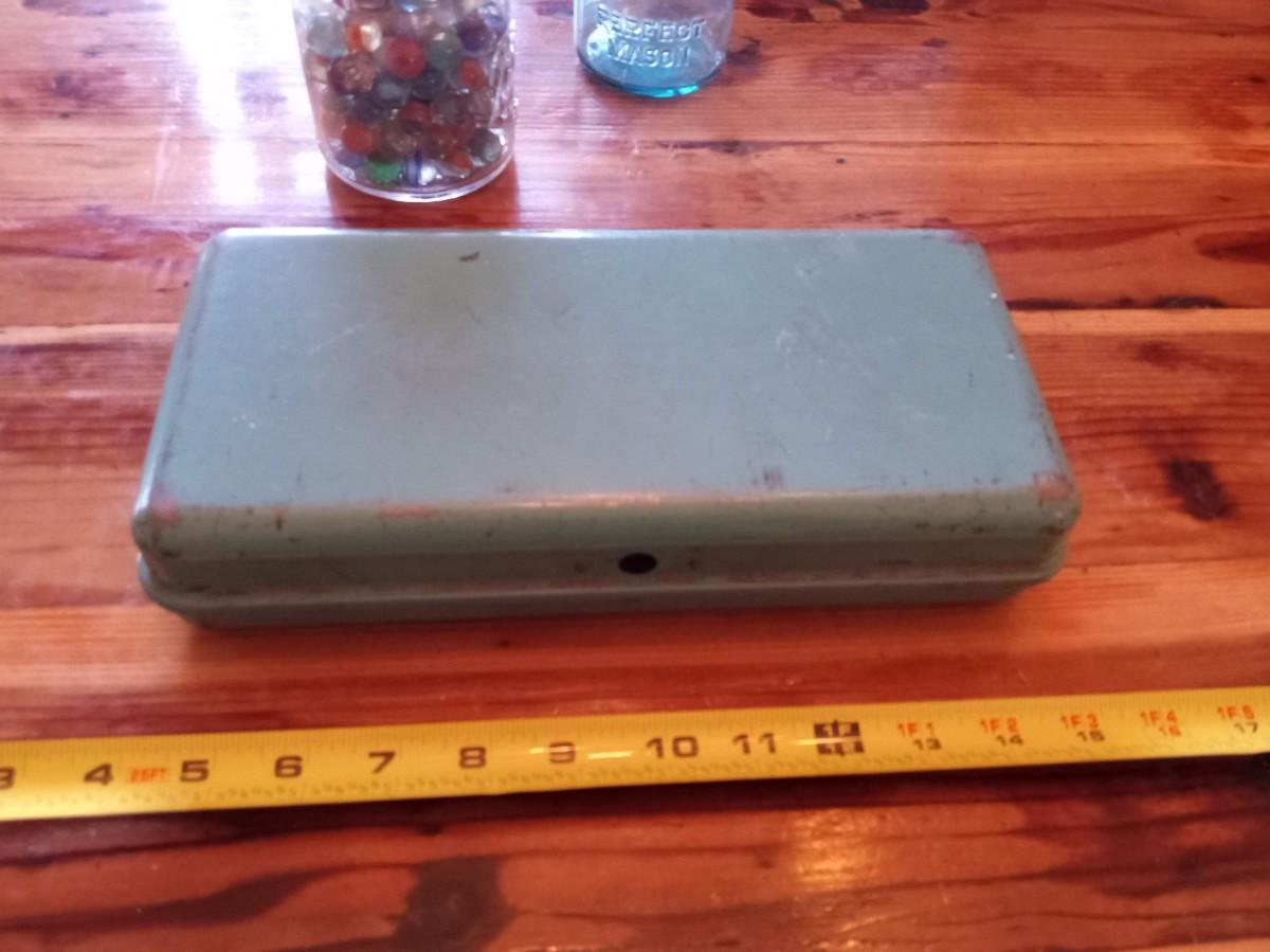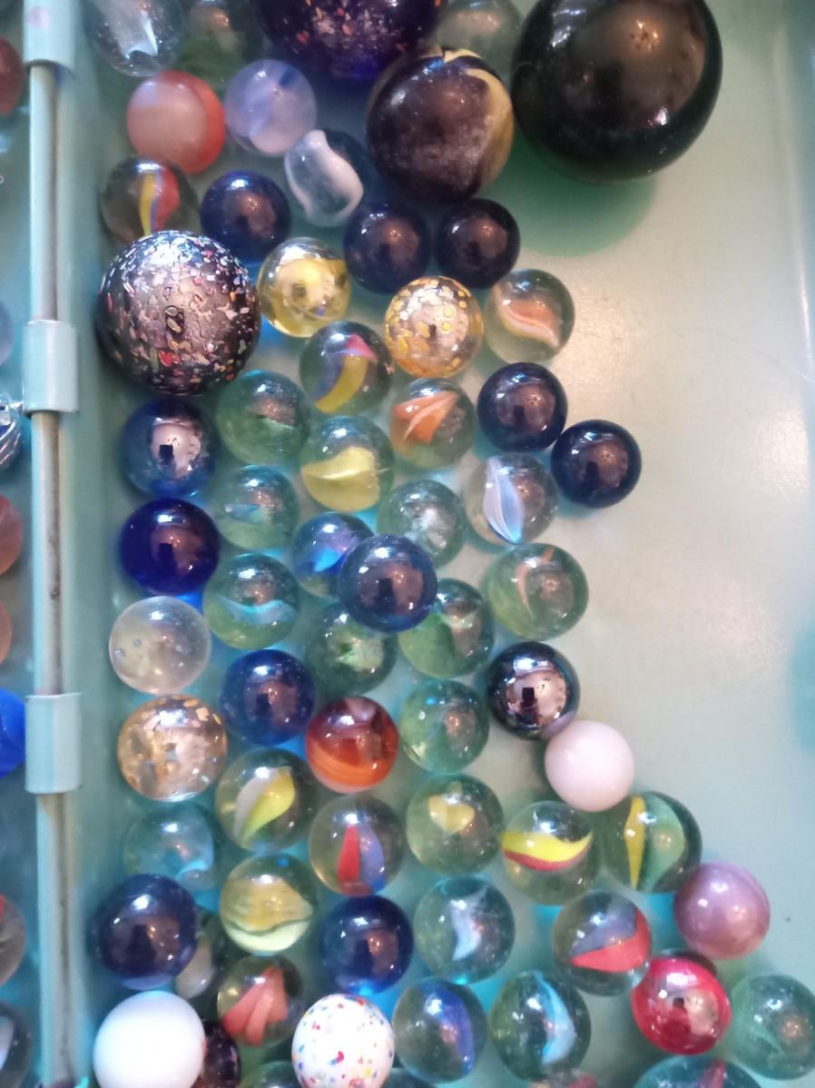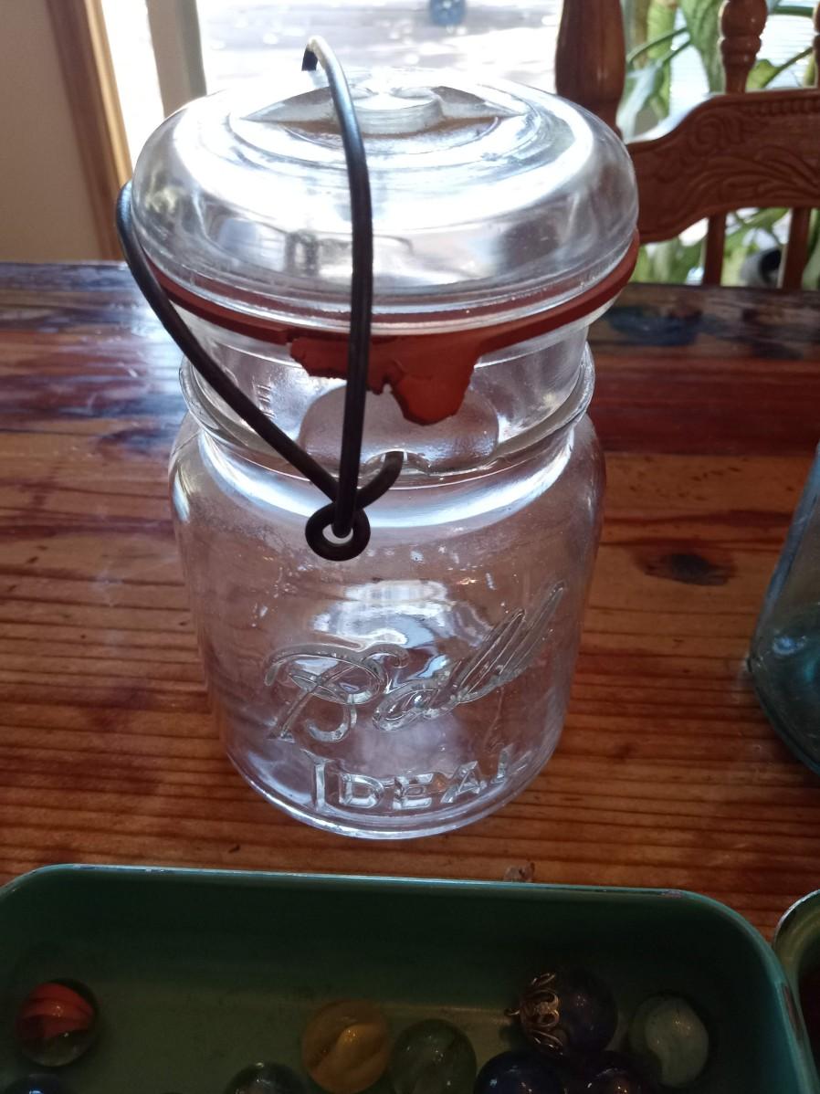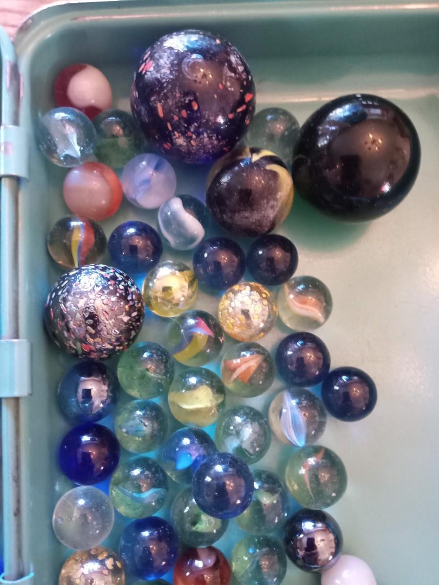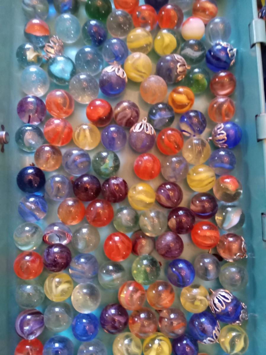 GLASS MARBLES IN A METAL BOX WITH VINTAGE CANNING JARS