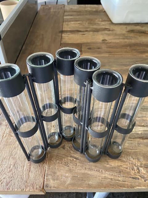 5 metal and glass connected bud vases. Very unique and simple elegance added to any room :). Measures 10" long x 8" high.