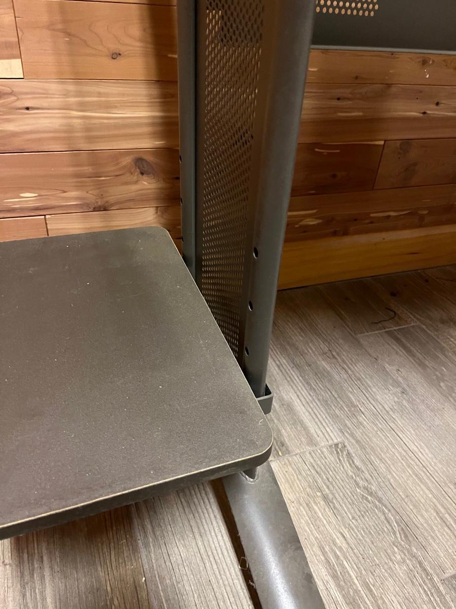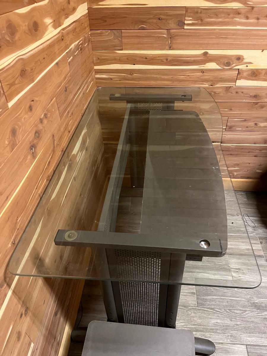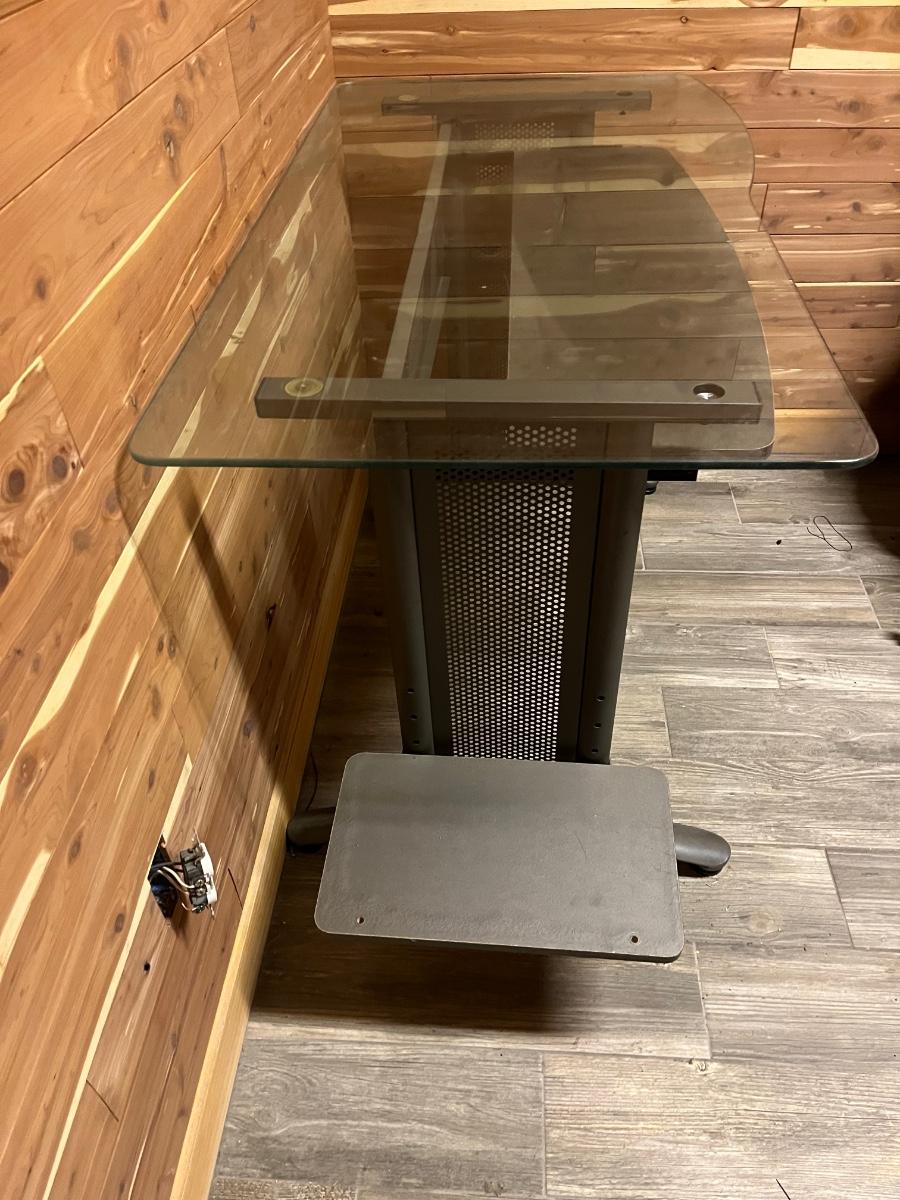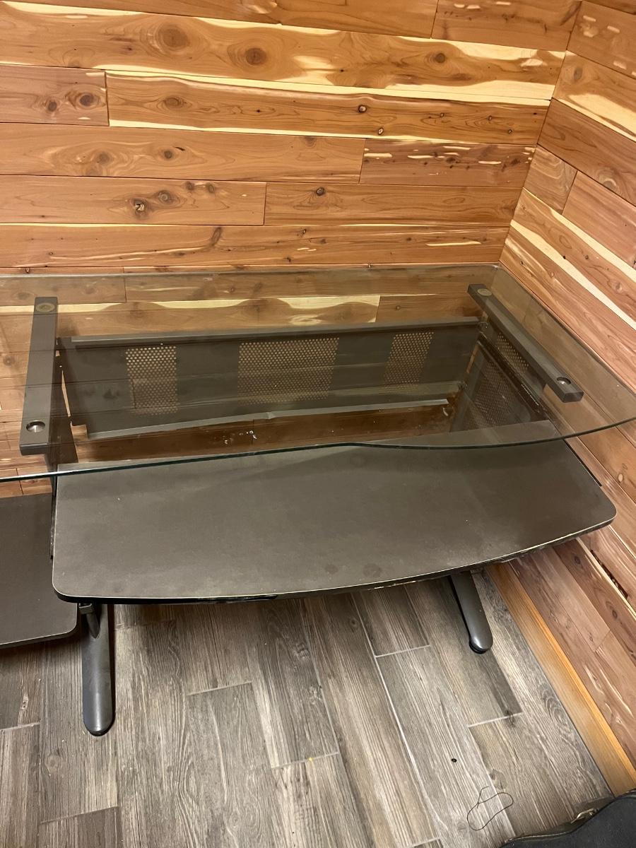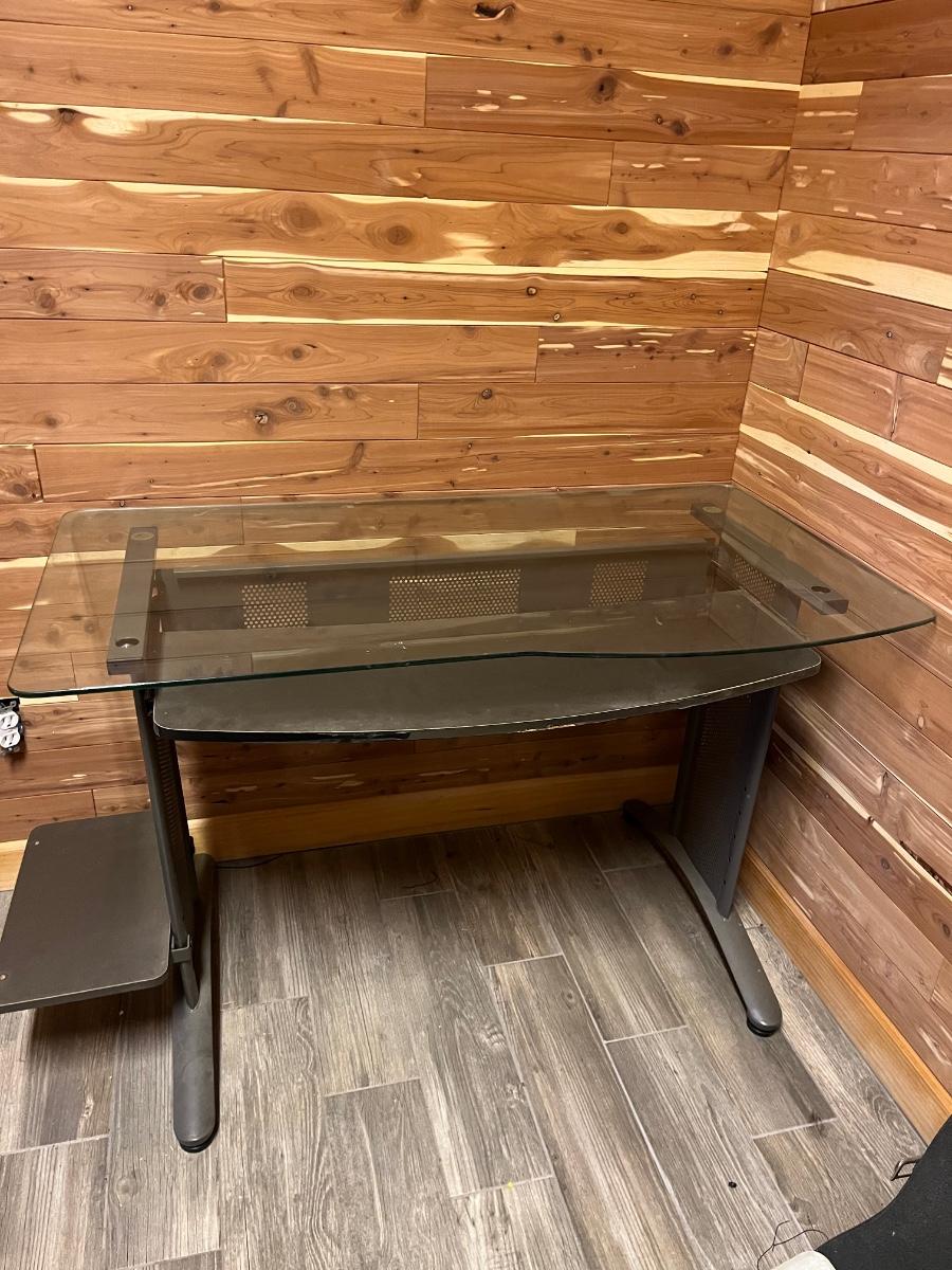 Lot includes a glass topped desk with a metal base and slide out keyboard drawer. Desk measures 25” x 47” x 30” not including removable printer shelf.