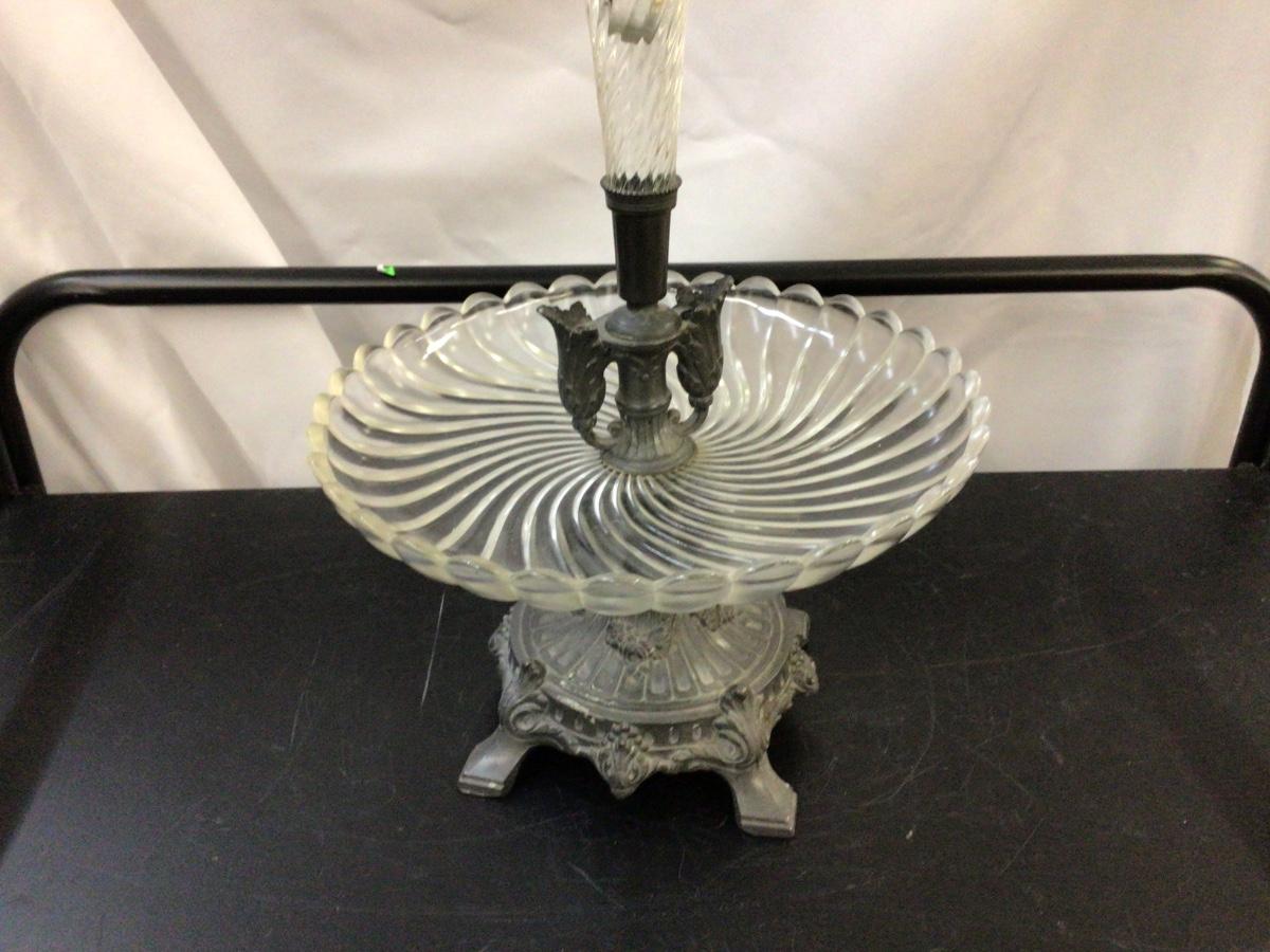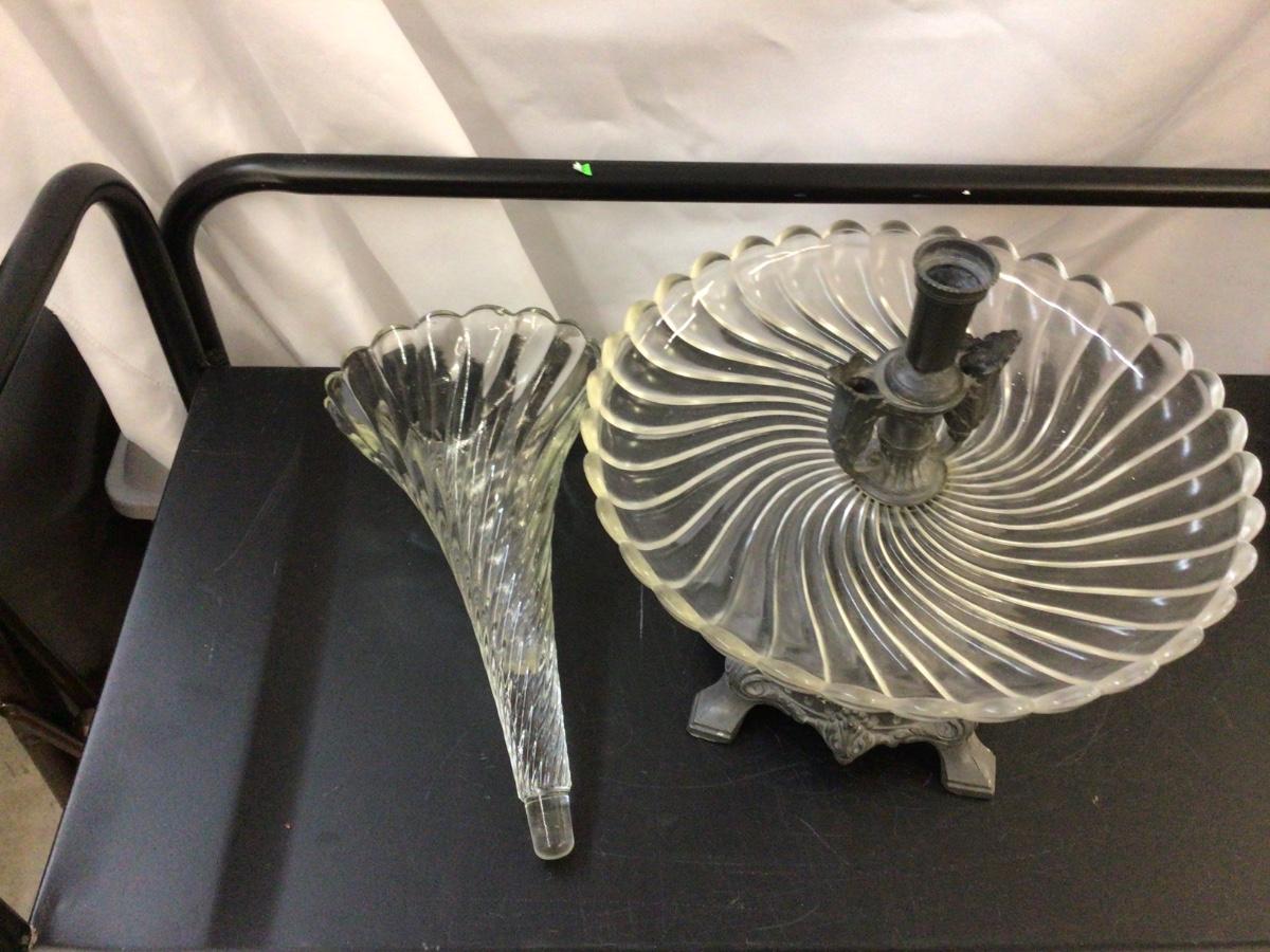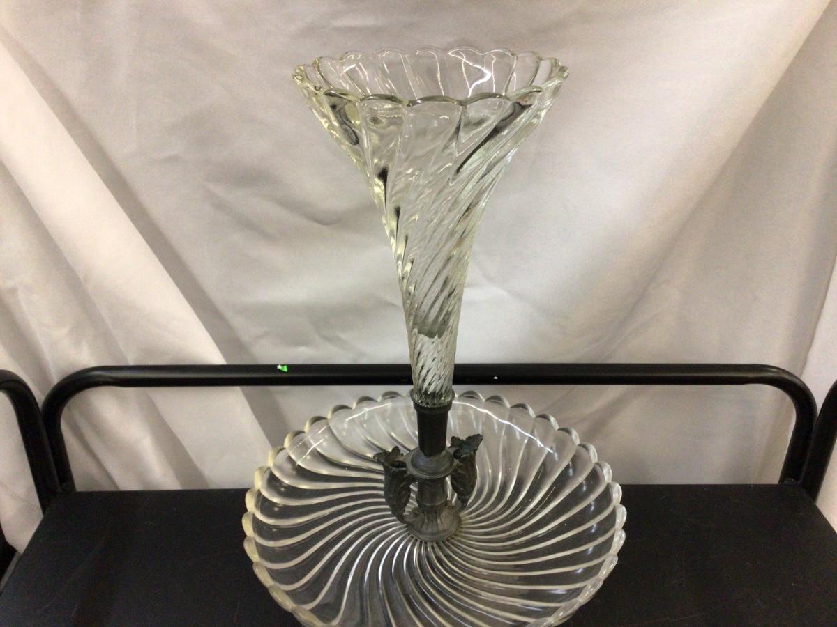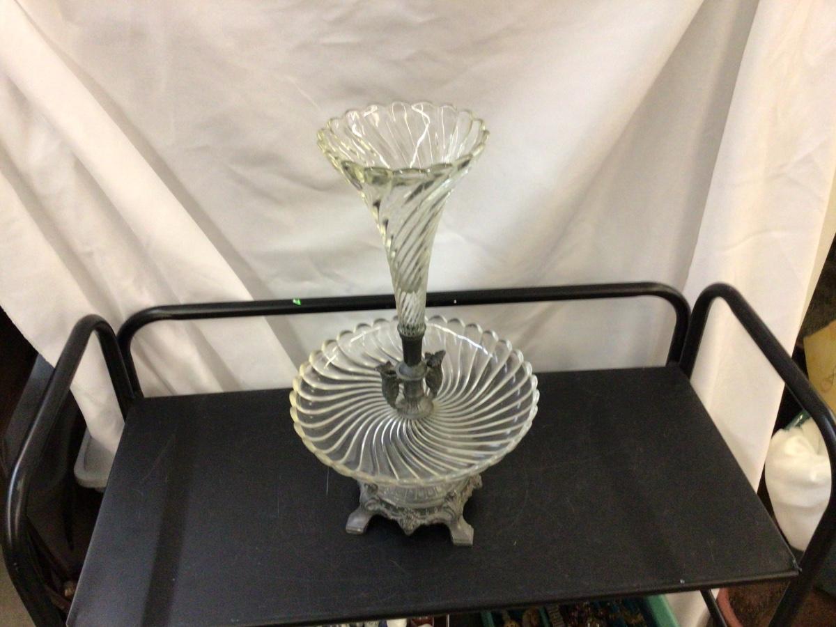 You get this tall glass vase with serving tray on metal base. Really cool item.