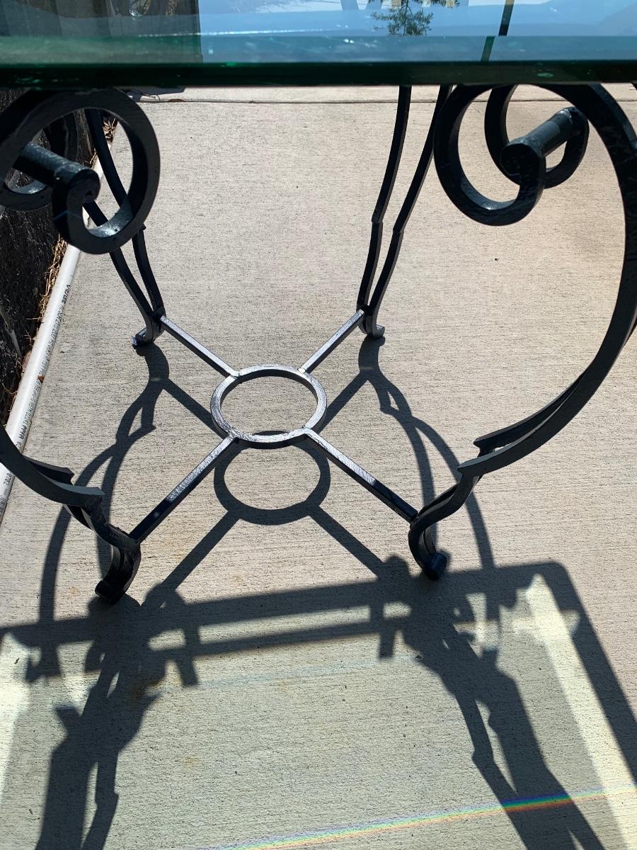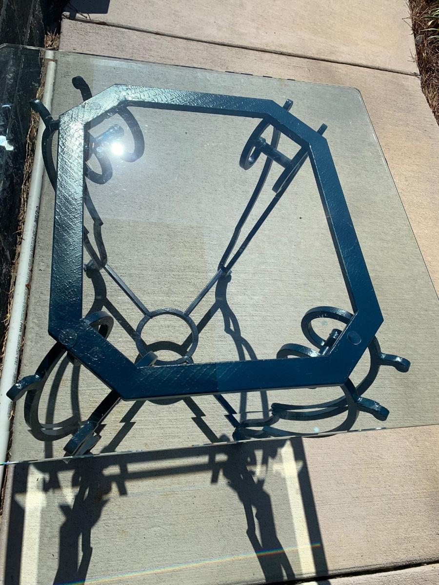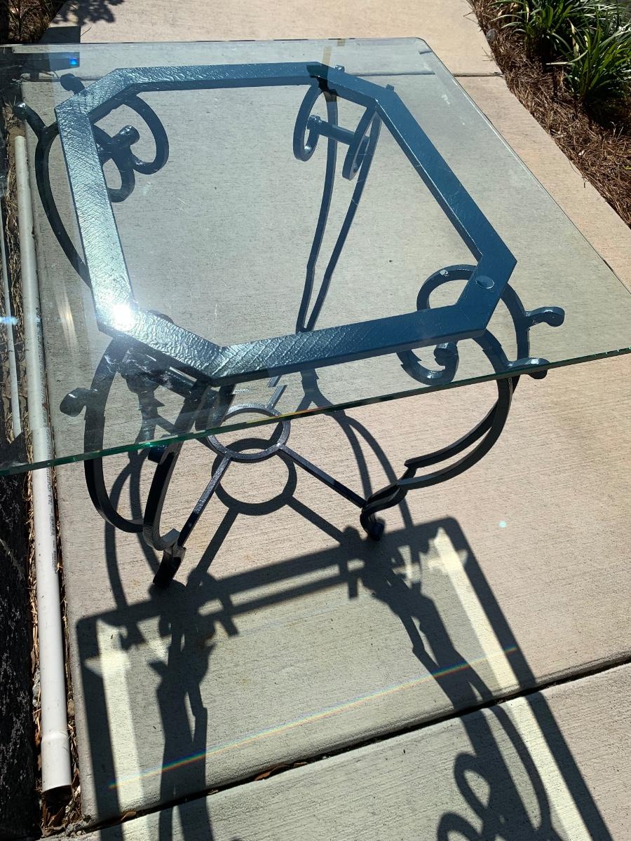 Thick beveled glass with rounded edges top on this metal base table of navy blue