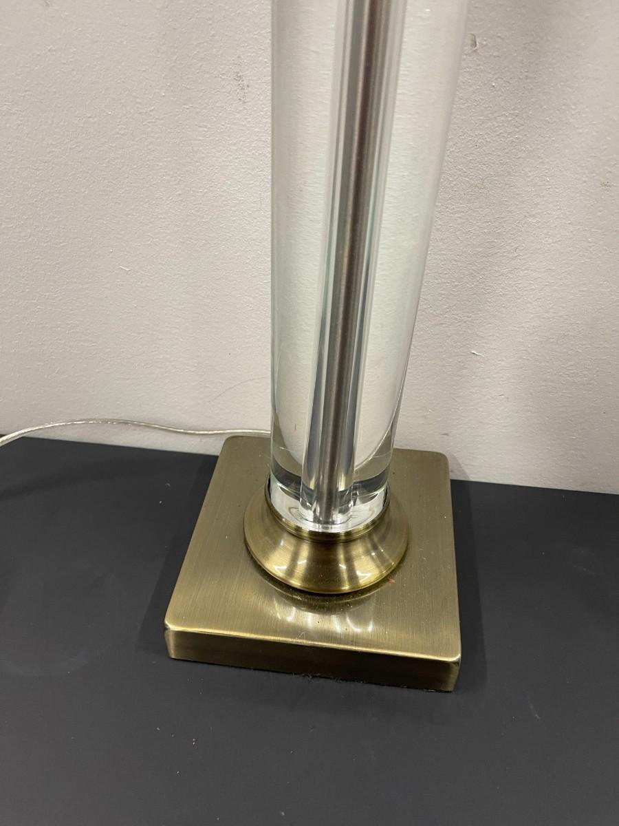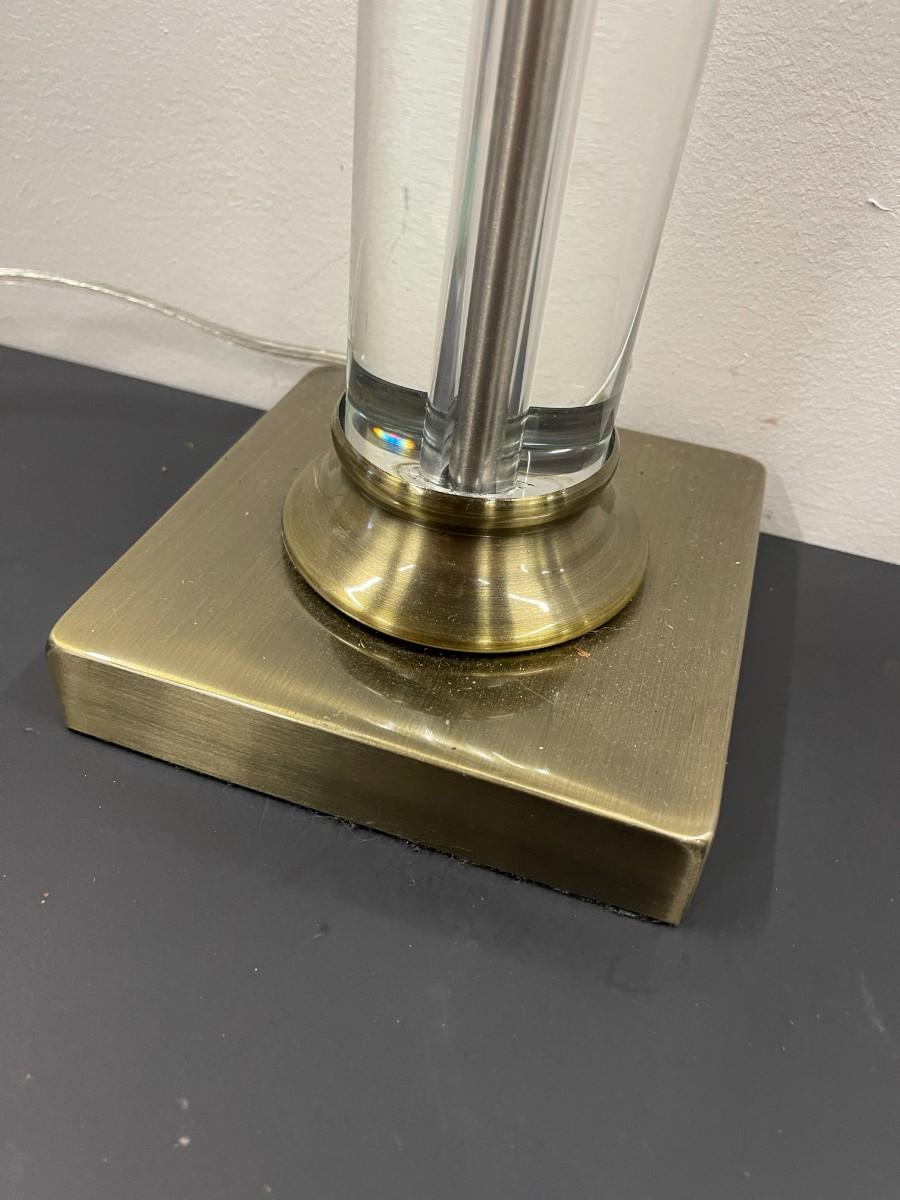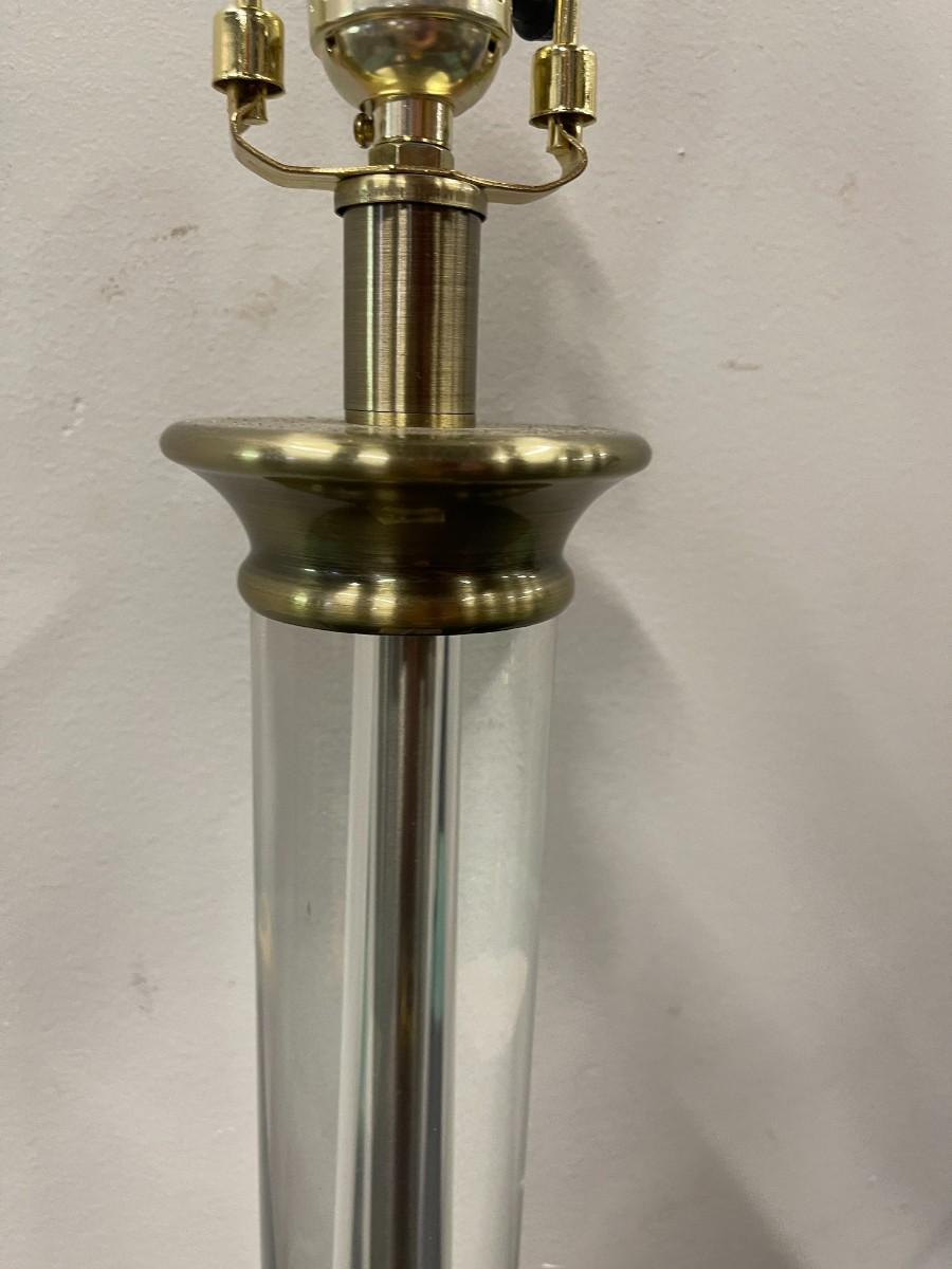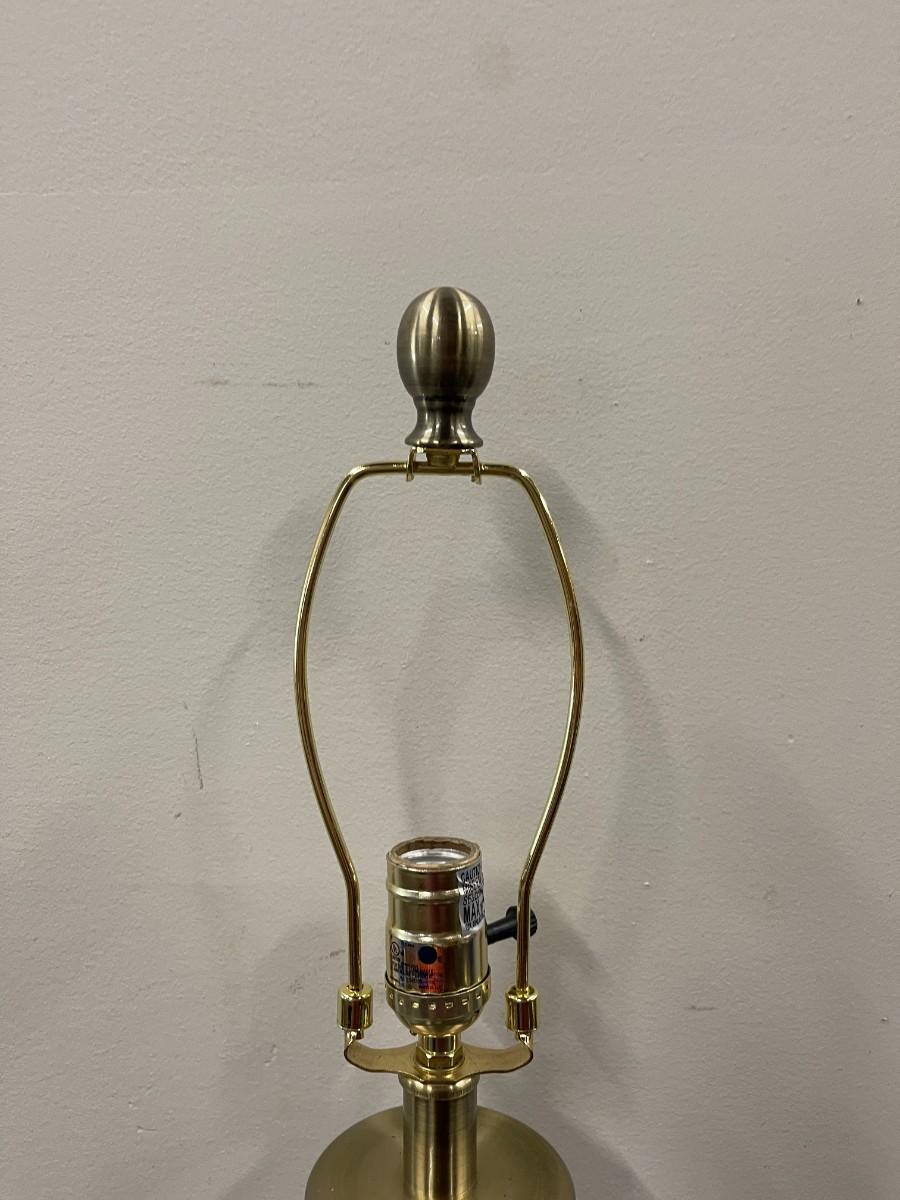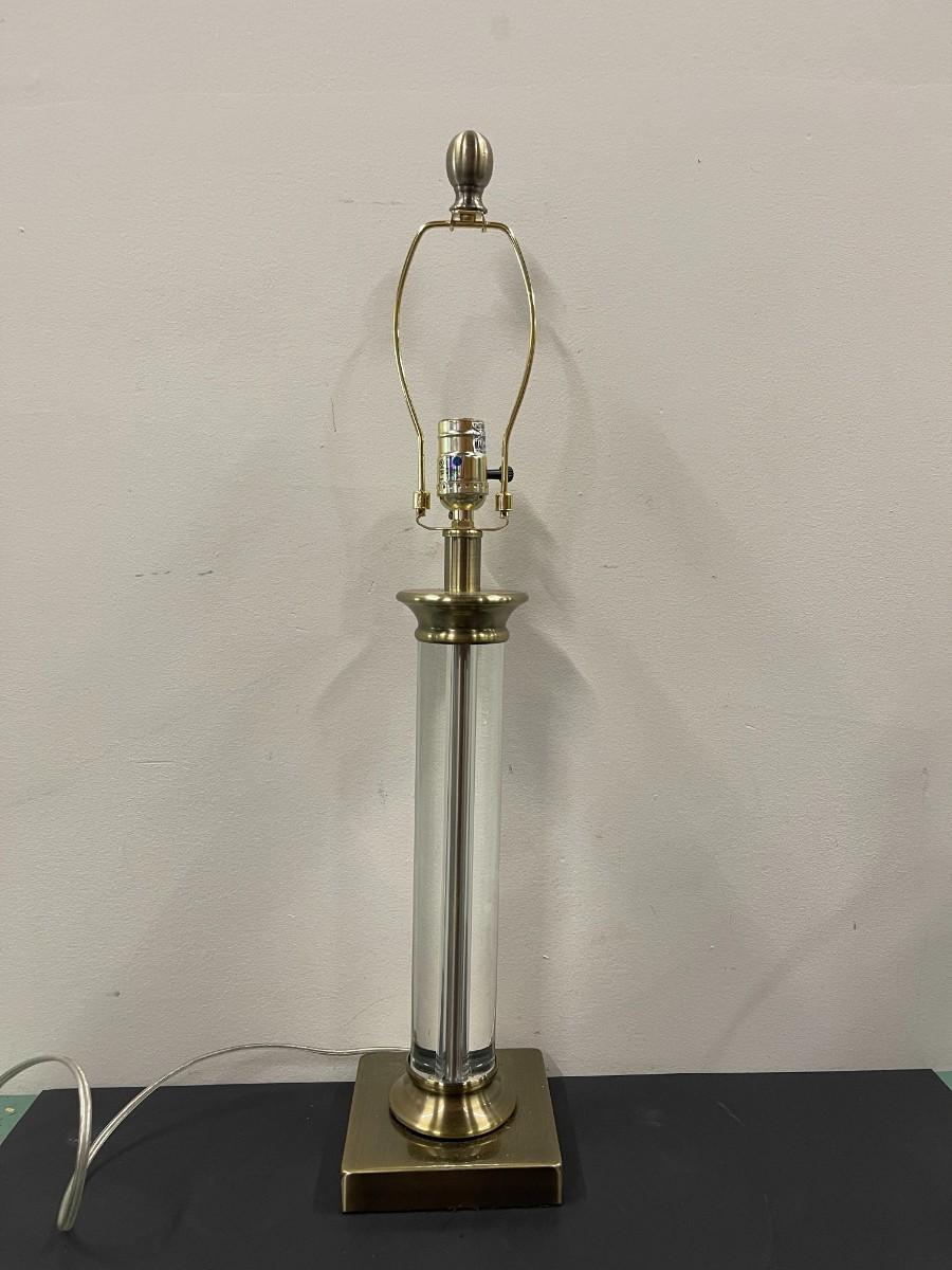 Glass and metal table lamp. Metal has a brass finish. Untested and does not come with a shade. 26" to the top of the finial.