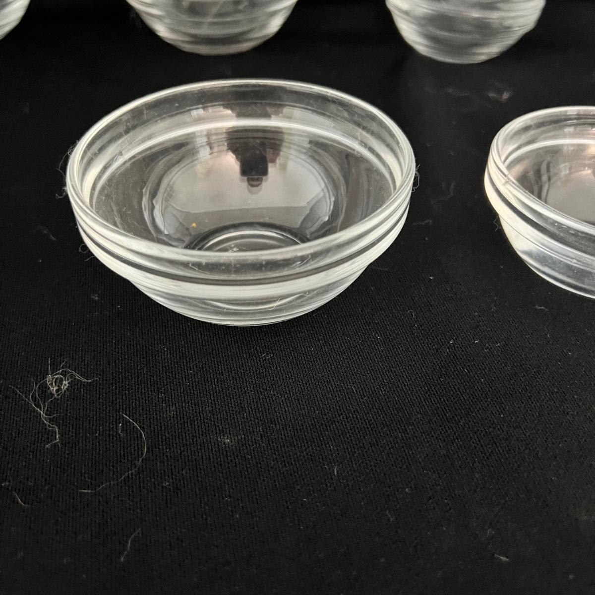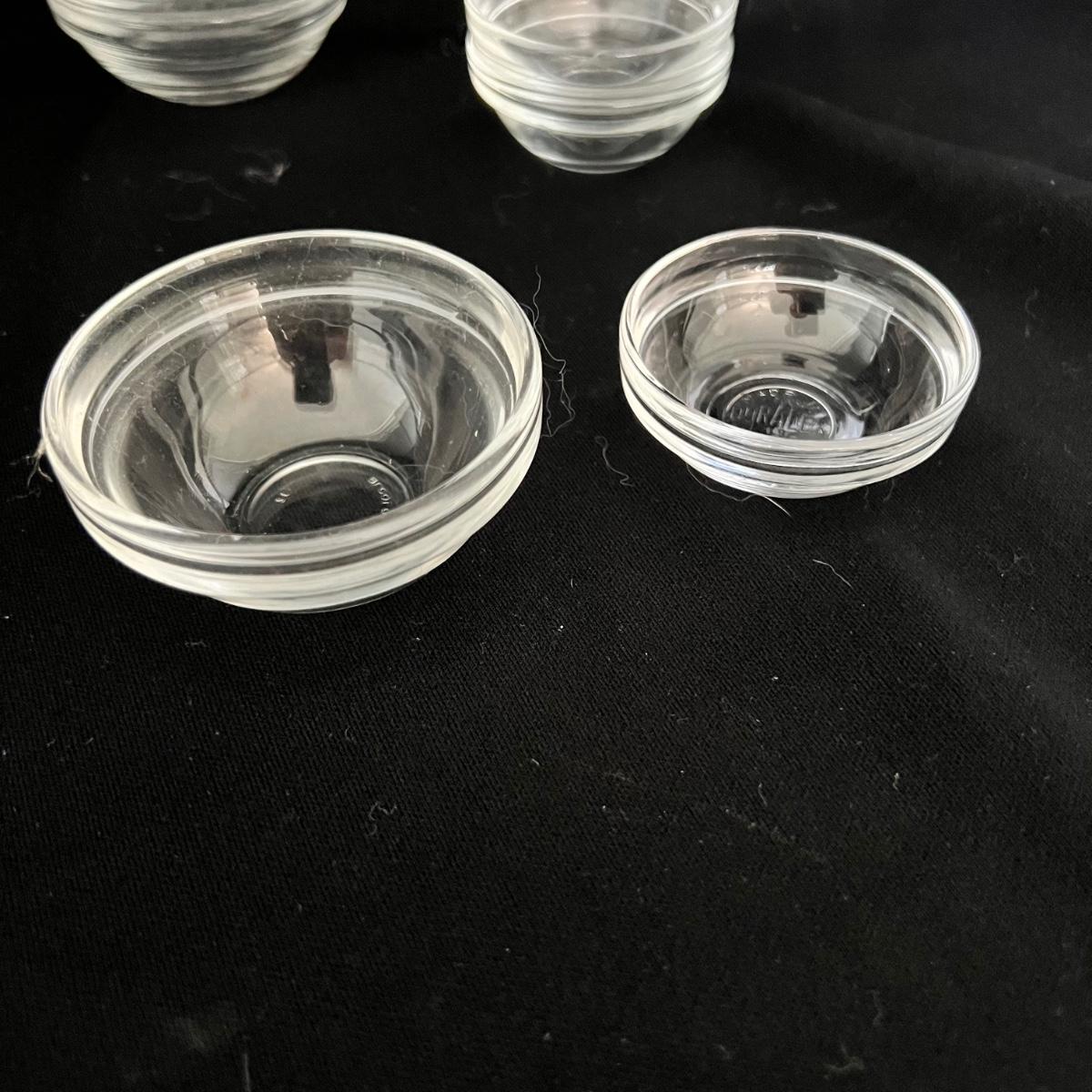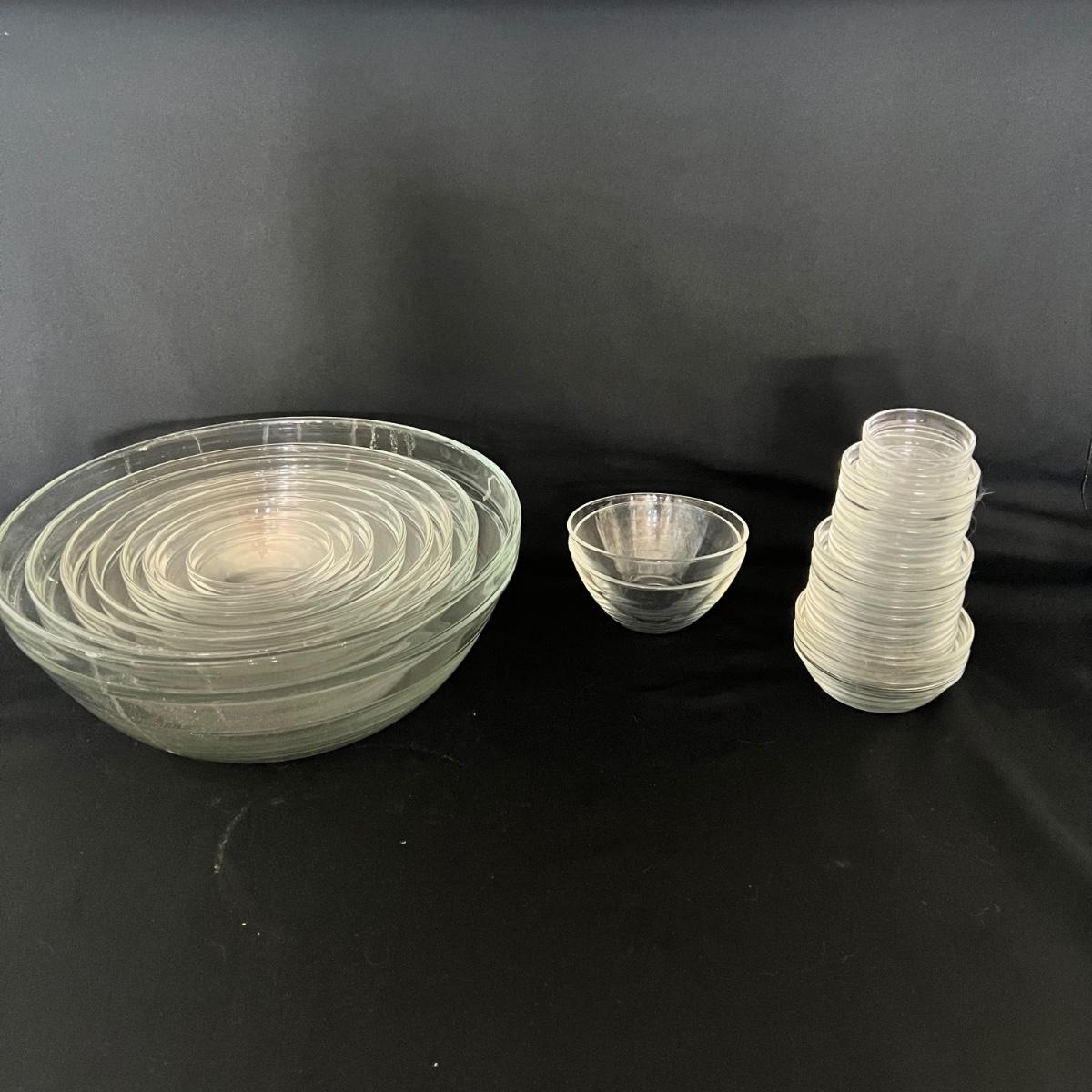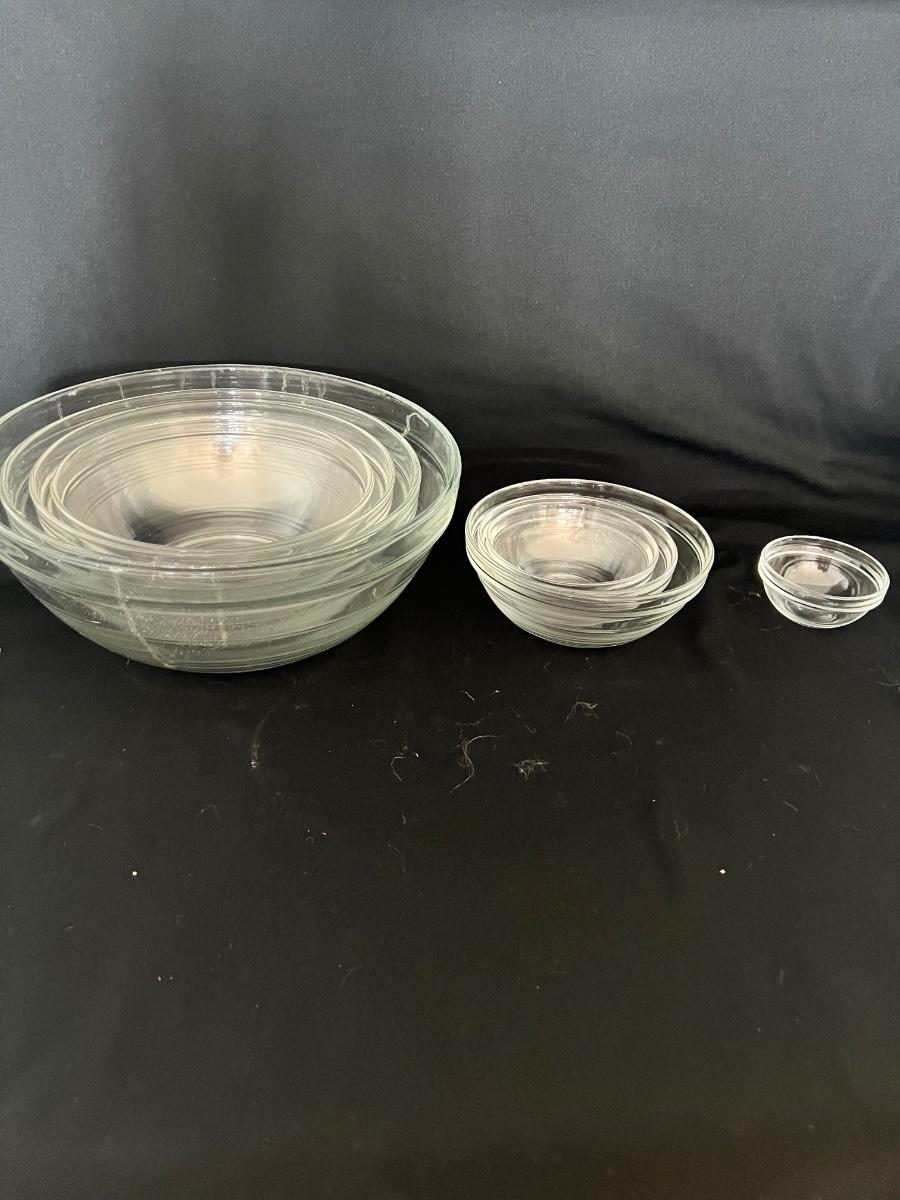 A set of eight nested mixing bowls of various sizes, the largest is 12”D x 5”H and the smallest is 3.5”D x 1.85”H. Also 13 nested glass prep bowls and two glass bowls that are 5”D x 2.25”H. Also one small sunbeam mixing bowl that measures 6.25”D x 4.25”H.