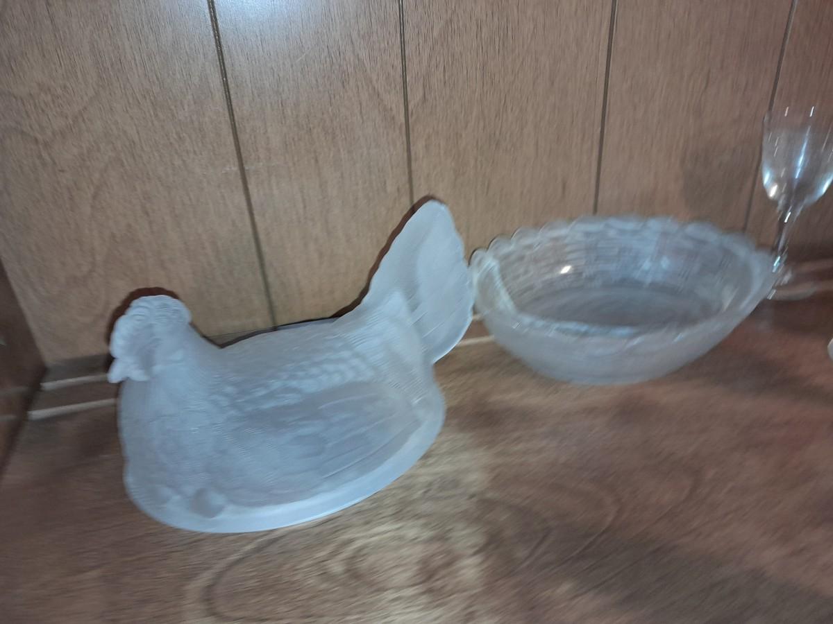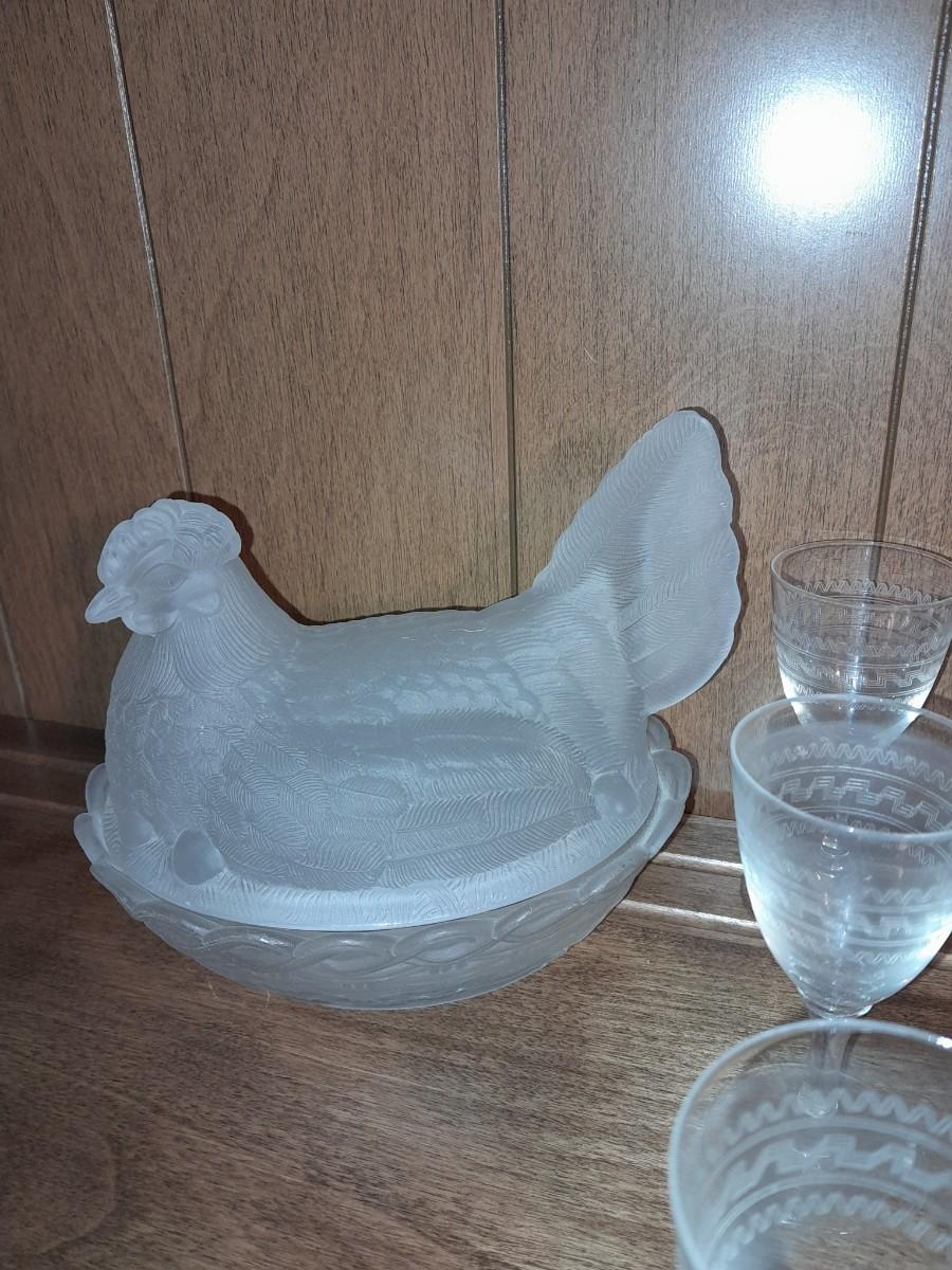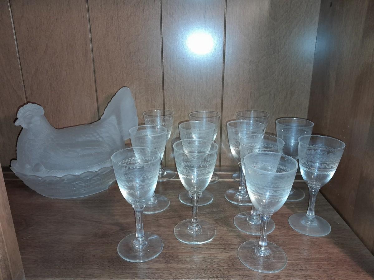 GLASS NESTING CHICKEN (crack in base of nest) AND 12 SMALL STEMMED GLASSES