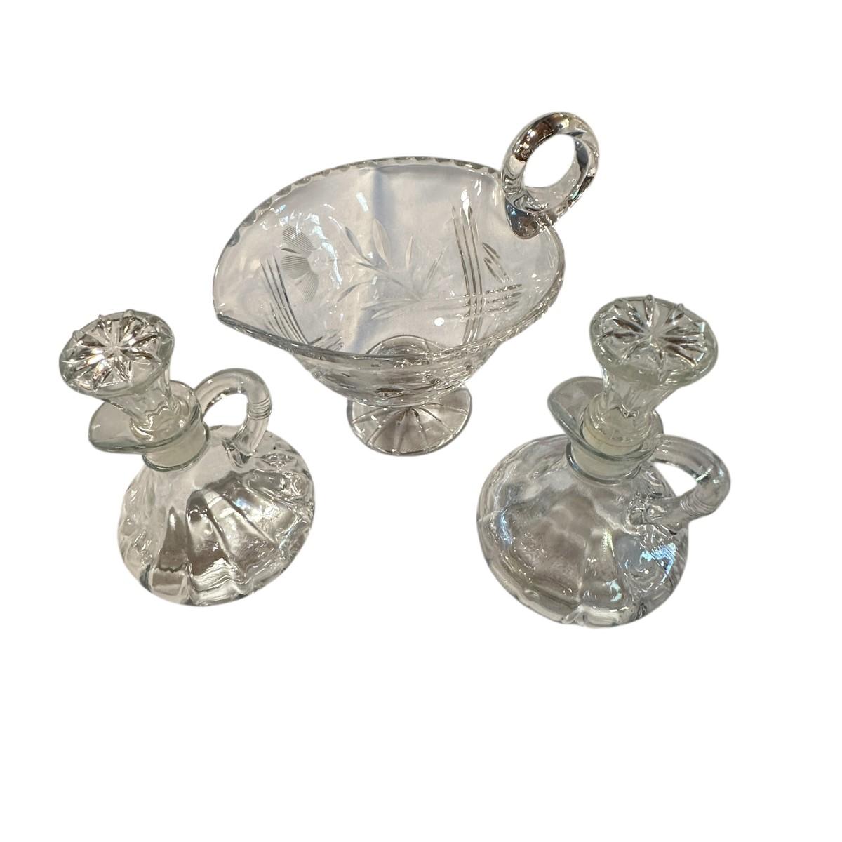Glass Oil and Vinegar Containers and Glass Bowl (one chip on base as shown)