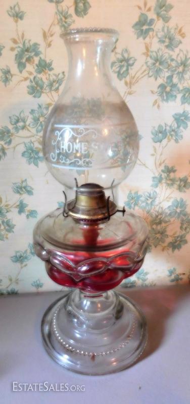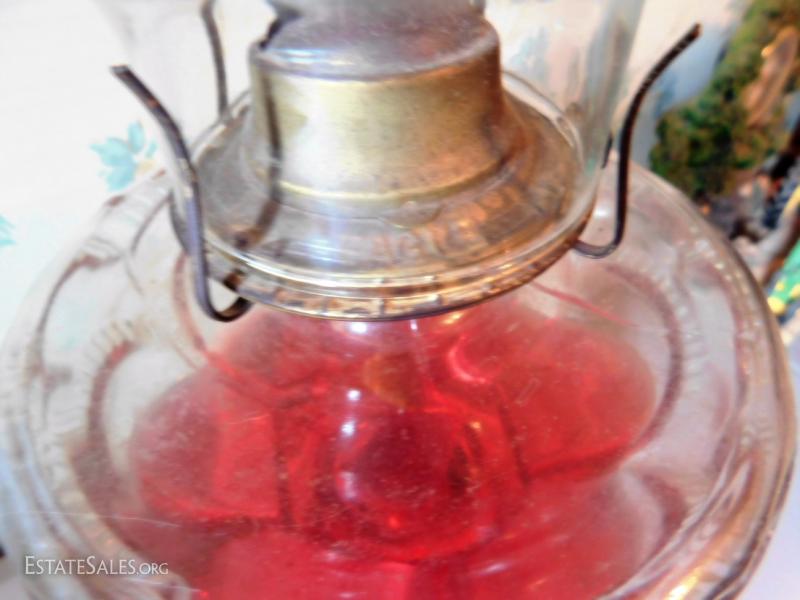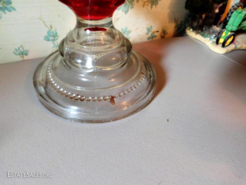 Tall glass oil lamp with Eagle wick cap. Has some oil residue. Chimney probably not original to glass base.
