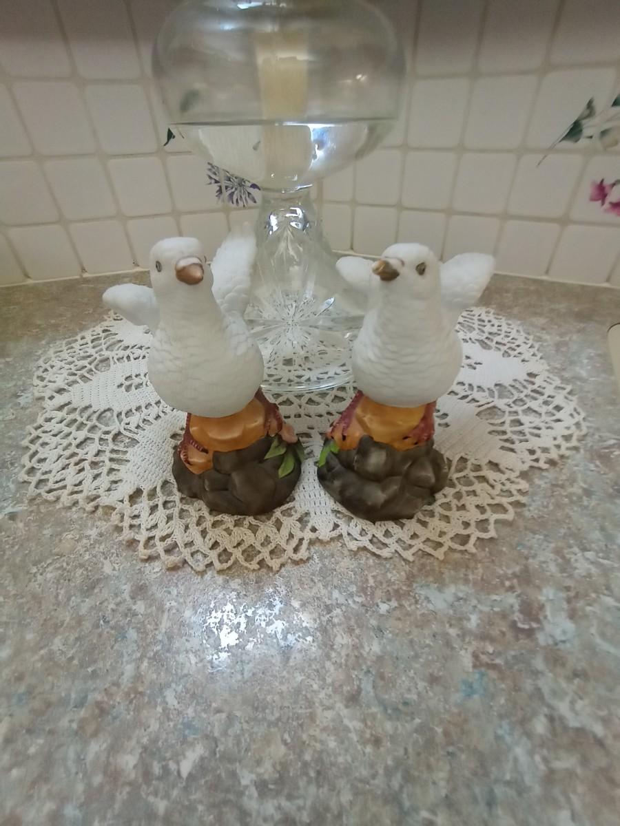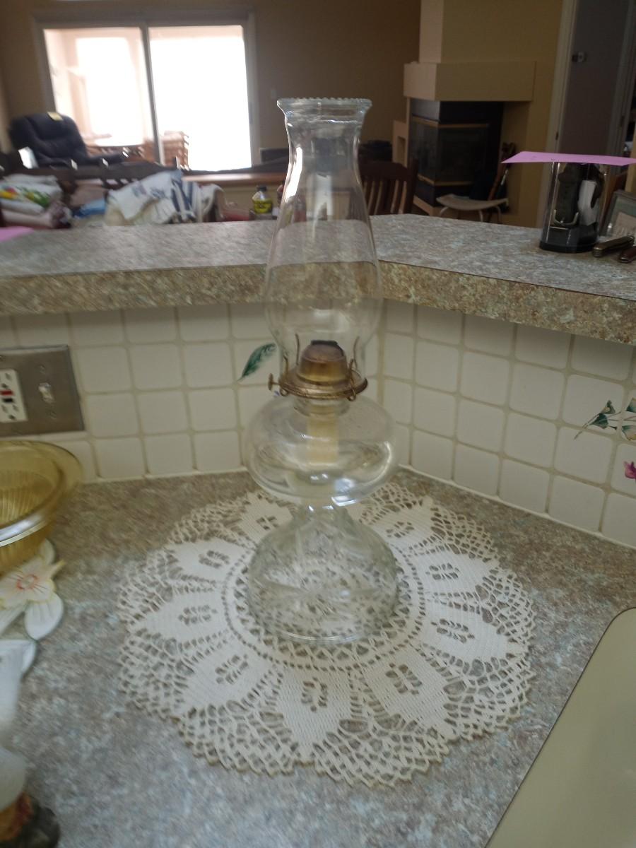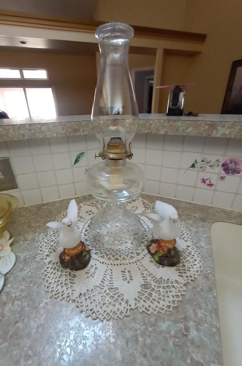 GLASS OIL LAMP AND CERAMIC BIRDS