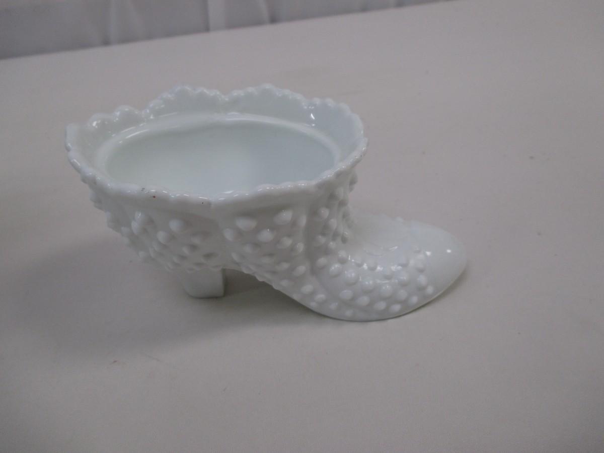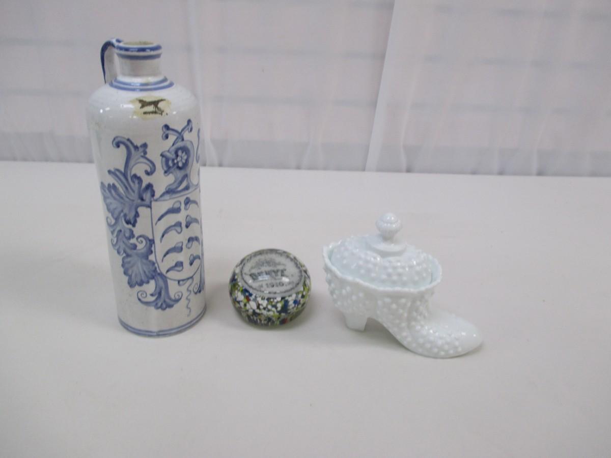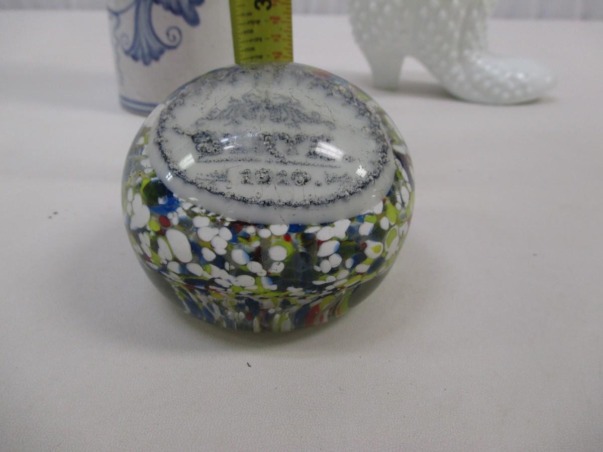 Glass Paperweight Dated 1910 "Beryl" Surface Scratches Hobnail Shoe Stoneware Jug
