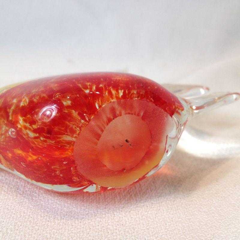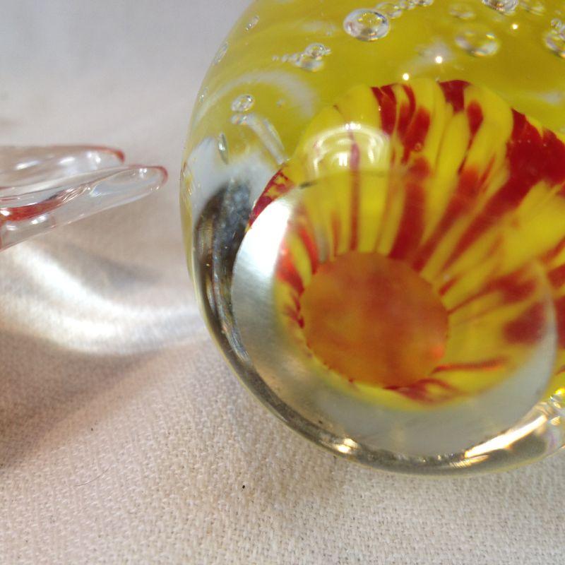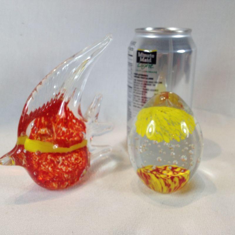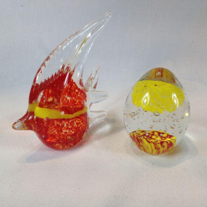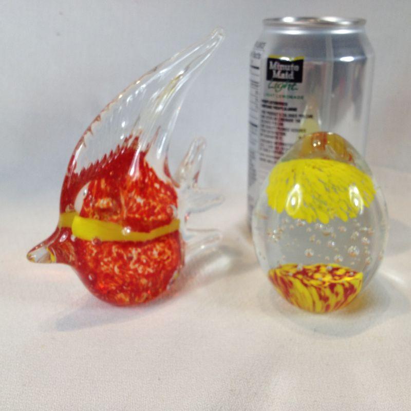 This is a fun pair of yellow and orange paperweights. The egg is 3 1/2-inches tall and the Angle Fish is 4 3/4-inches tall. Both are unsigned and have ground bottoms. They are in very good condition and have wonderful fiery color.
