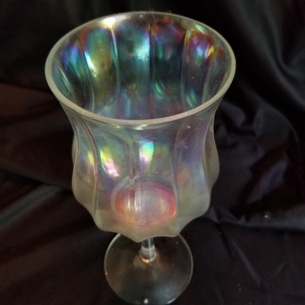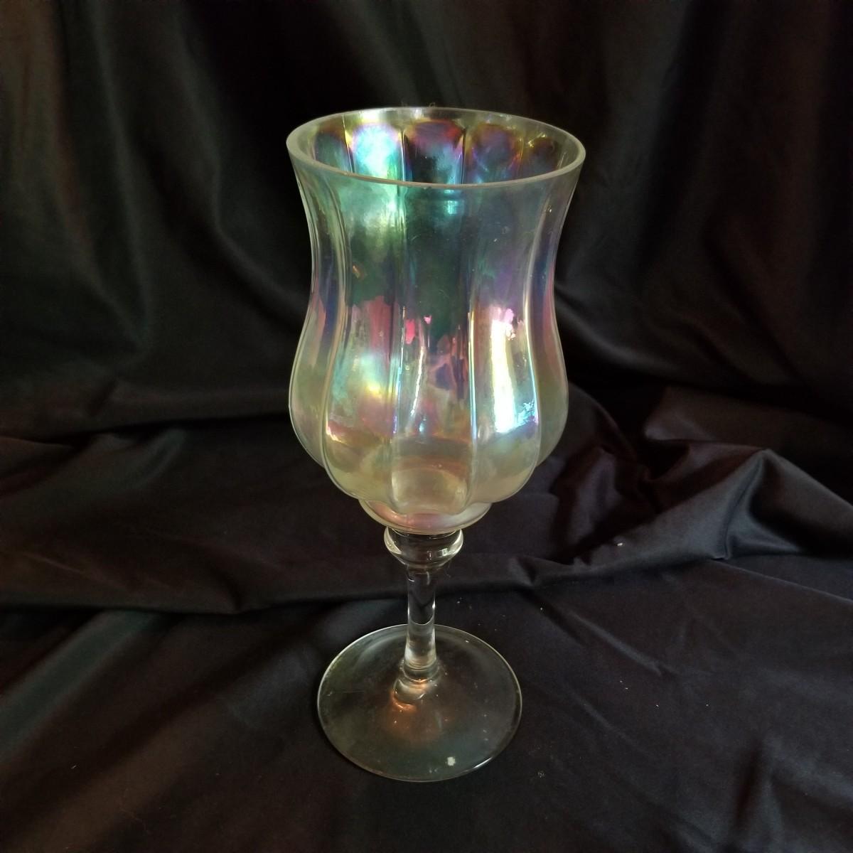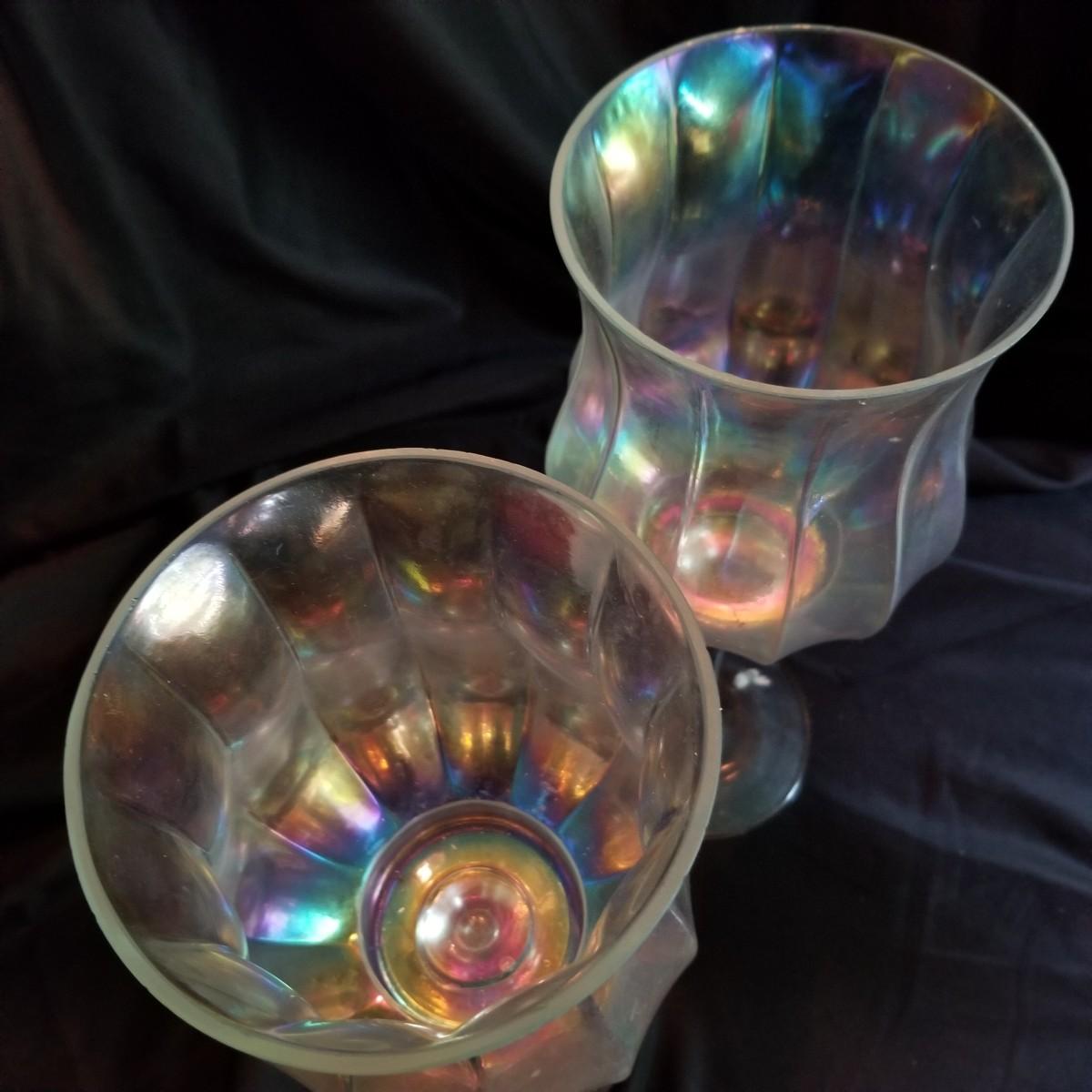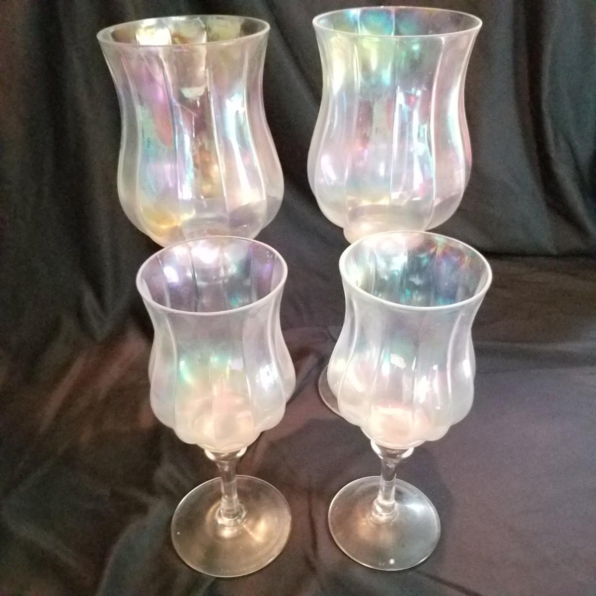 Two pairs of iridescent glass pedestal votive candle holders. Tallest piece is 14" high x 5" diameter. Smaller ones are 9 1/2" x 3 1/2". Small bubbles in places, but no nicks or chips. Shipping available.
