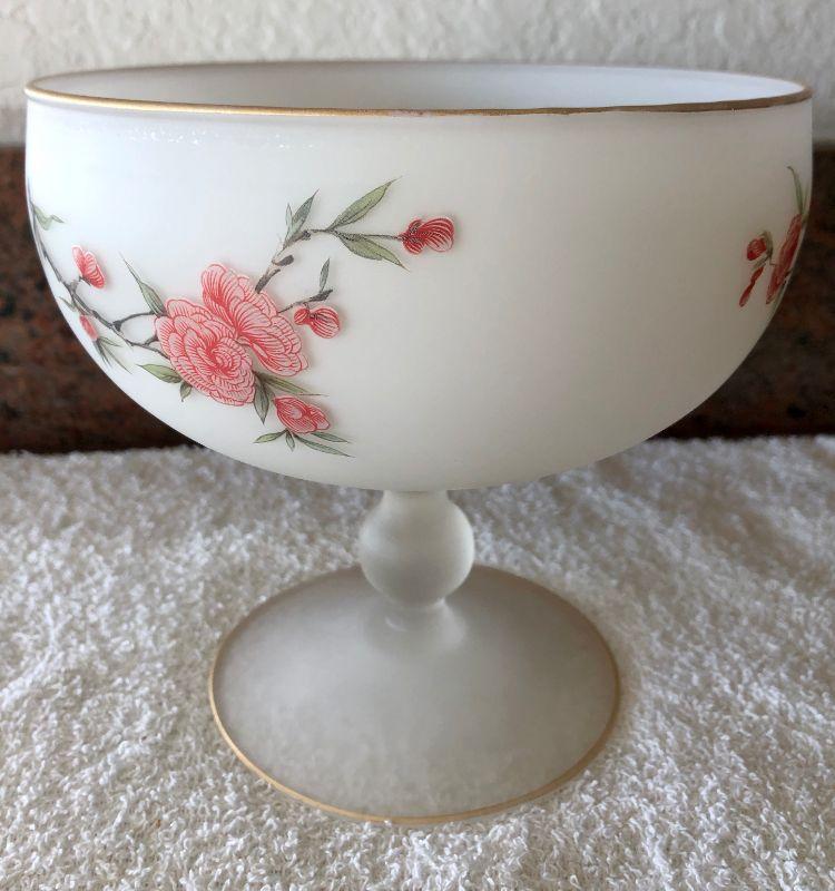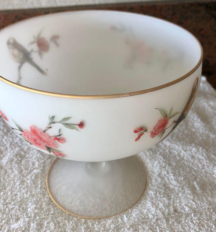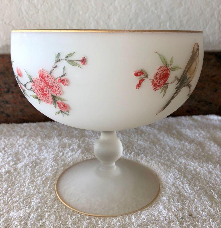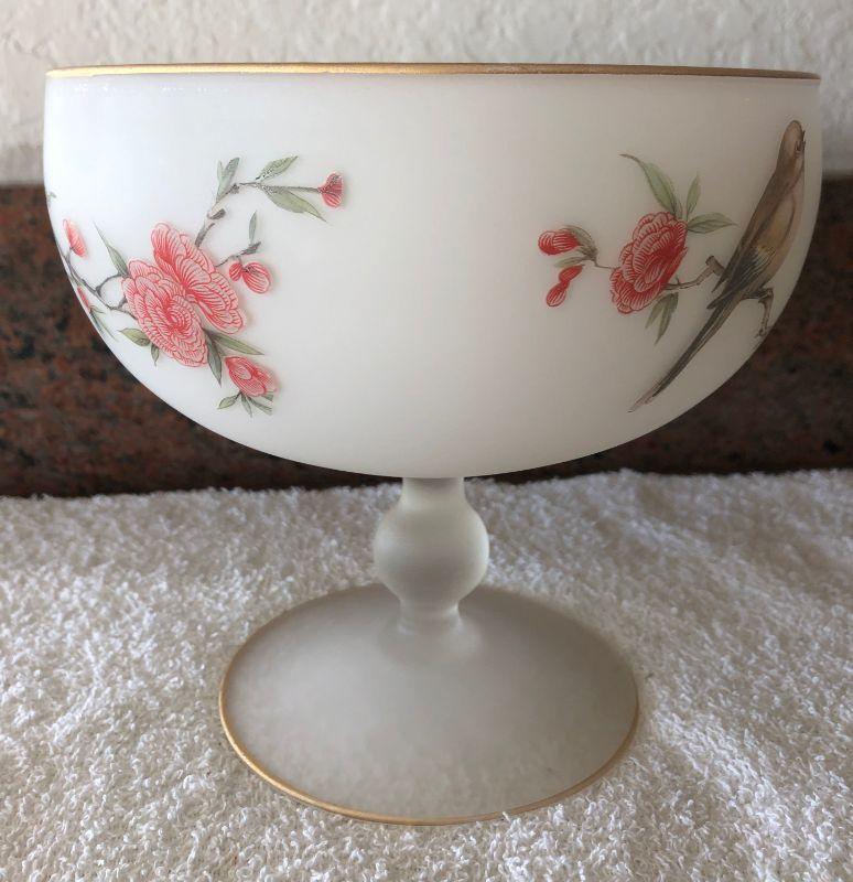 Vintage glass pedestal dish. White frosted glass with a bird and floral painted design. Gold edging. Under 12" size.