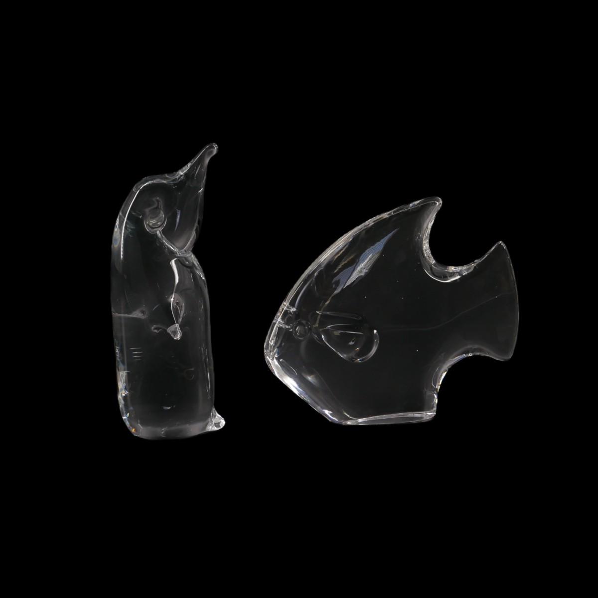 Handmade glass penguin sculpture inscribed with artist's signature and "Sweden" on bottom. Penguin measures W 1.75" x H 5". Fish measures W 4.75" x H 4" and is unsigned. Lot measures 1 lb 10 oz. (D10)
