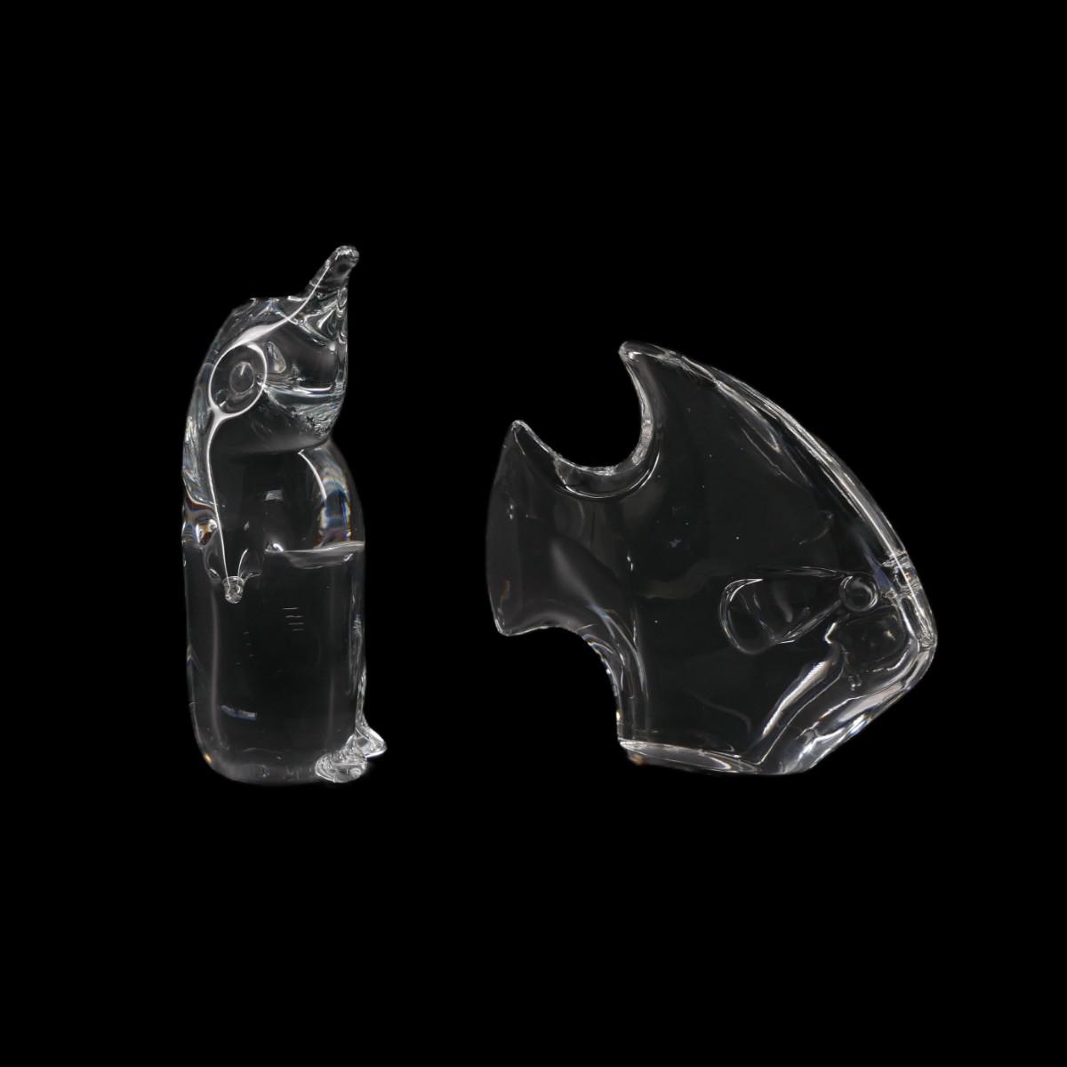 Handmade glass penguin sculpture inscribed with artist's signature and "Sweden" on bottom. Penguin measures W 1.75" x H 5". Fish measures W 4.75" x H 4" and is unsigned. Lot measures 1 lb 10 oz. (D10)