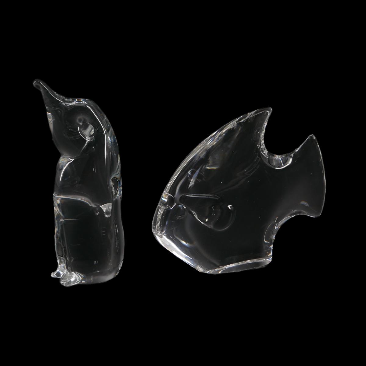 Handmade glass penguin sculpture inscribed with artist's signature and "Sweden" on bottom. Penguin measures W 1.75" x H 5". Fish measures W 4.75" x H 4" and is unsigned. Lot measures 1 lb 10 oz. (D10)