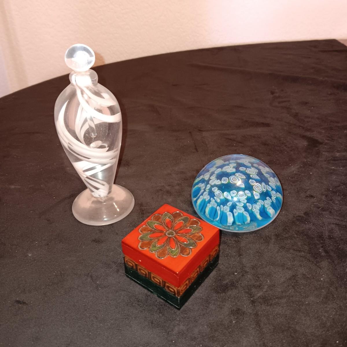 GLASS PERFUME BOTTLE WITH STOPPER, GLASS PAPERWEIGHT AND TRINKET BOX