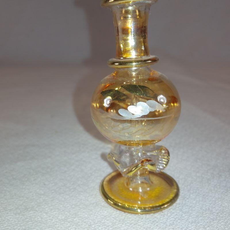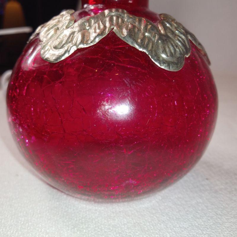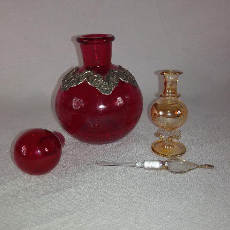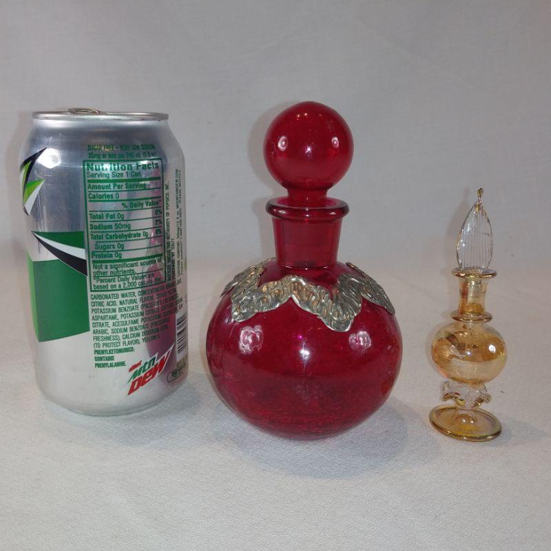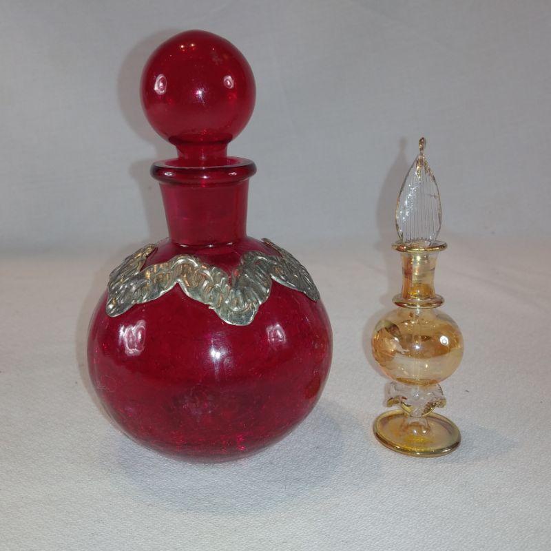Two very nice perfume bottles - both made in India. The red bottle is crackle glass with a punched metal collar accent. It stands 5-1/4-inches tall. The smaller bottle is amber-colored and clear blown glass. It stands 4-inches tall and is adorned with etching. Both are in very good condition and appear to be new. No cracks or chips.
