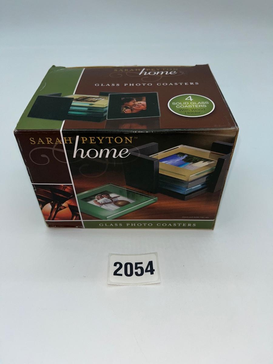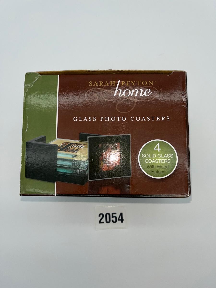 Sarah Peyton Home brand set of 4 glass photo coasters with wooden back. In box.