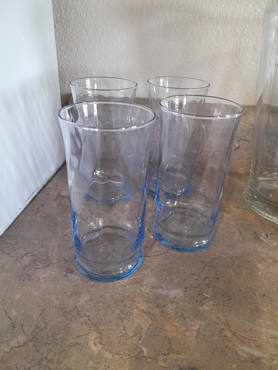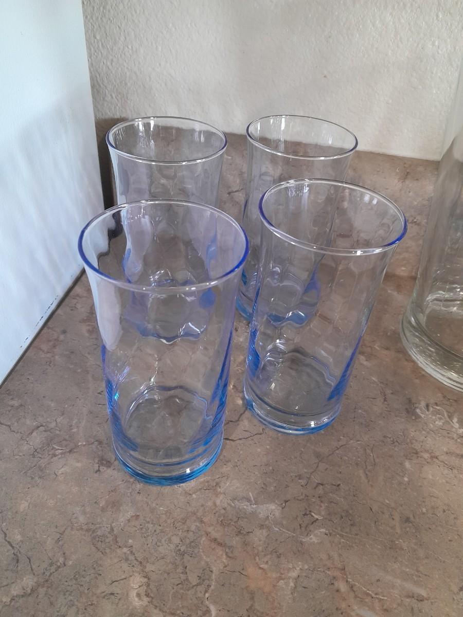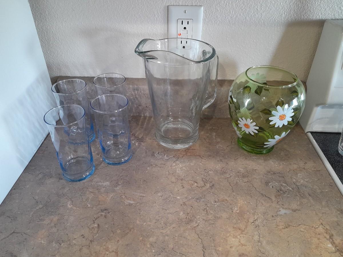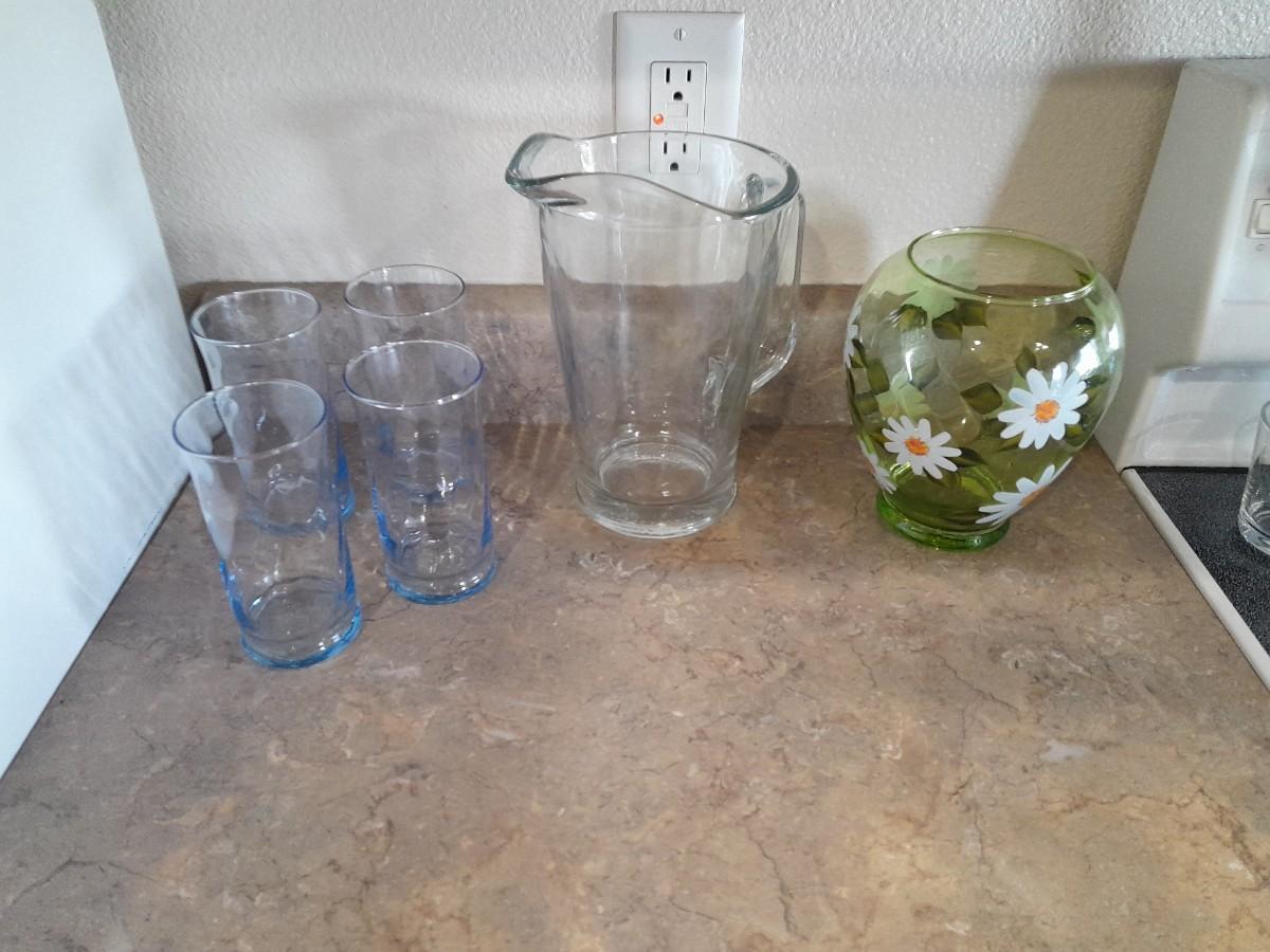 GLASS PITCHER, 4 TALL DRINKING GLASSES AND A PAINTED GLASS VASE