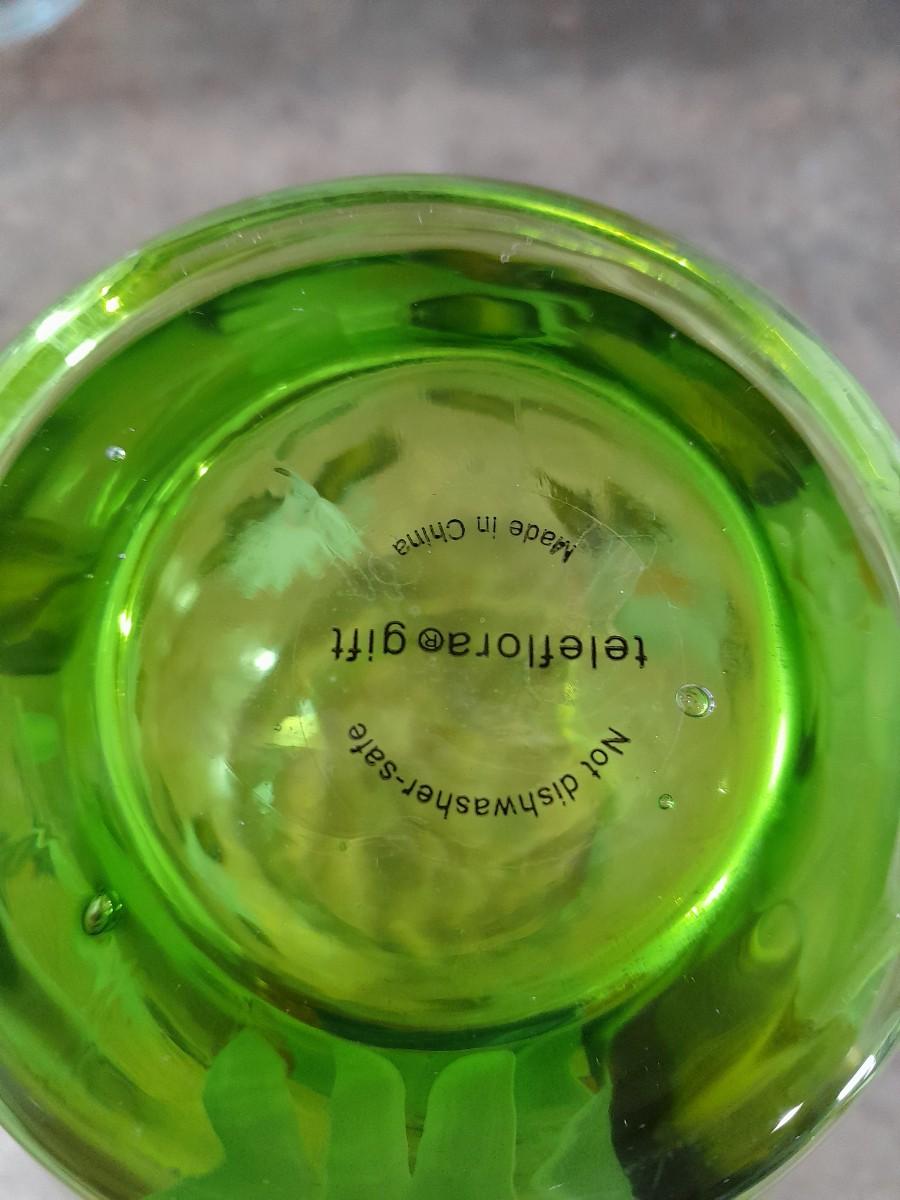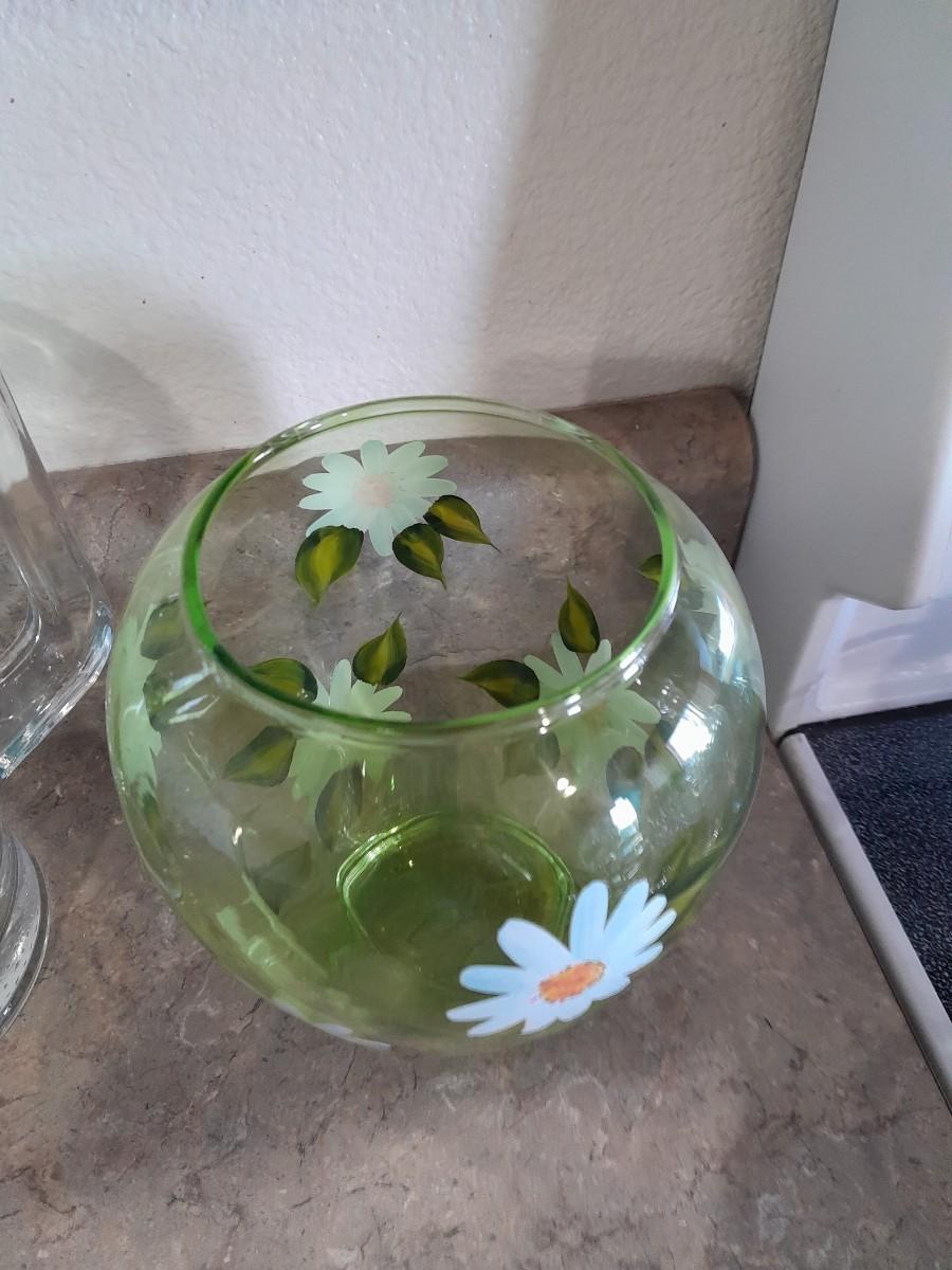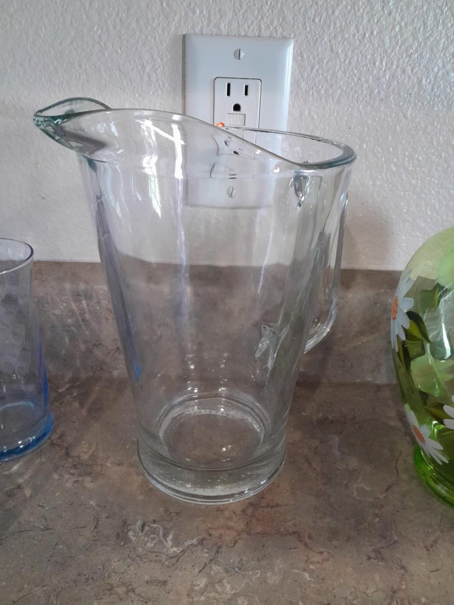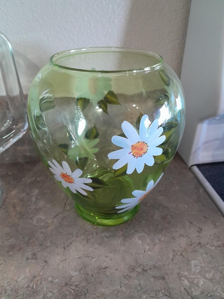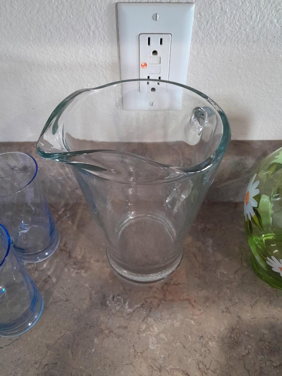 GLASS PITCHER, 4 TALL DRINKING GLASSES AND A PAINTED GLASS VASE