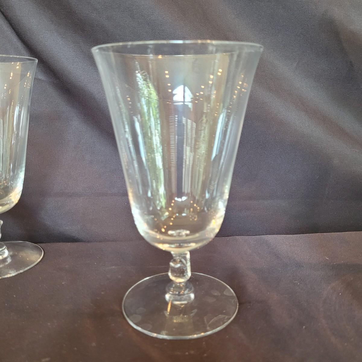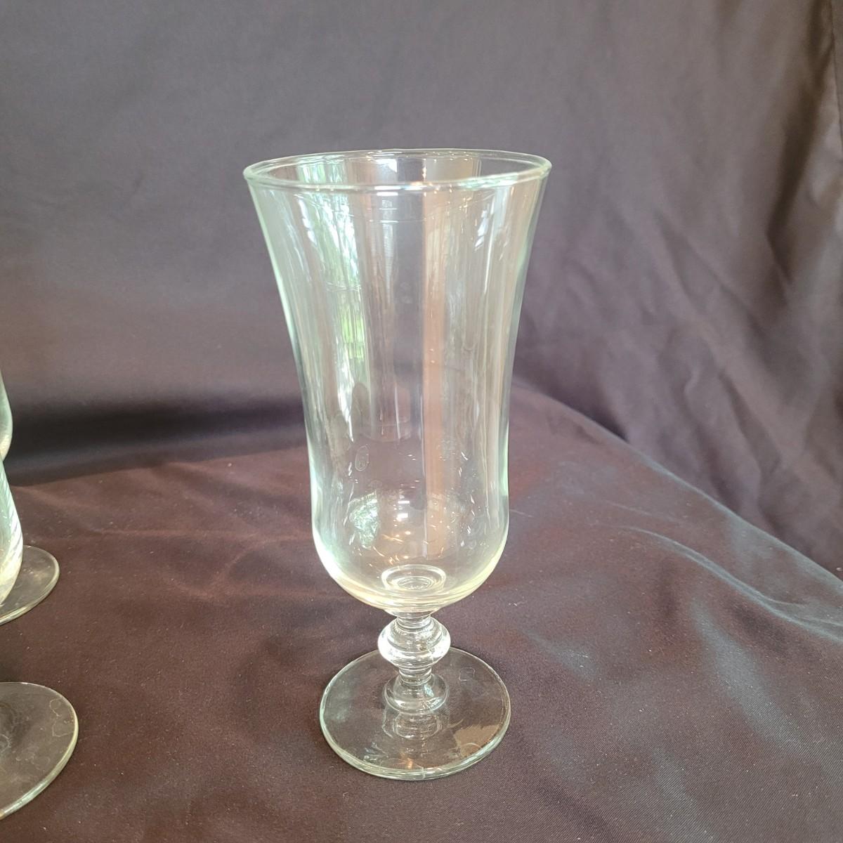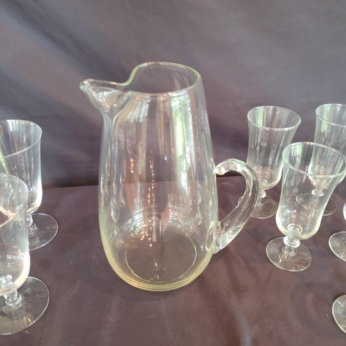Tall glass pitcher with seven wide goblet style glasses and eight narrow glasses. Pitcher measures approximately 6”DIA x 10.5”H. Shipping available.