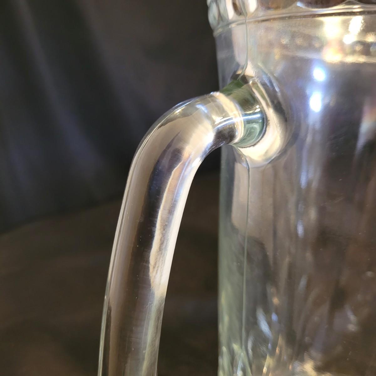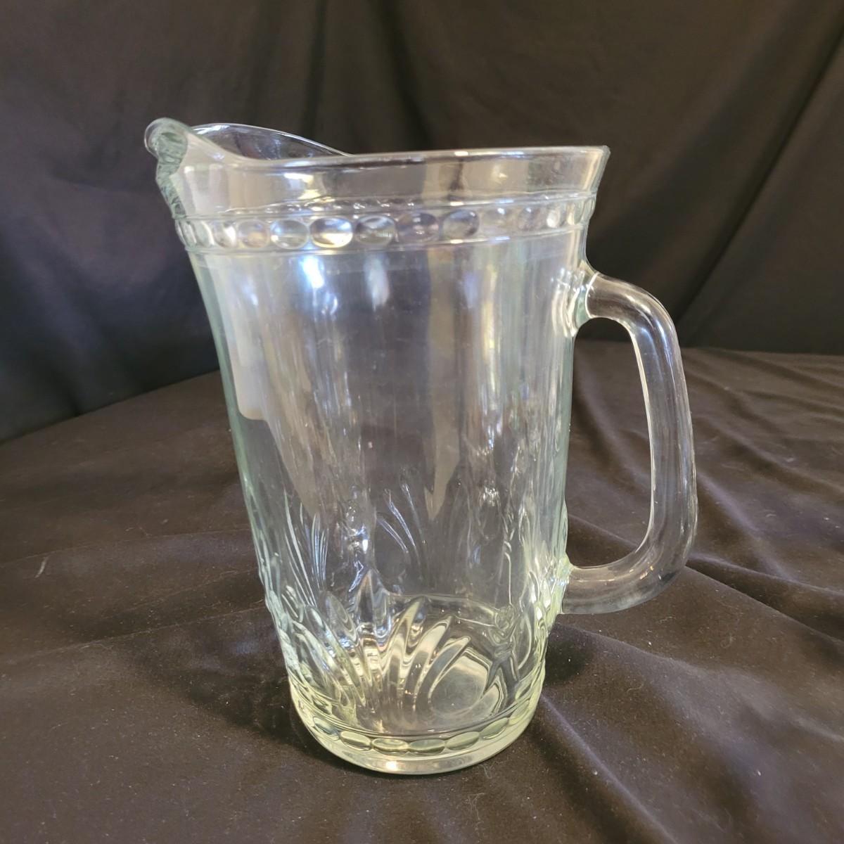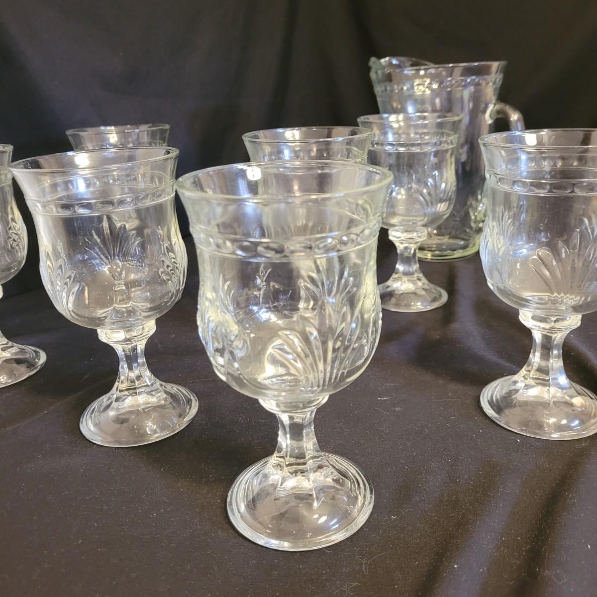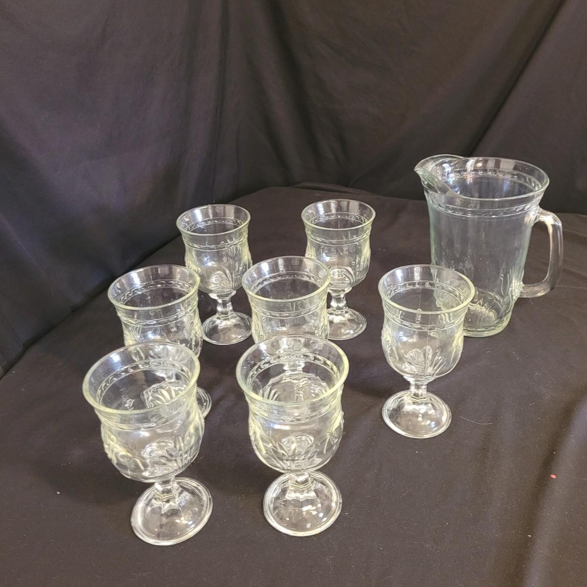 Large pressed glass pitcher and seven goblets with relief work at base and top. In good condition, in need of light cleaning. Pitcher measures approximately 6.5"D at top x 9.5"H. Shipping available. Shipping can be costly. We suggest calling our local UPS with dimensions and getting an estimate before bidding: (828) 252-6930.