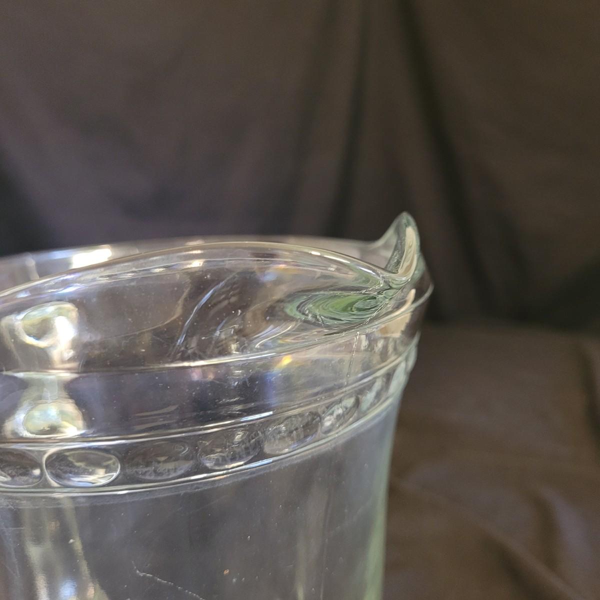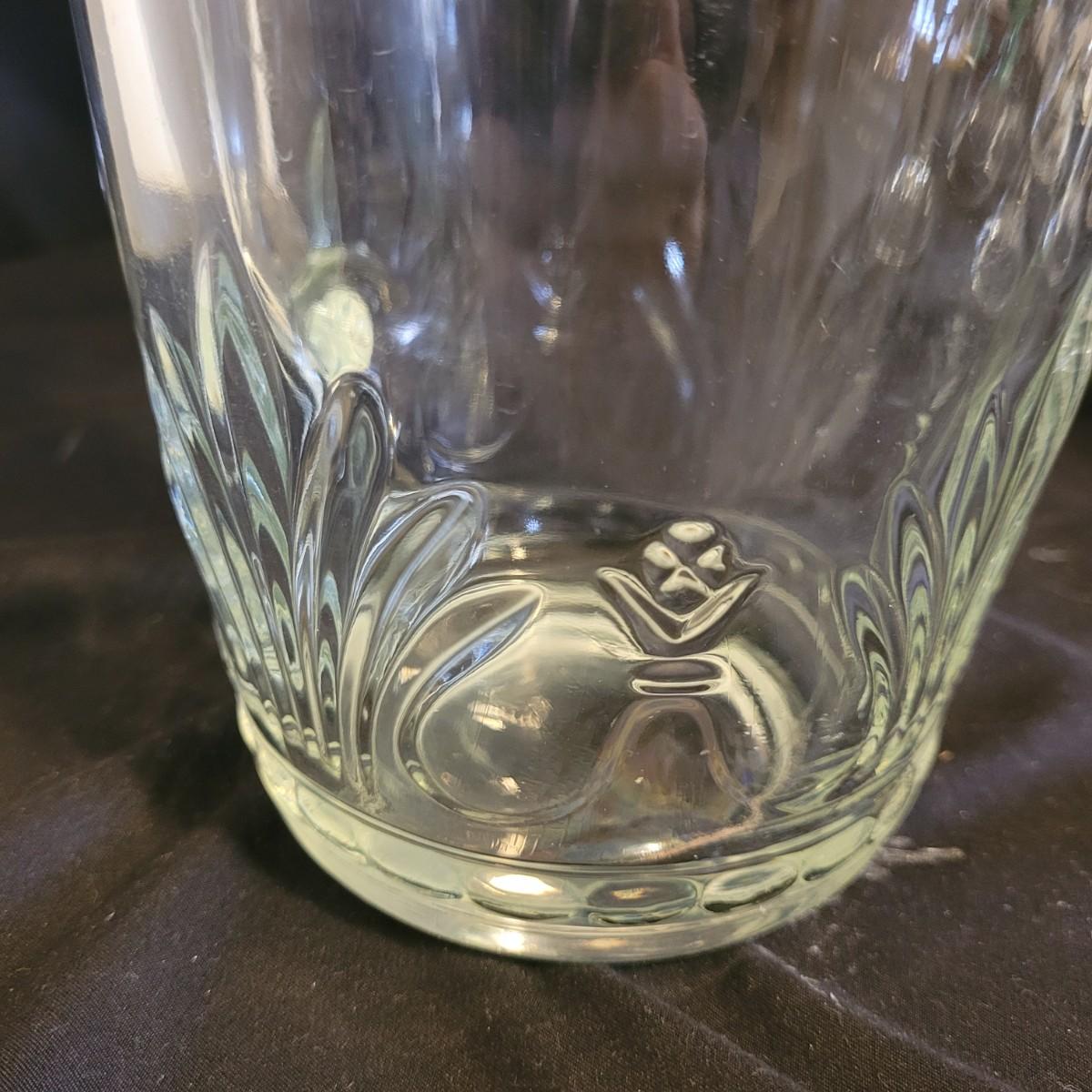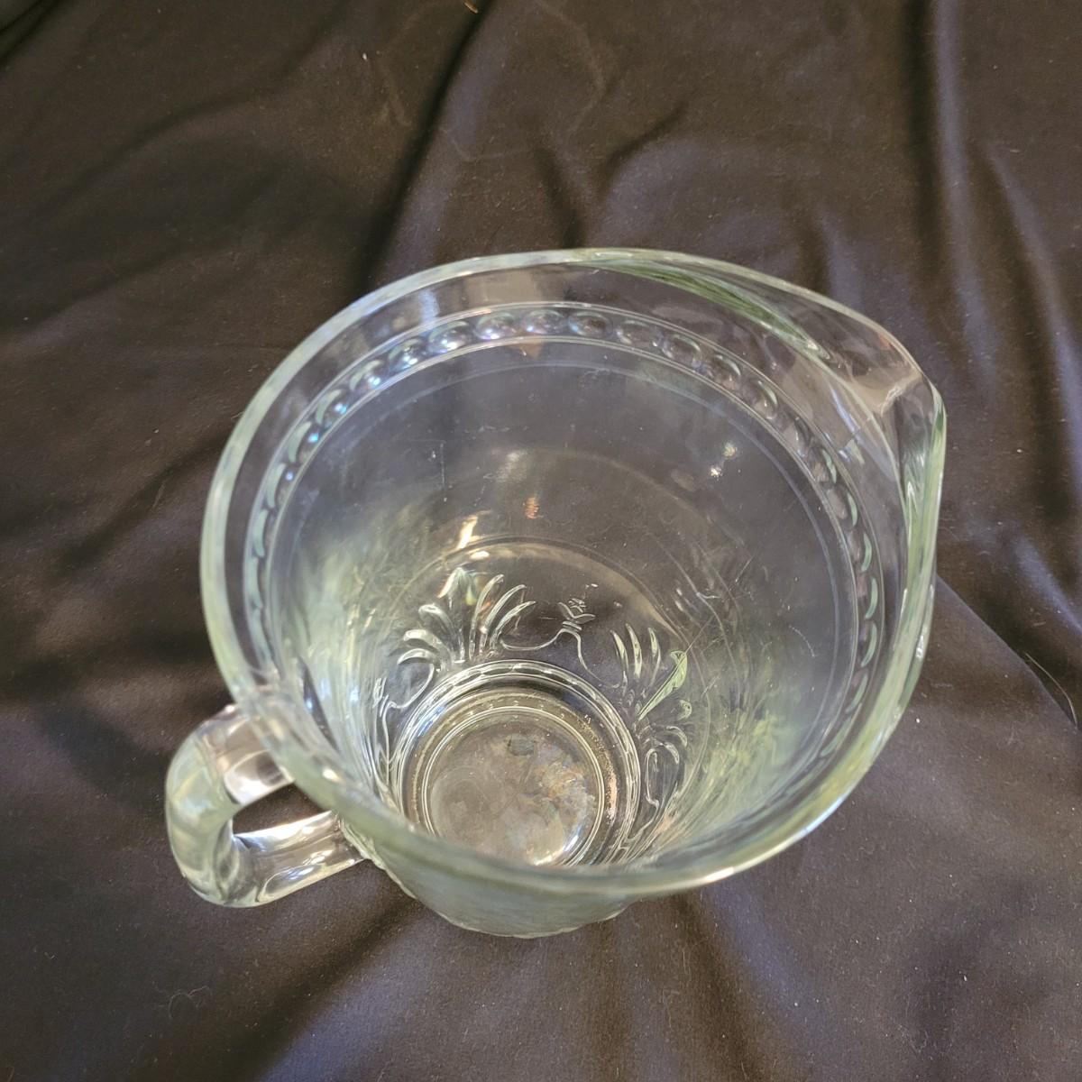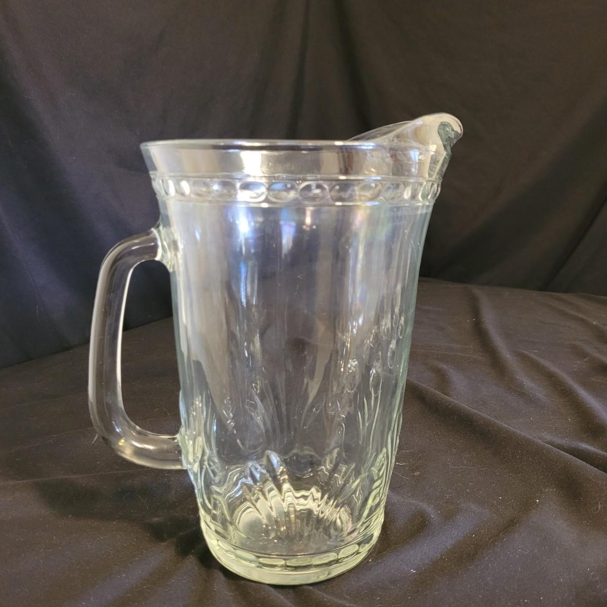 Large pressed glass pitcher and seven goblets with relief work at base and top. In good condition, in need of light cleaning. Pitcher measures approximately 6.5"D at top x 9.5"H. Shipping available. Shipping can be costly. We suggest calling our local UPS with dimensions and getting an estimate before bidding: (828) 252-6930.