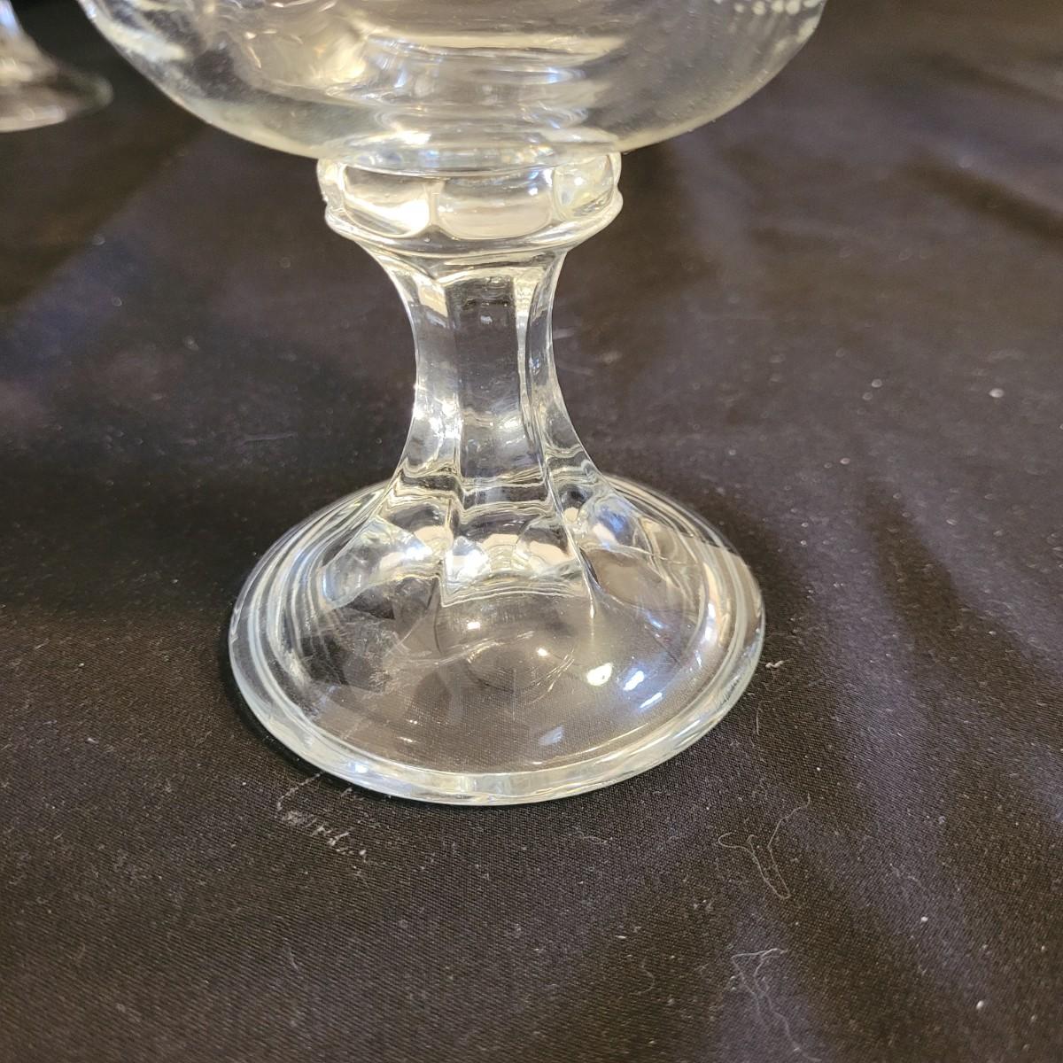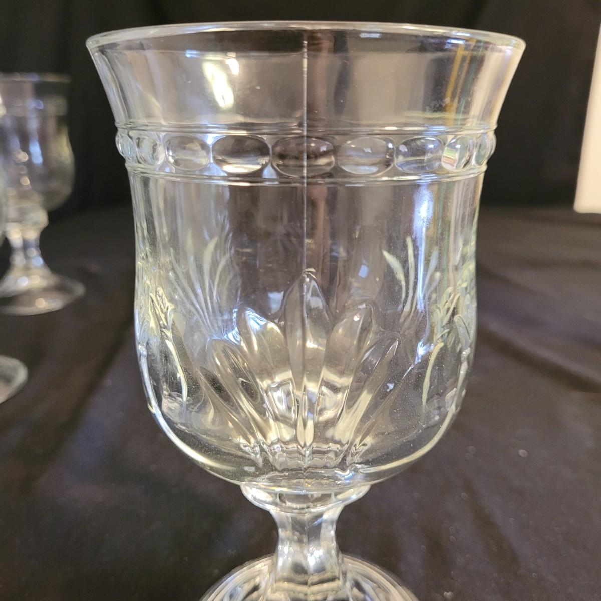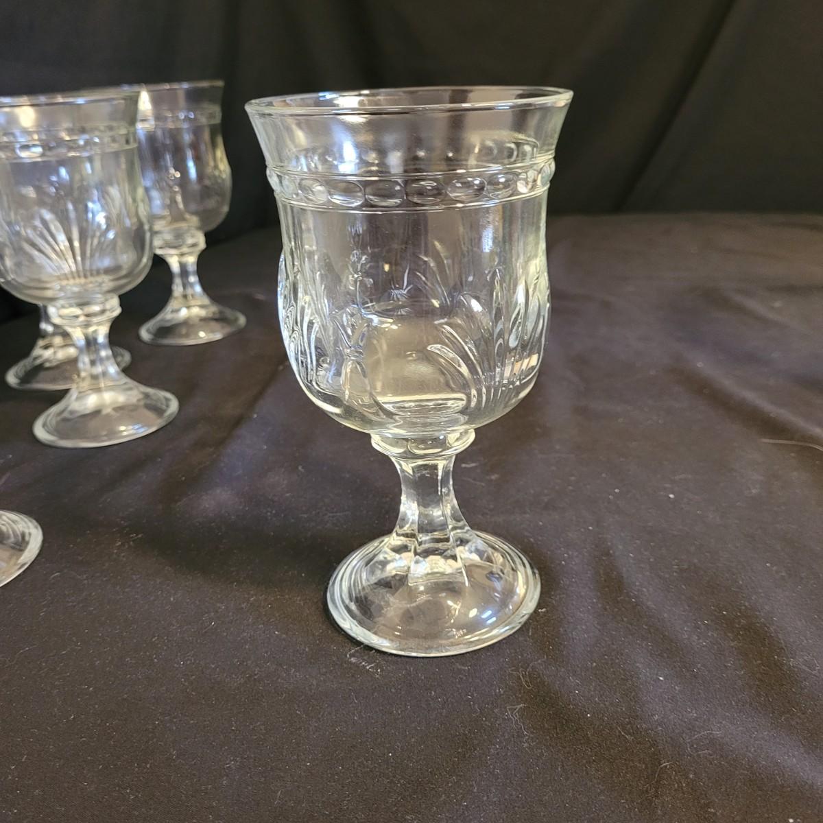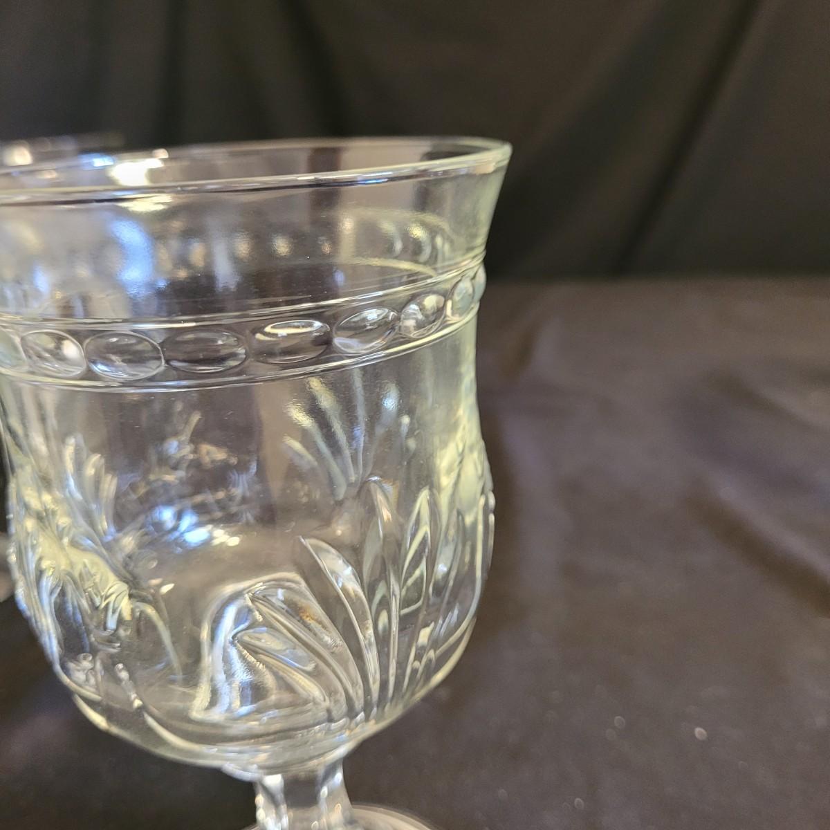 Large pressed glass pitcher and seven goblets with relief work at base and top. In good condition, in need of light cleaning. Pitcher measures approximately 6.5"D at top x 9.5"H. Shipping available. Shipping can be costly. We suggest calling our local UPS with dimensions and getting an estimate before bidding: (828) 252-6930.
