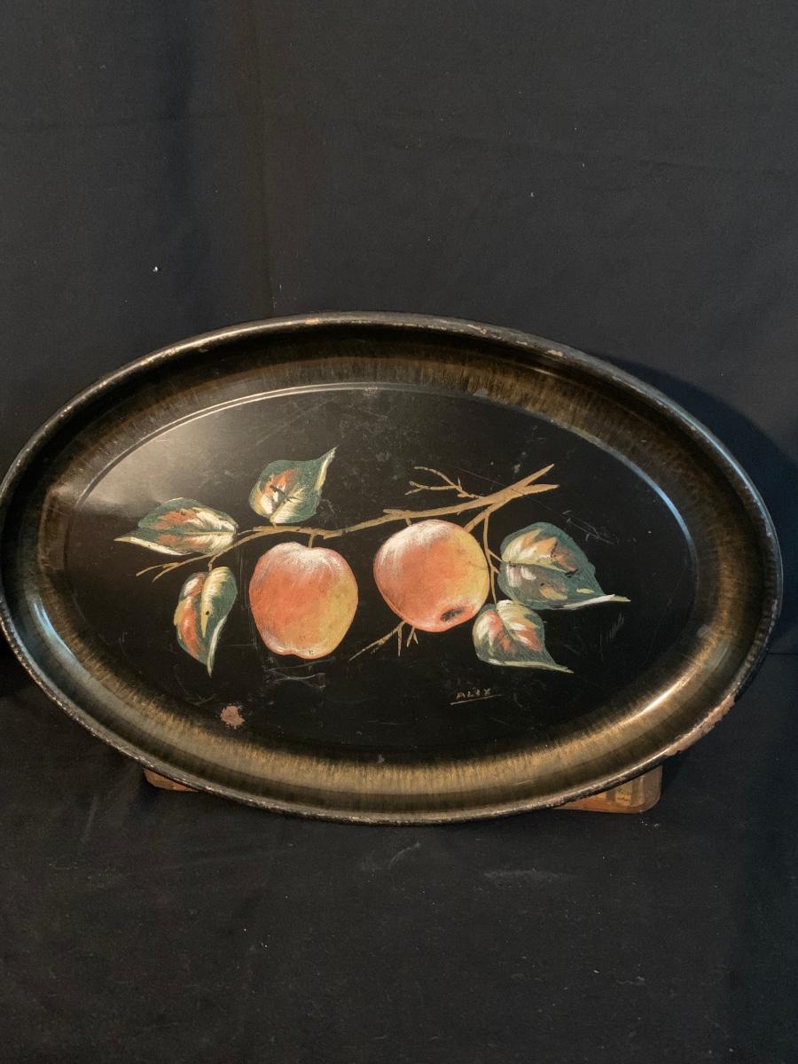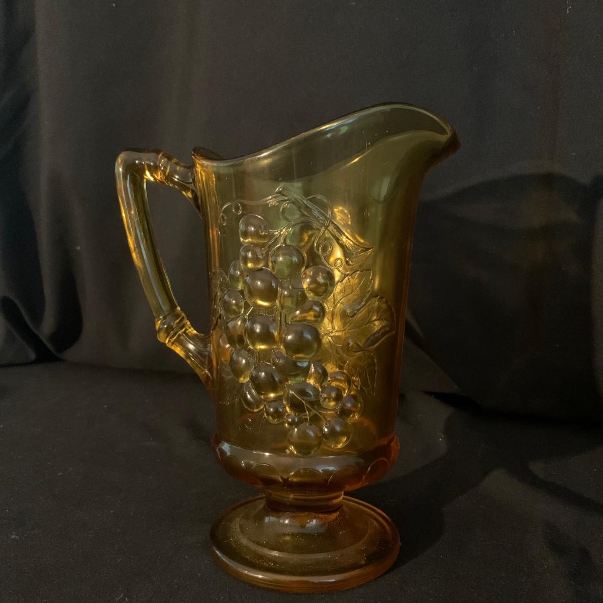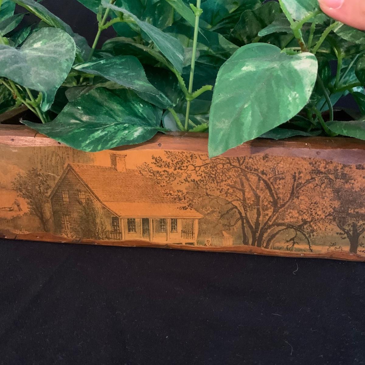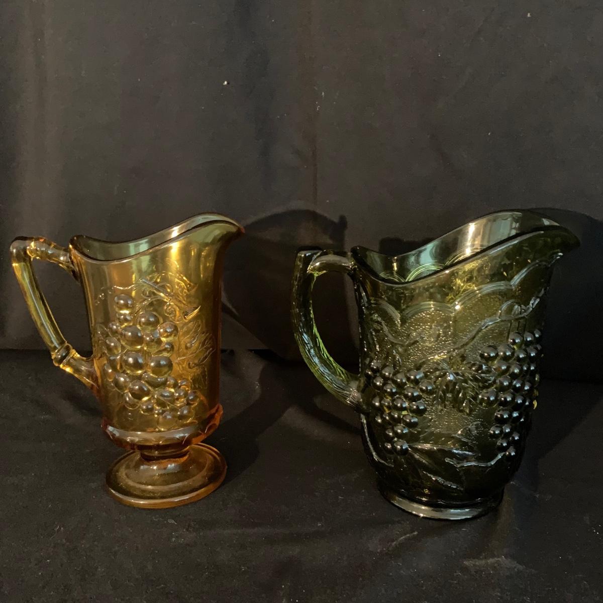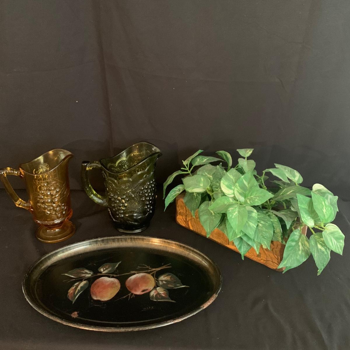 This lot includes two decorated glass pitchers, one metal tray, and one wooden plant holder. The wooden holder has a removable artificial plant inside. The metal platter has a hand-painted design and is made of a lightweight metal. The largest pitcher measures about 8.5" x 8". The wooden plant holder measures about 12" x 5.5". Shipping available.
