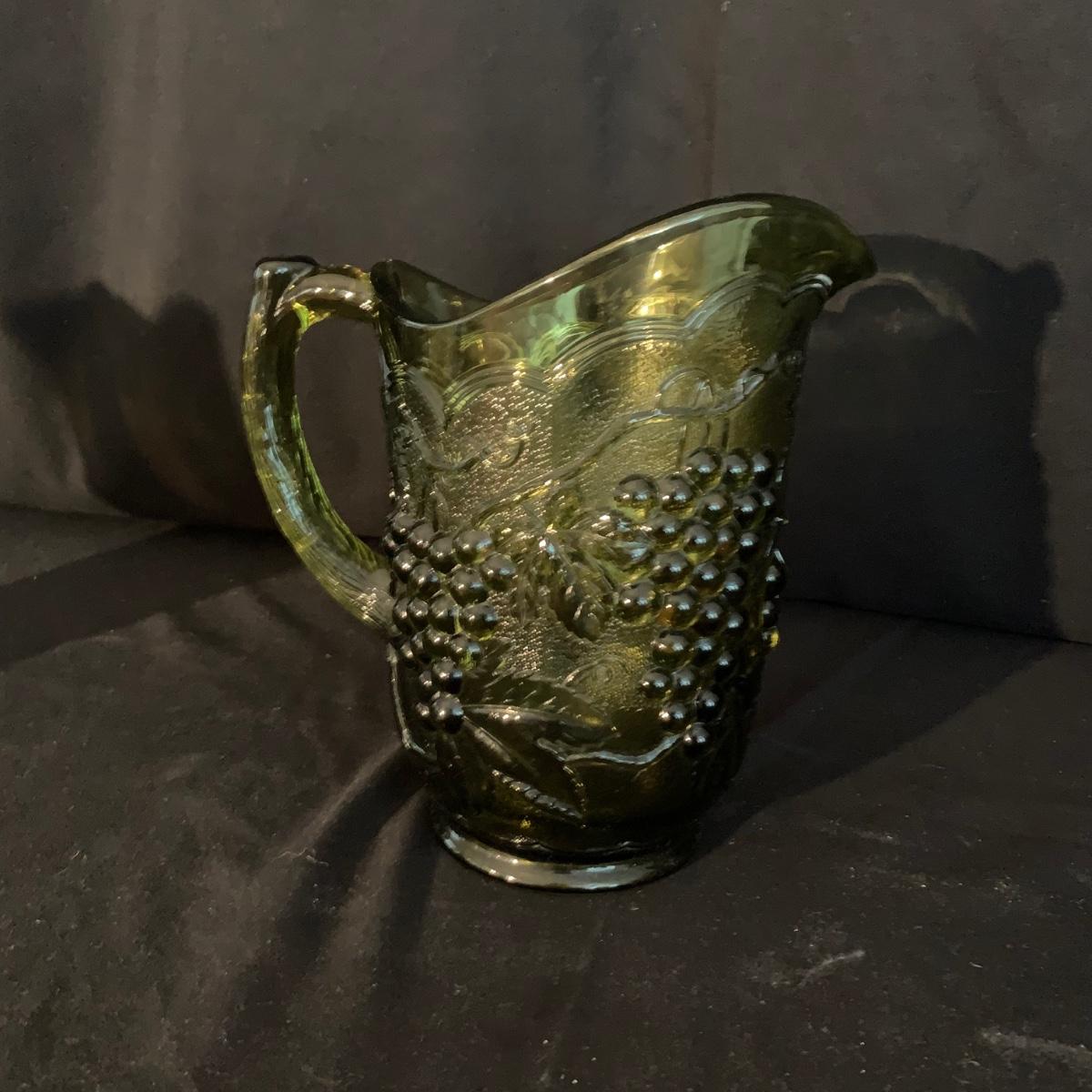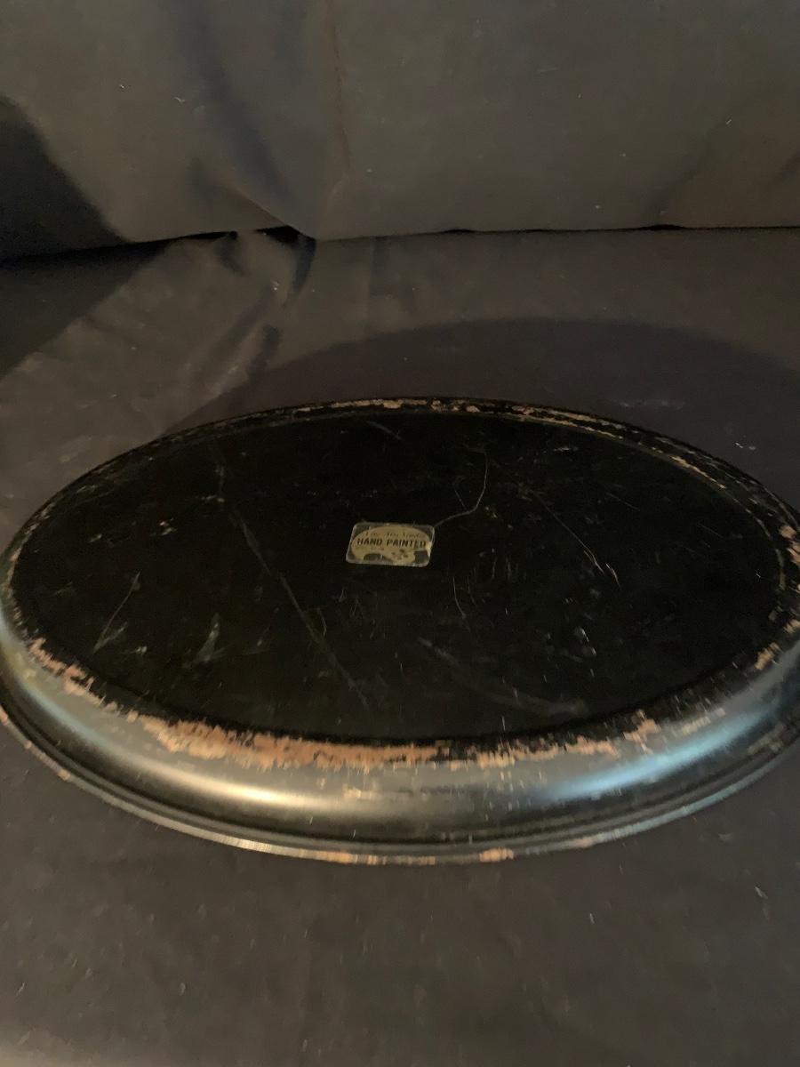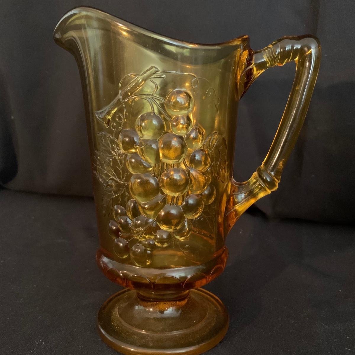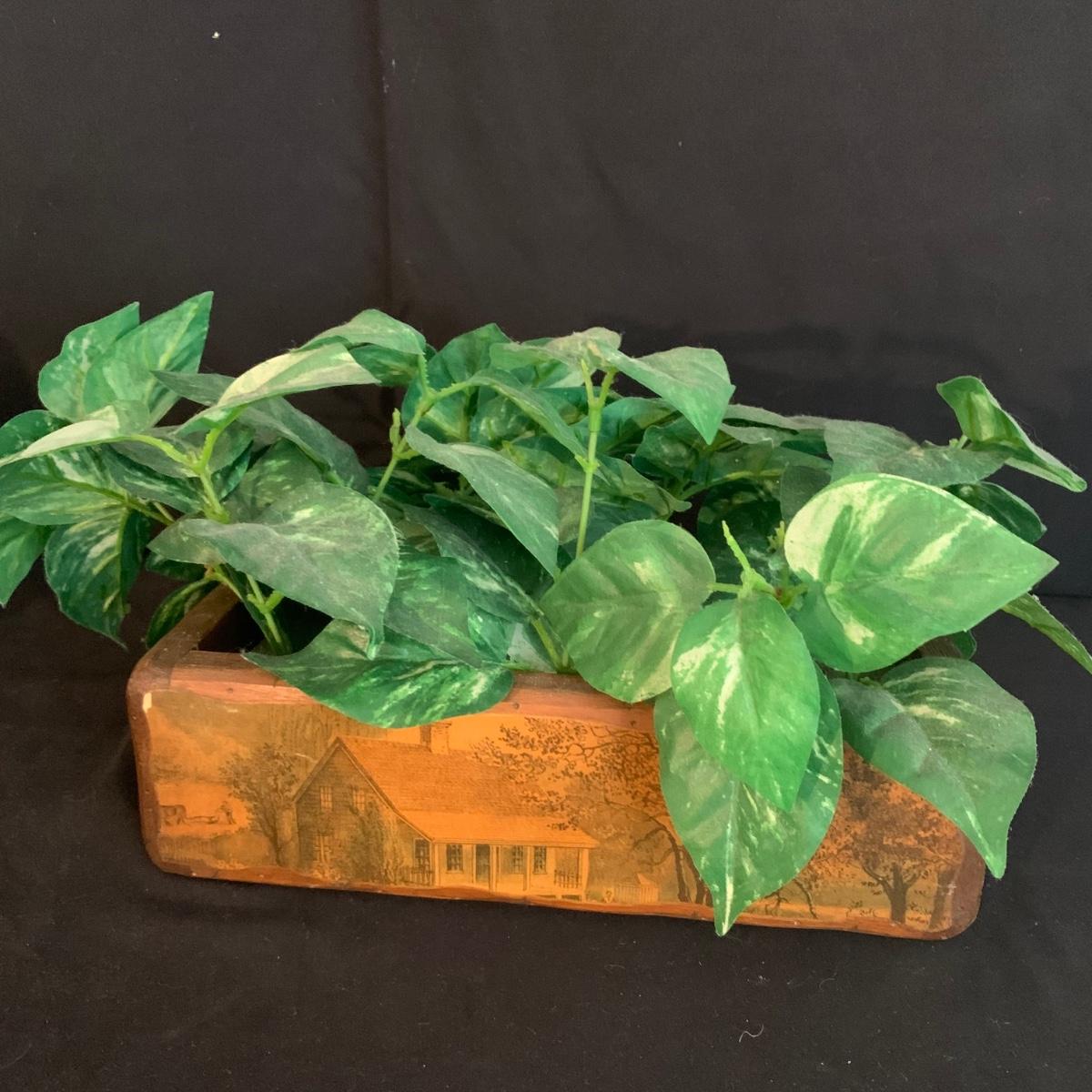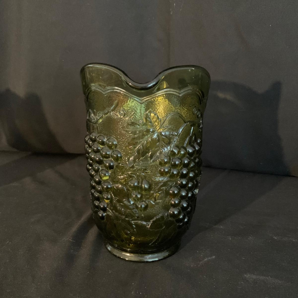 This lot includes two decorated glass pitchers, one metal tray, and one wooden plant holder. The wooden holder has a removable artificial plant inside. The metal platter has a hand-painted design and is made of a lightweight metal. The largest pitcher measures about 8.5" x 8". The wooden plant holder measures about 12" x 5.5". Shipping available.