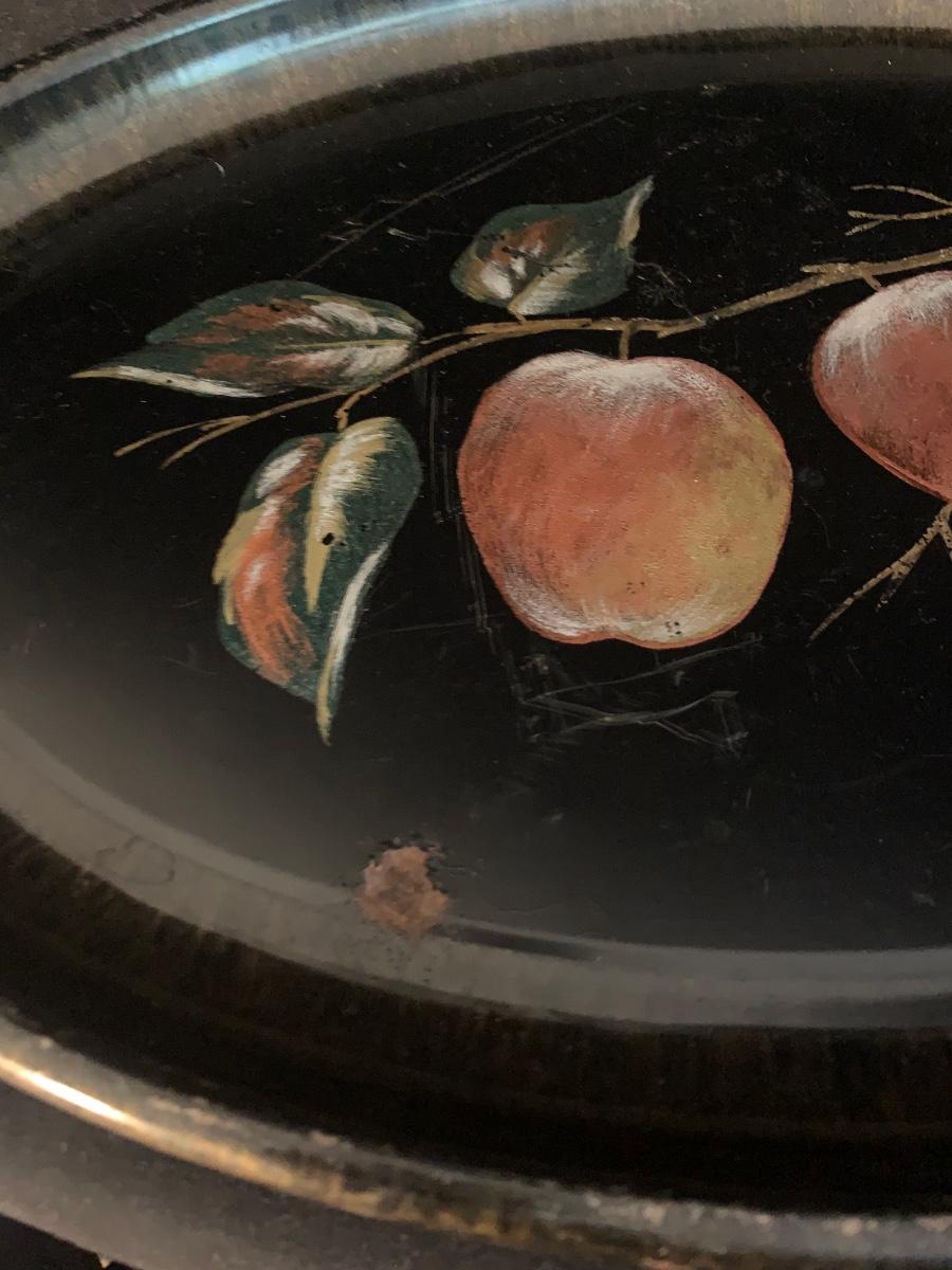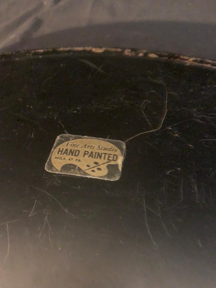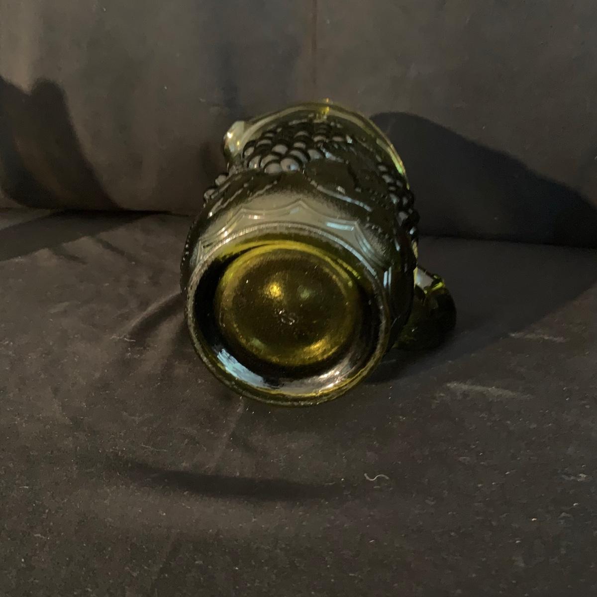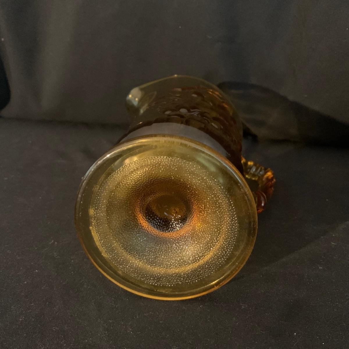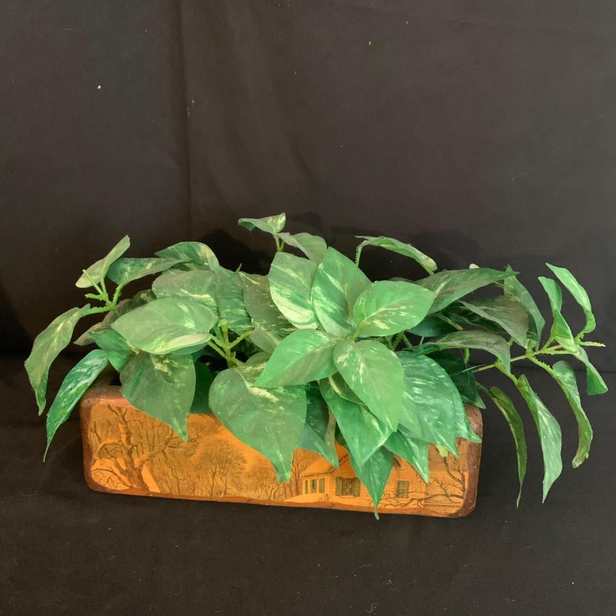 This lot includes two decorated glass pitchers, one metal tray, and one wooden plant holder. The wooden holder has a removable artificial plant inside. The metal platter has a hand-painted design and is made of a lightweight metal. The largest pitcher measures about 8.5" x 8". The wooden plant holder measures about 12" x 5.5". Shipping available.