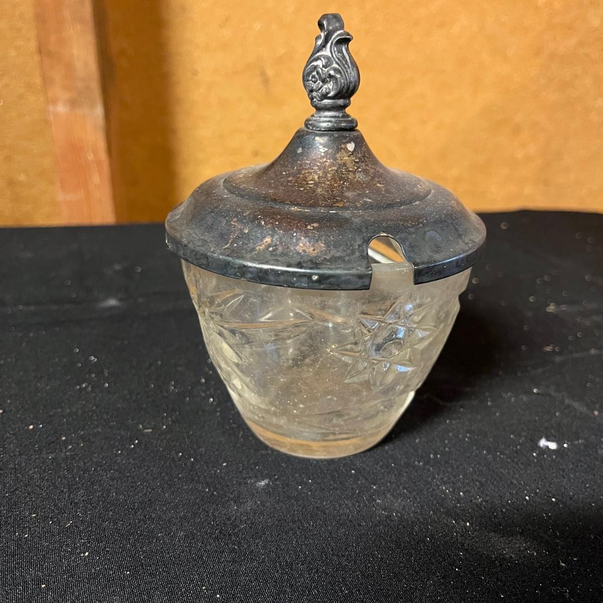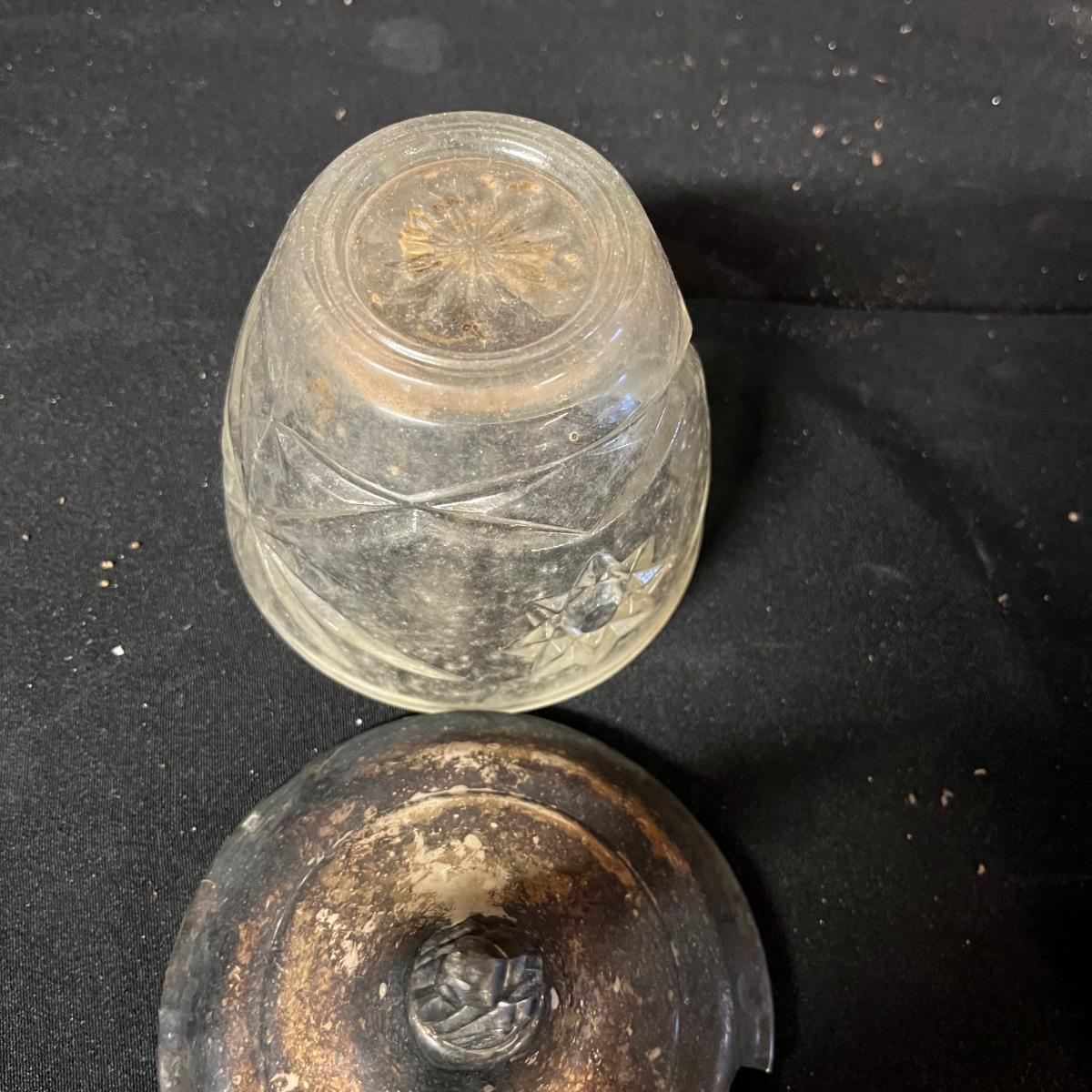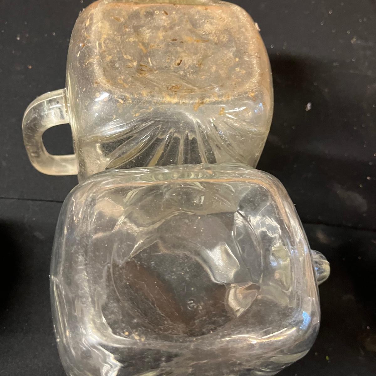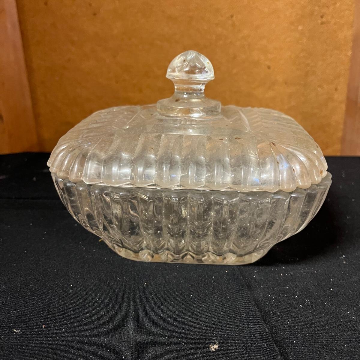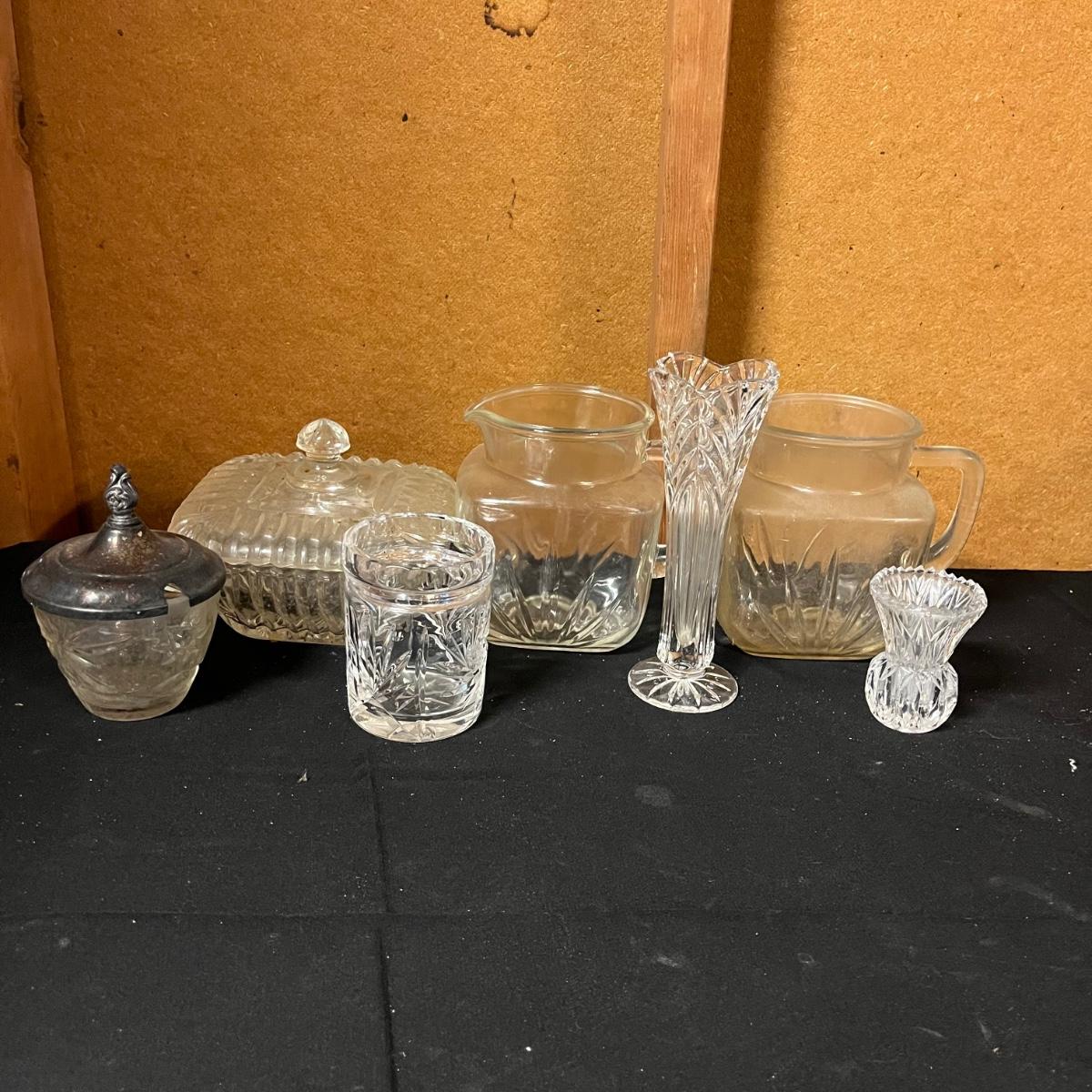 Lot includes a pair of glass pitchers, glass bowl with lid, toothpick holder, vase, jar with metal lid and more. Pitchers measure 4” x 6” x 6”.