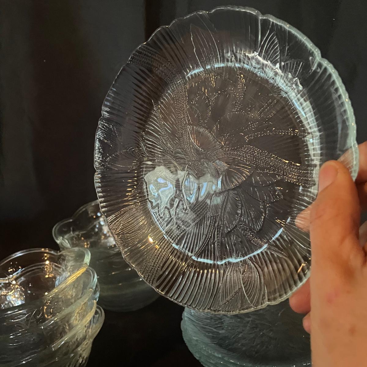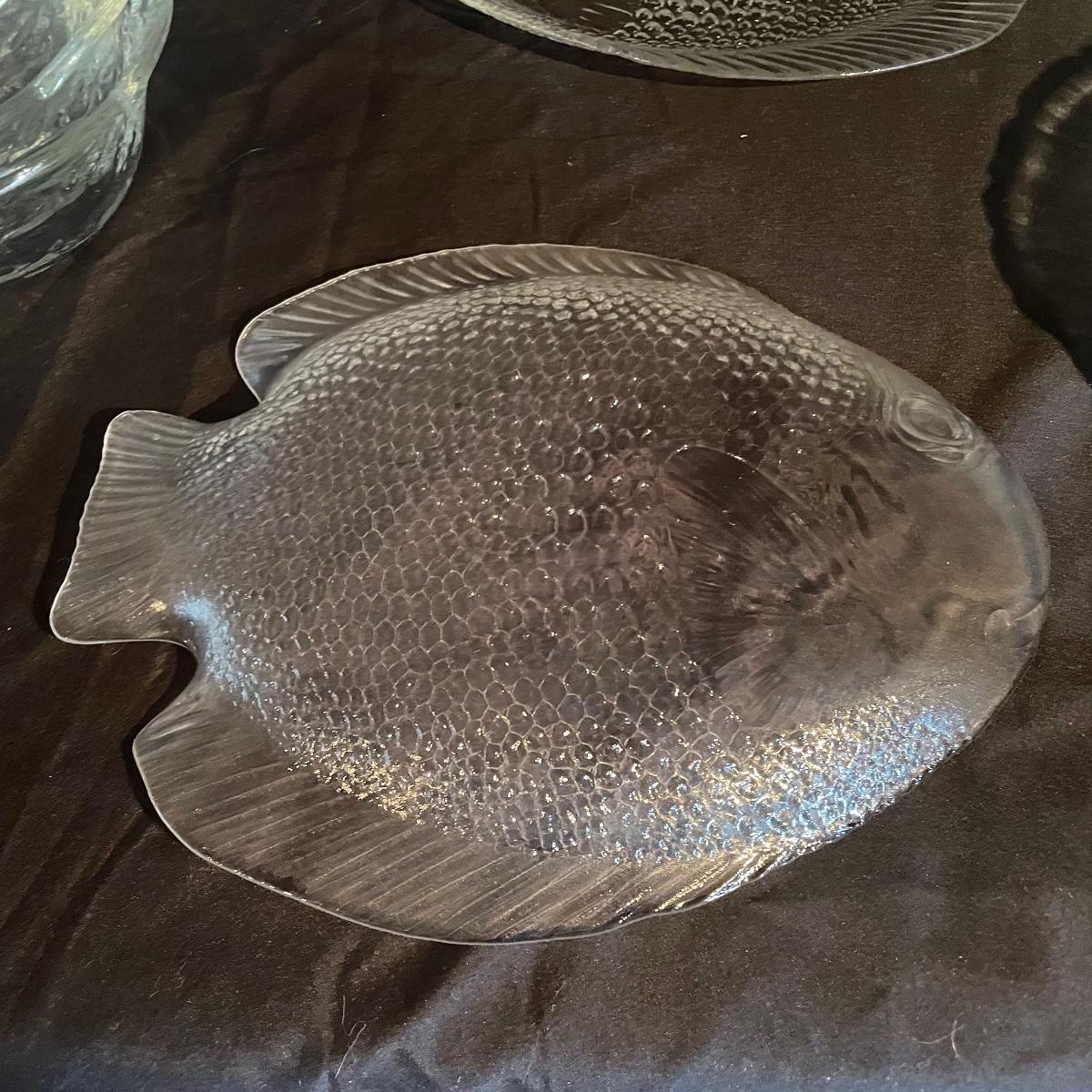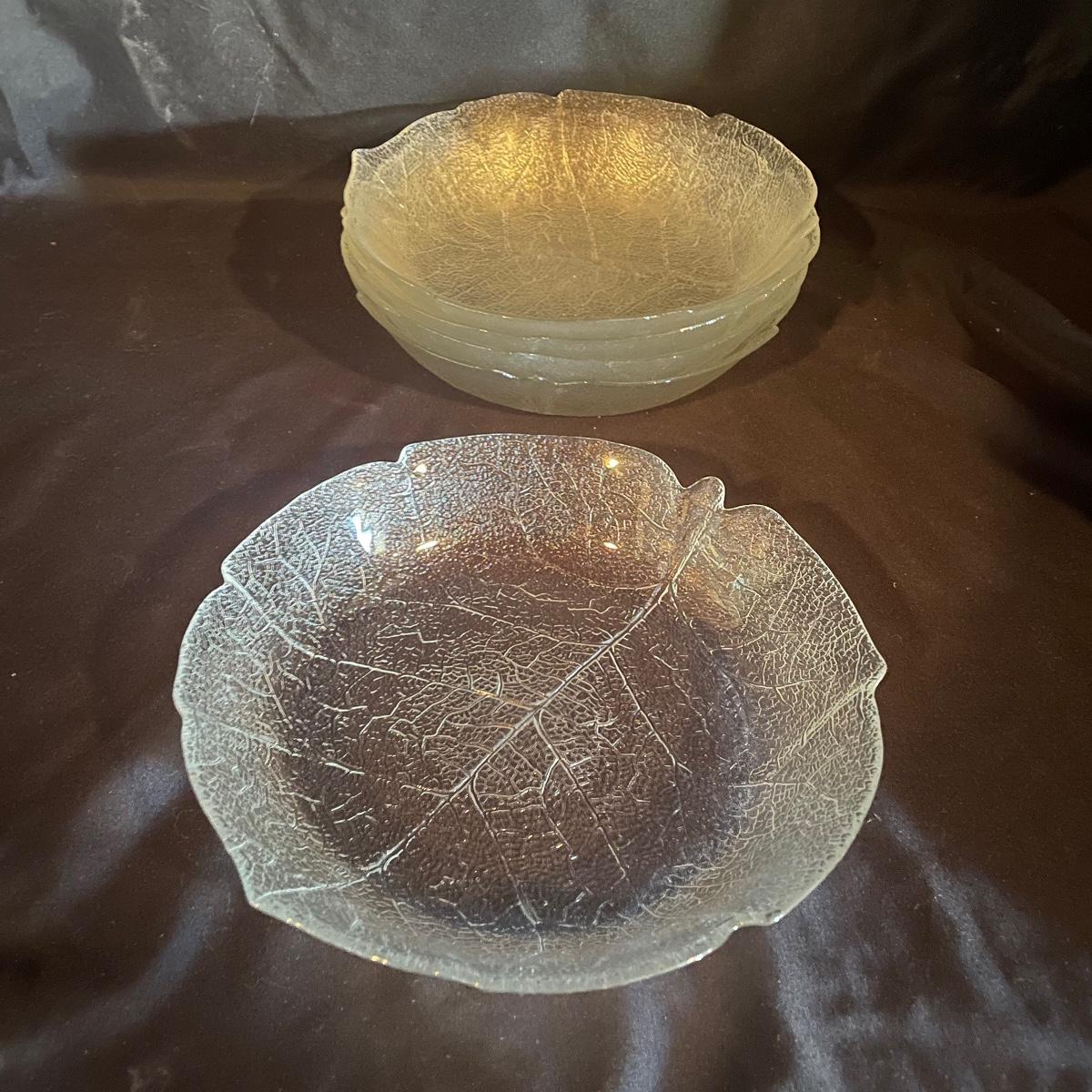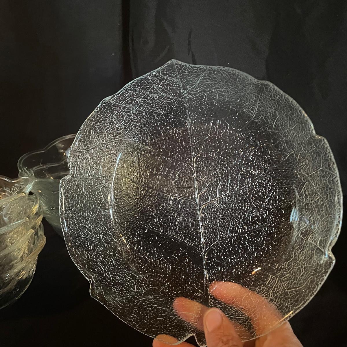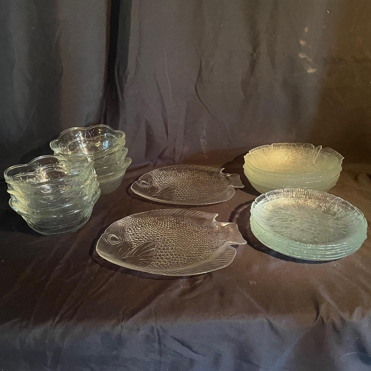 Two fish shaped platters, eight bowls with a floral and fruit motif, five leaf like bowls, and six floral plates make up this assortment of glass dinnerware.