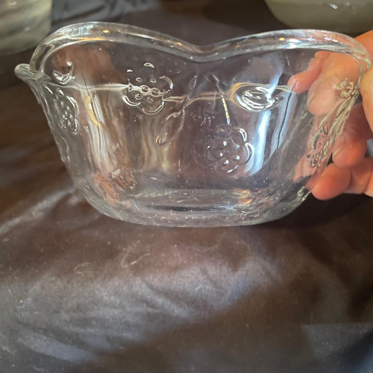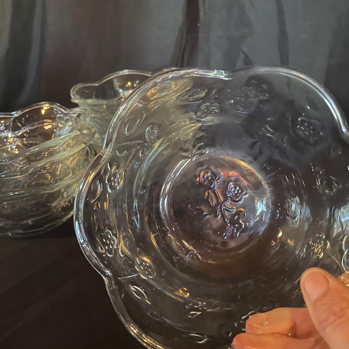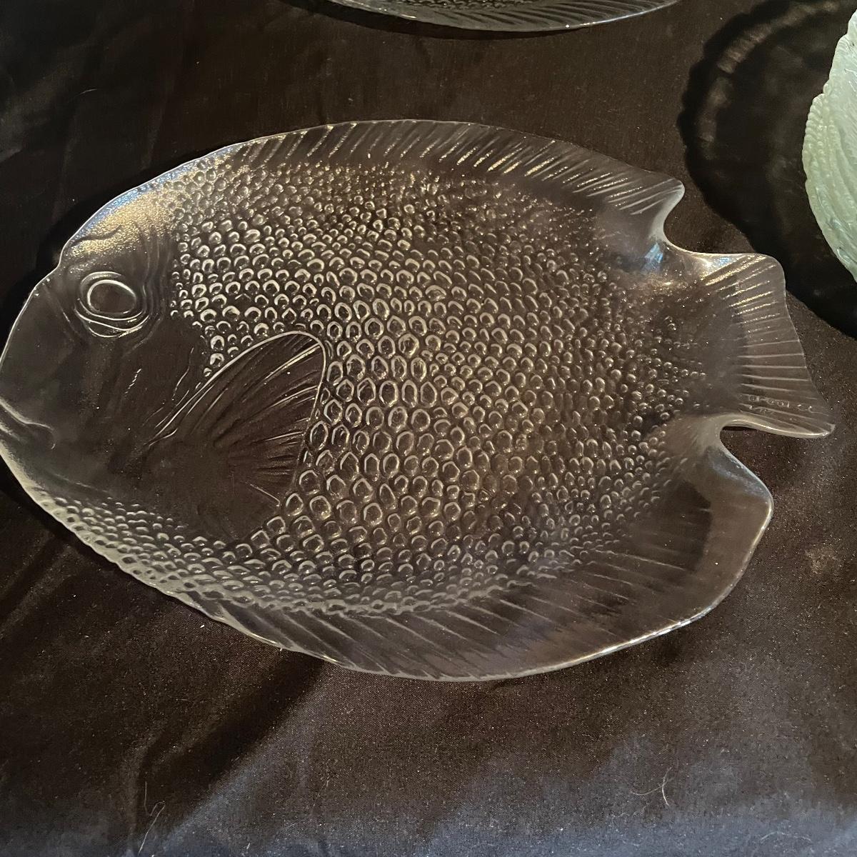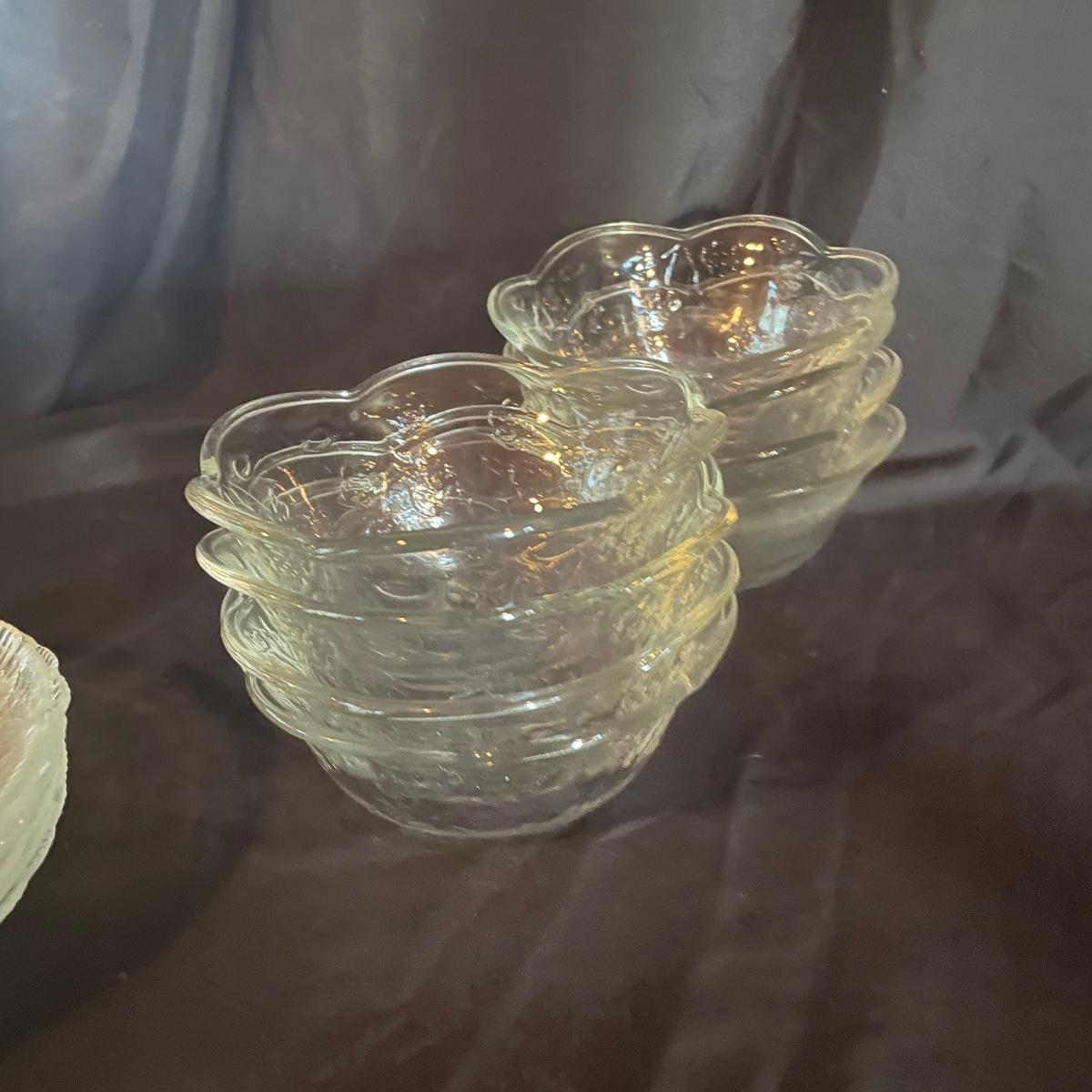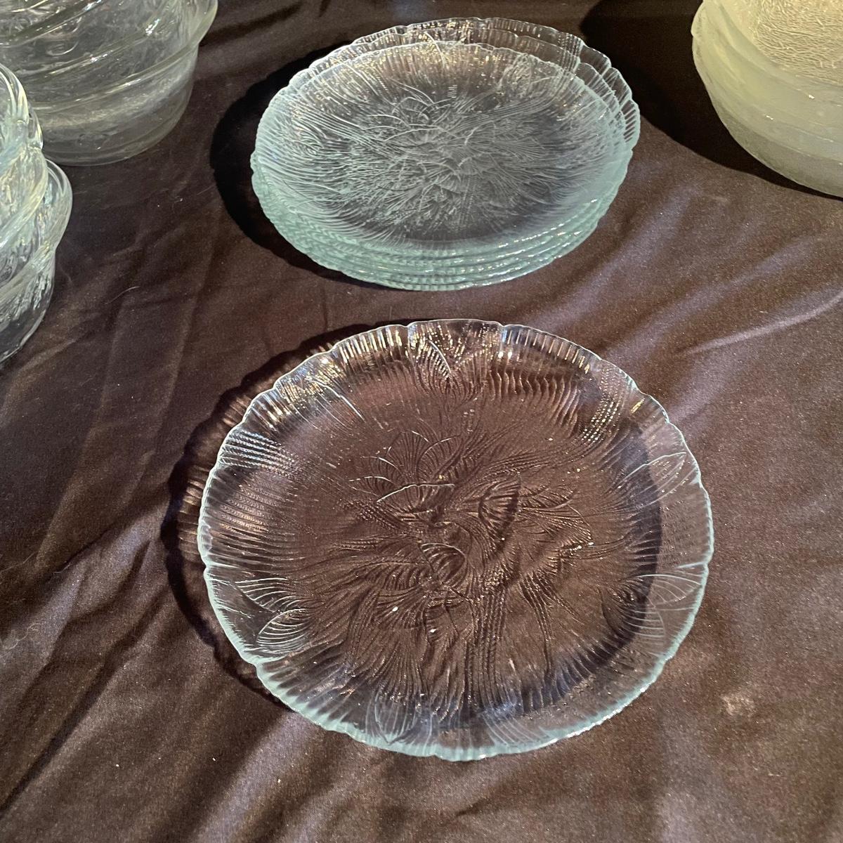 Two fish shaped platters, eight bowls with a floral and fruit motif, five leaf like bowls, and six floral plates make up this assortment of glass dinnerware.