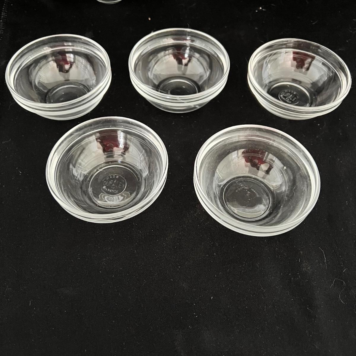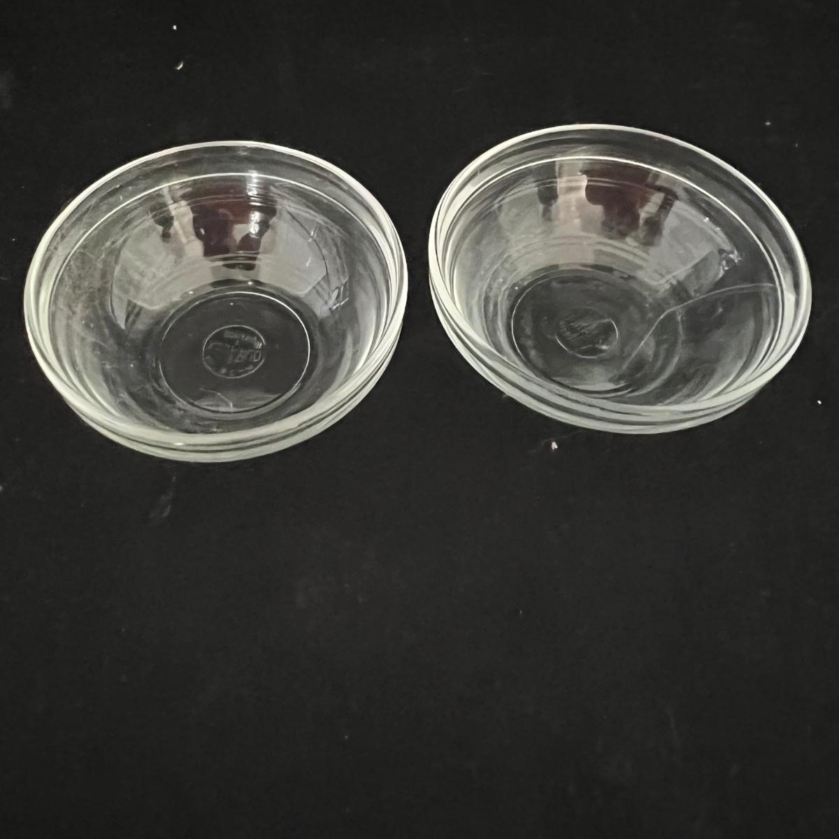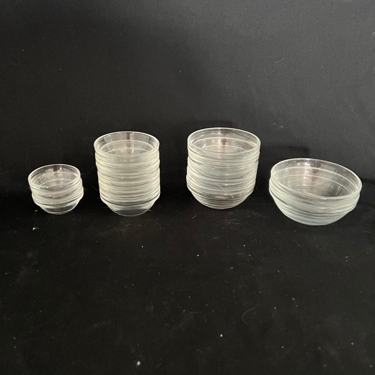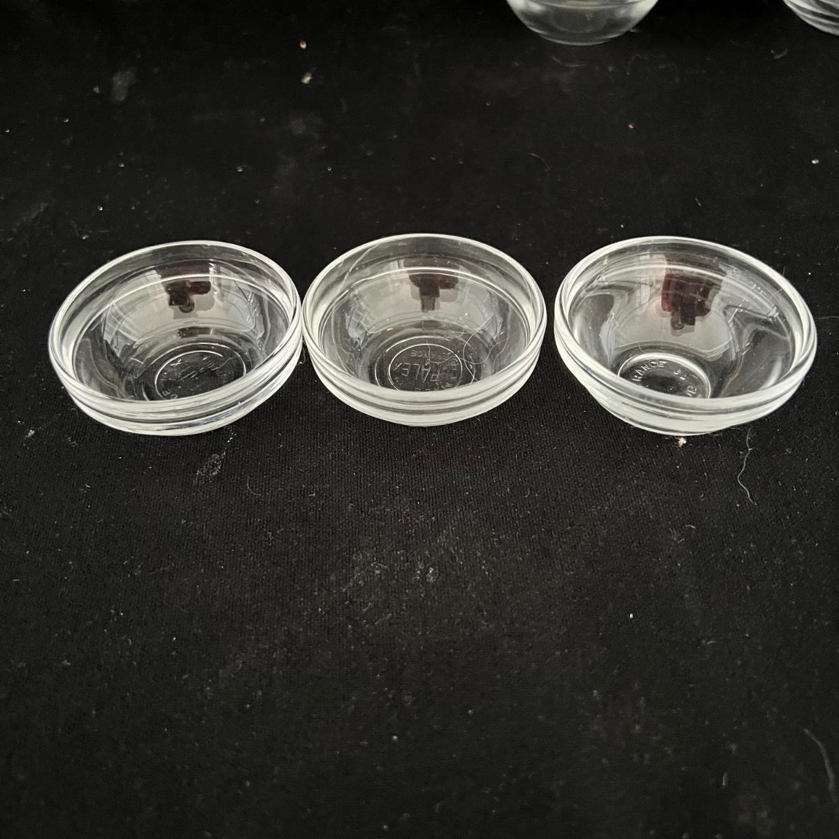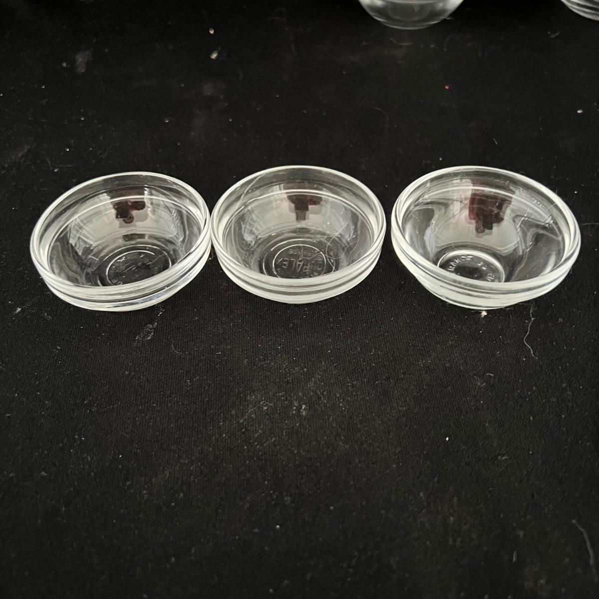 A large nested set of 16 Duralex glass prep bowls; the smallest is 2.25”D x .75”H and the largest is 4”D x 1.5”H. One Catamount Glass fat separator and one vintage style laboratory beaker with a straight side handle. And a Pyrex glass pitcher that measures approximately 4.5”D x 6.5”H.