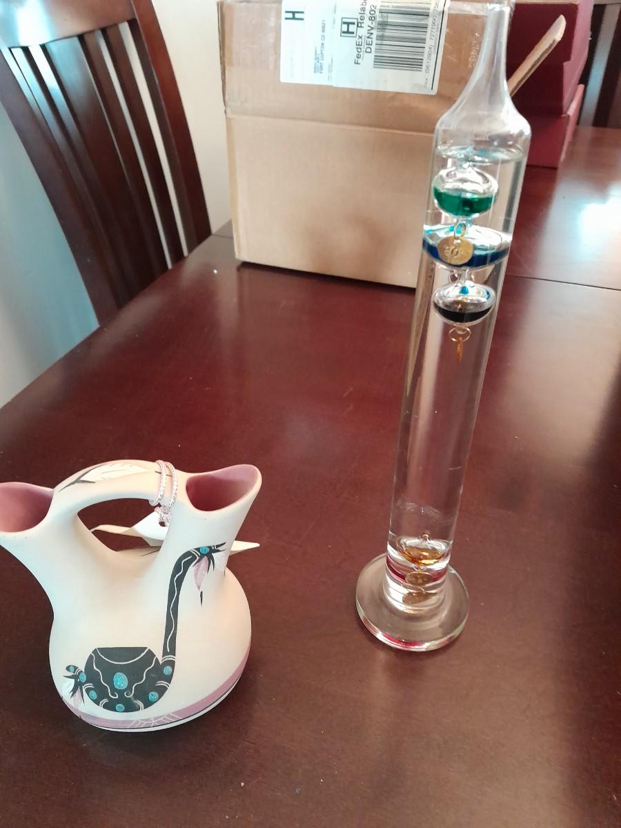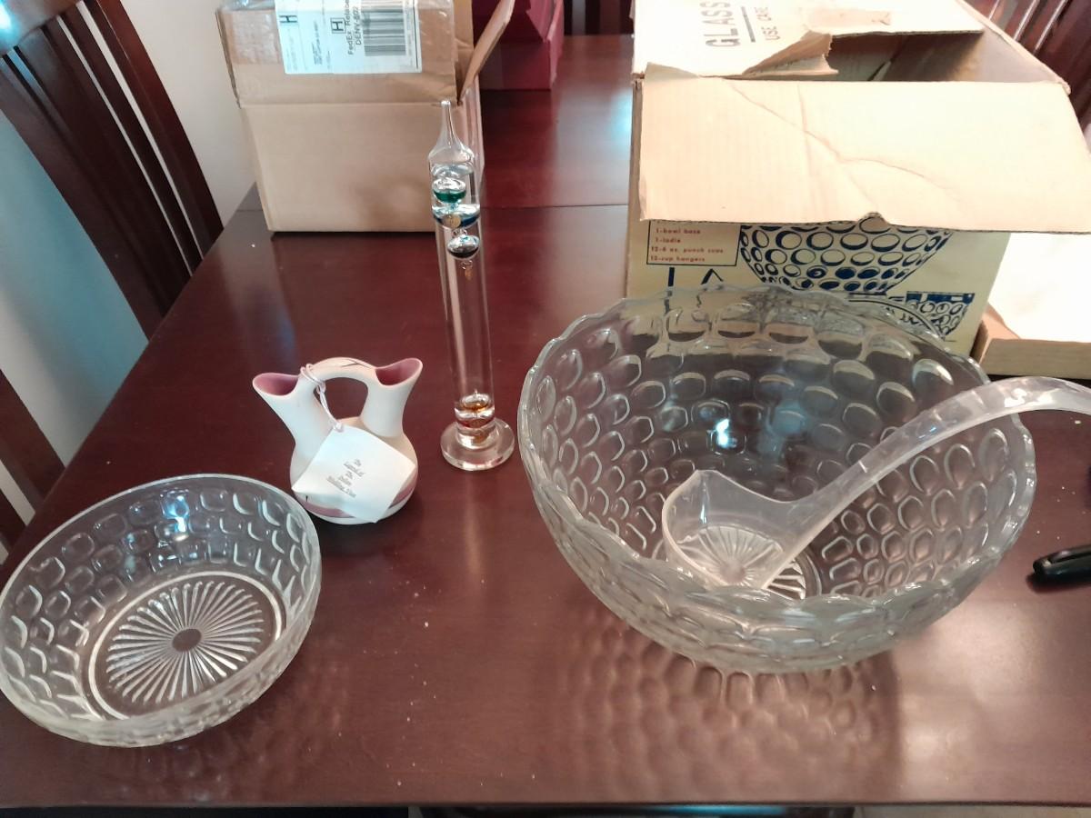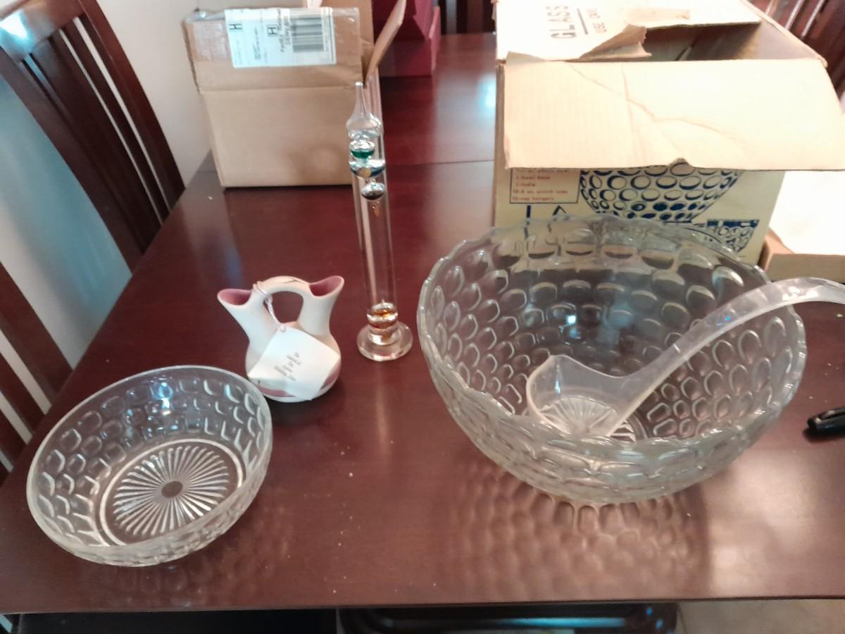 GLASS PUNCH BOWL WITH GALILEO THERMOMETER AND WEDDING VASE