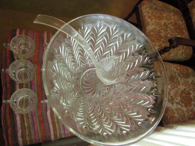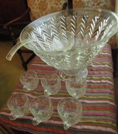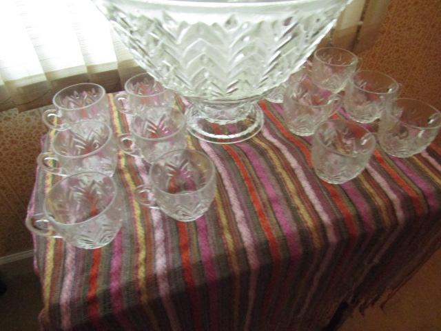 Glass Punch Bowl with Ladle and a Dozen Cups