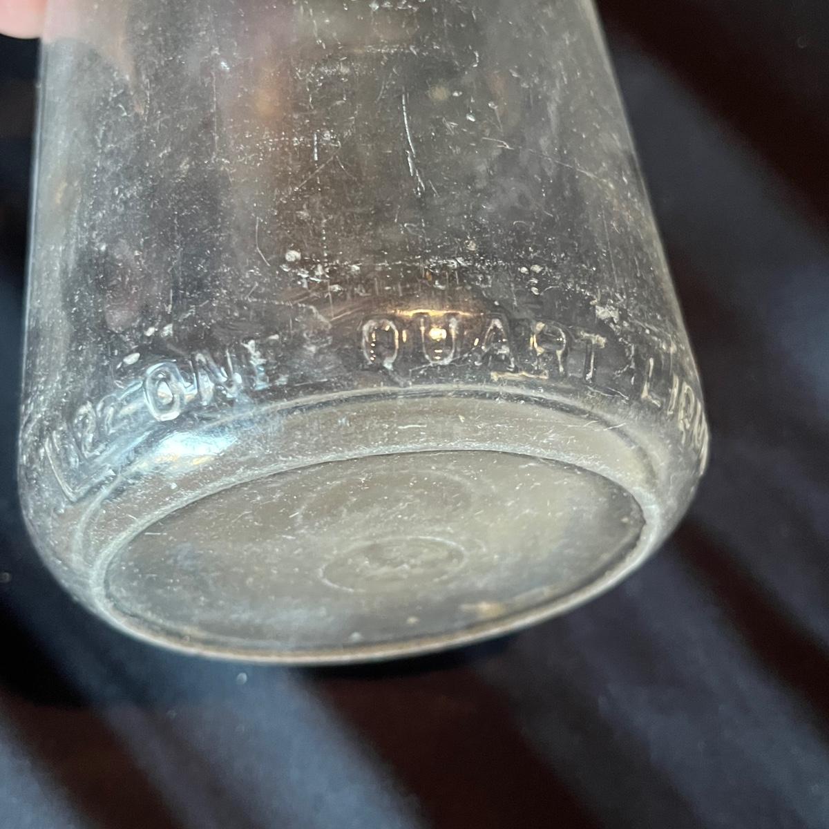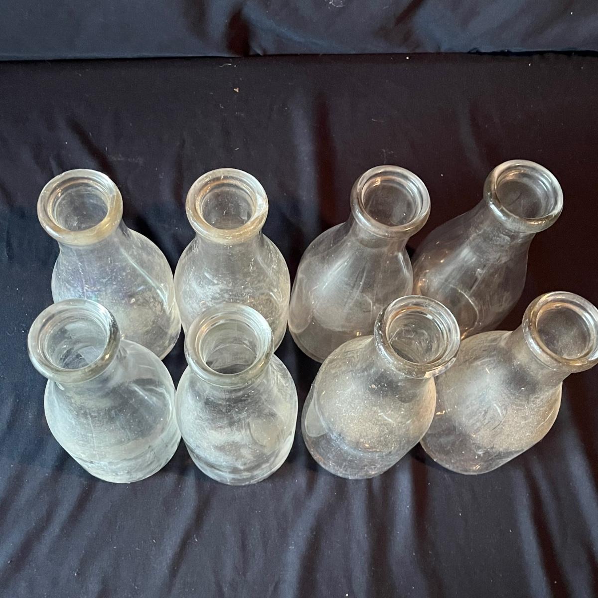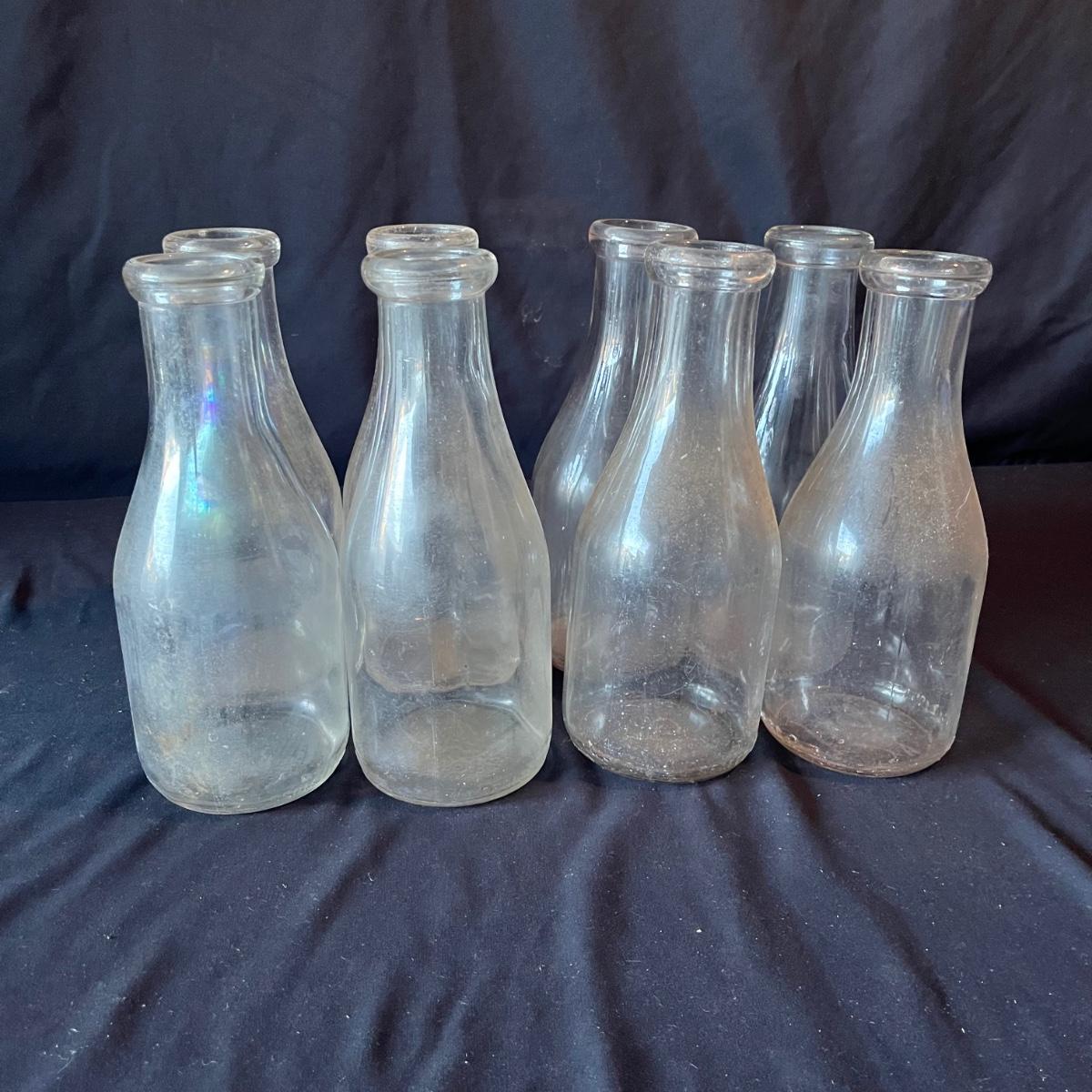 Lot includes eight glass quart bottles. Bottles measure 3.5”D x 9.5” tall. Bottles could use a good cleaning but there are scratches.
