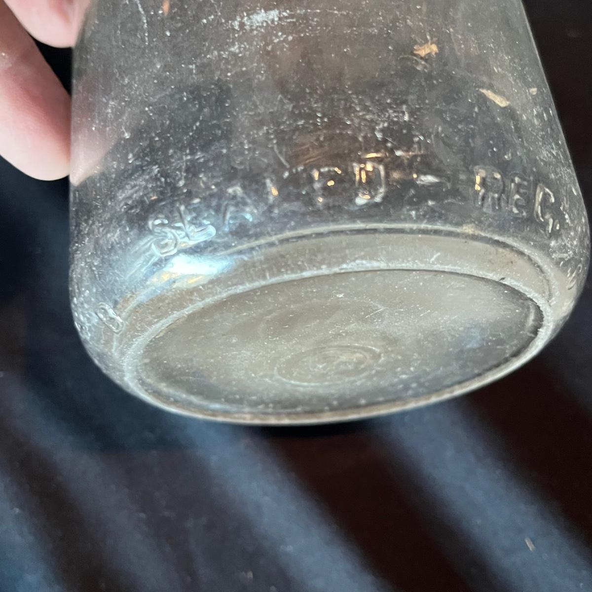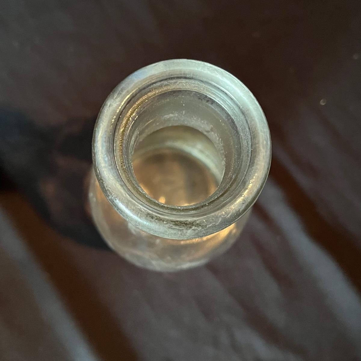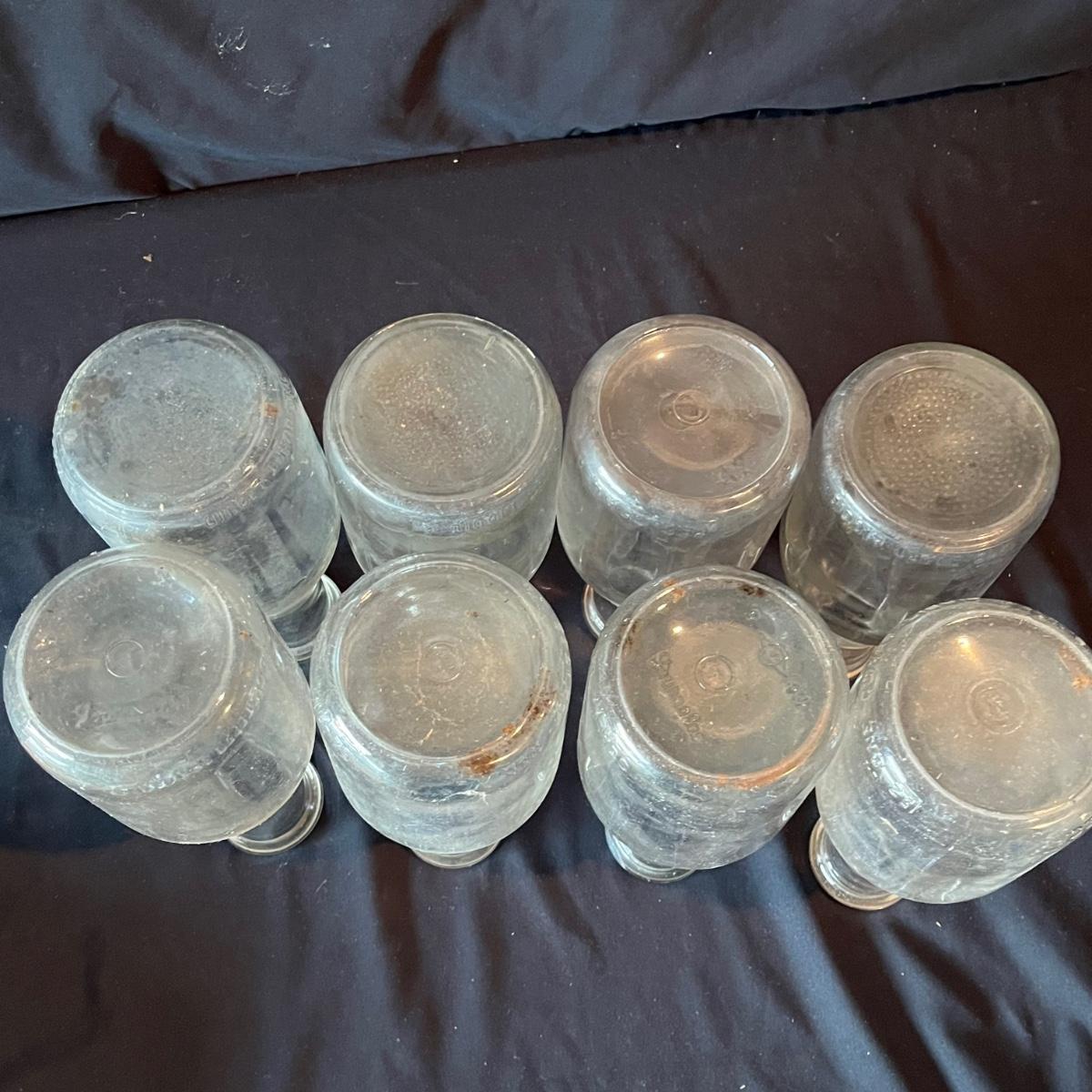 Lot includes eight glass quart bottles. Bottles measure 3.5”D x 9.5” tall. Bottles could use a good cleaning but there are scratches.