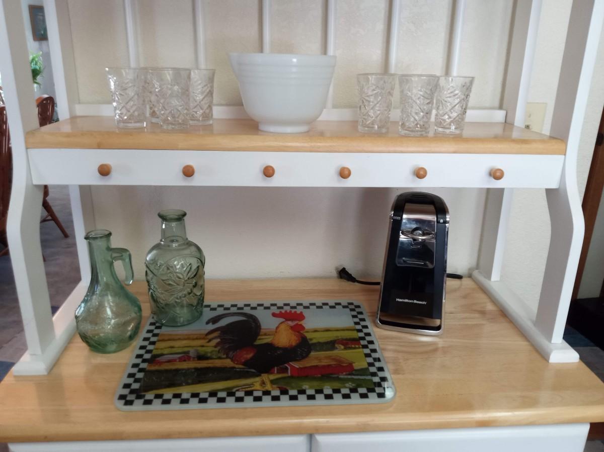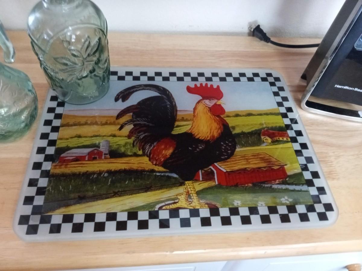 GLASS ROOSTER CUTTING BOARD, CAN OPENER, MIXING BOWL AND MORE