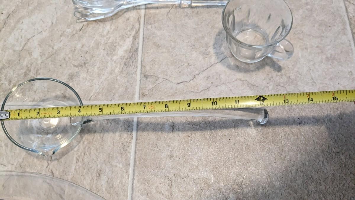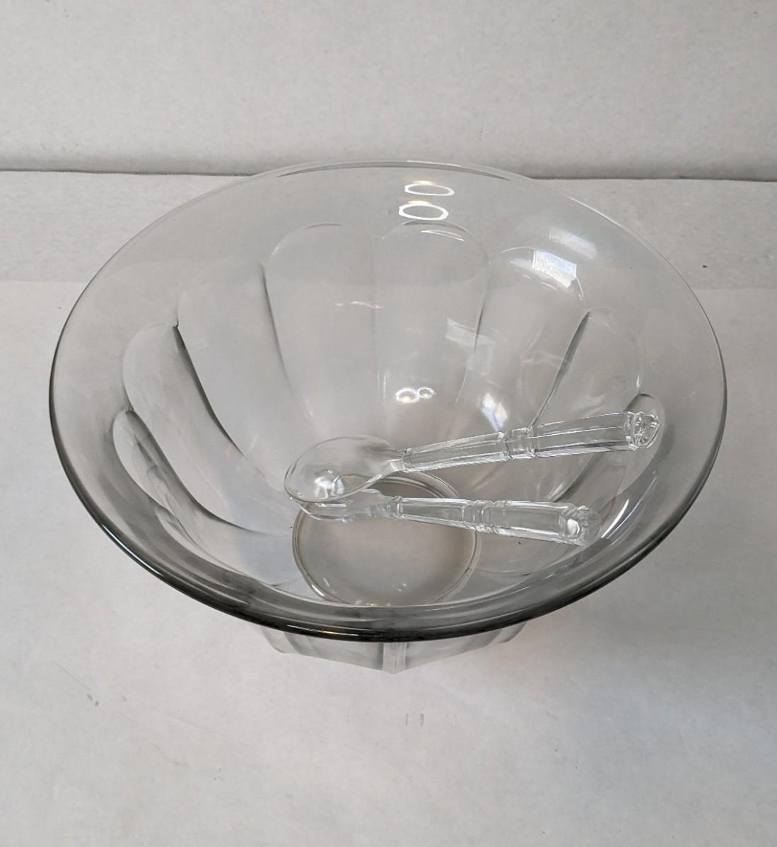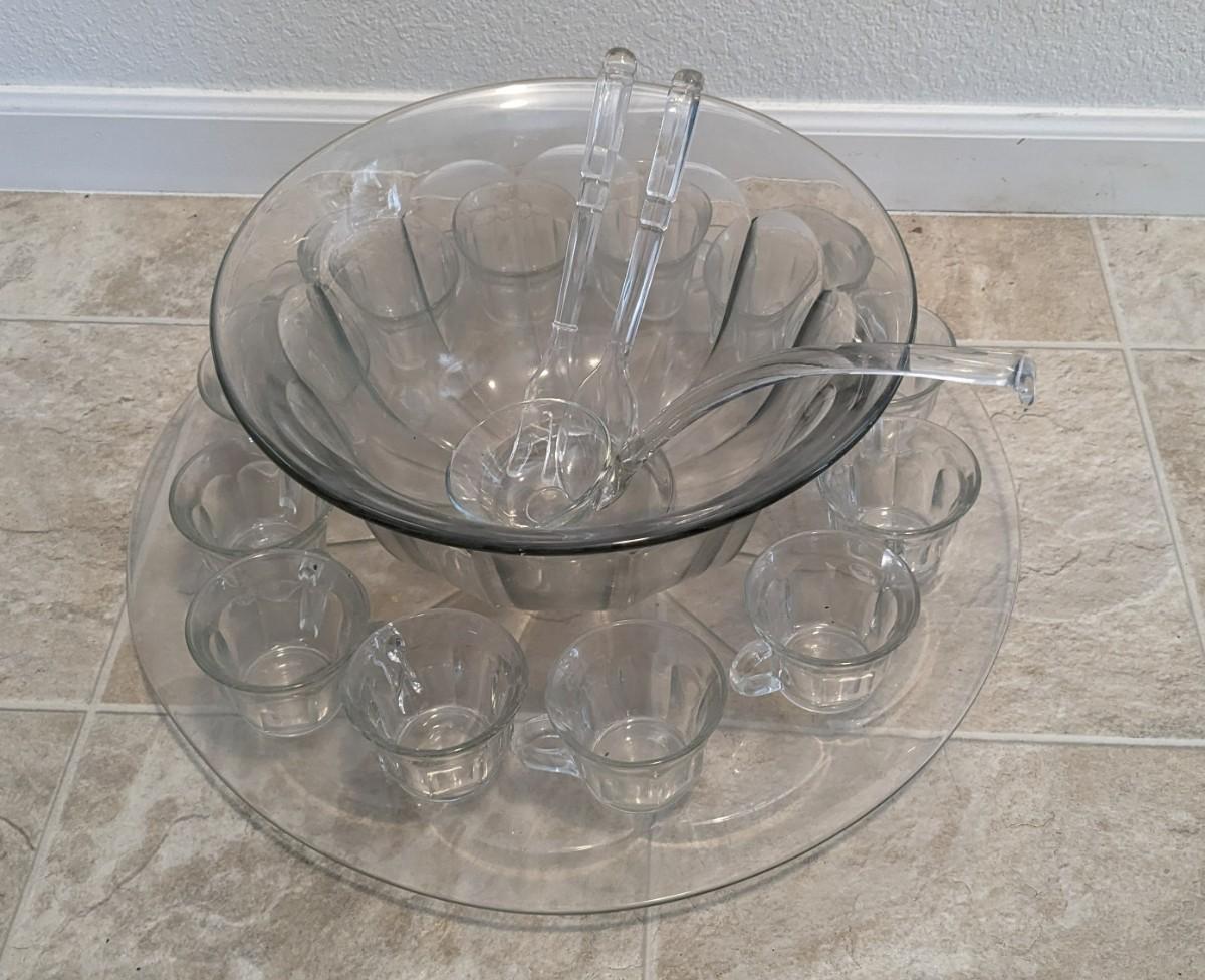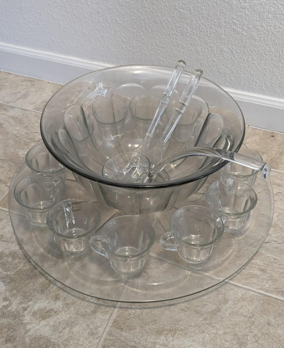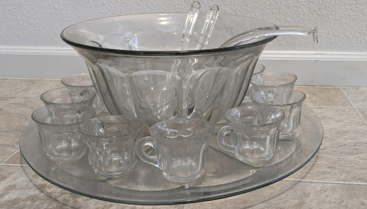 an immaculate 20" platter that looks like fruit slice or floral piece, 13.5"x6.75" smoky glass salad or punch bowl with 12 matching handled glasses, gorgeous 10" serving utensils and glass ladle. All pieces in excellent condition and beautiful! No shipping