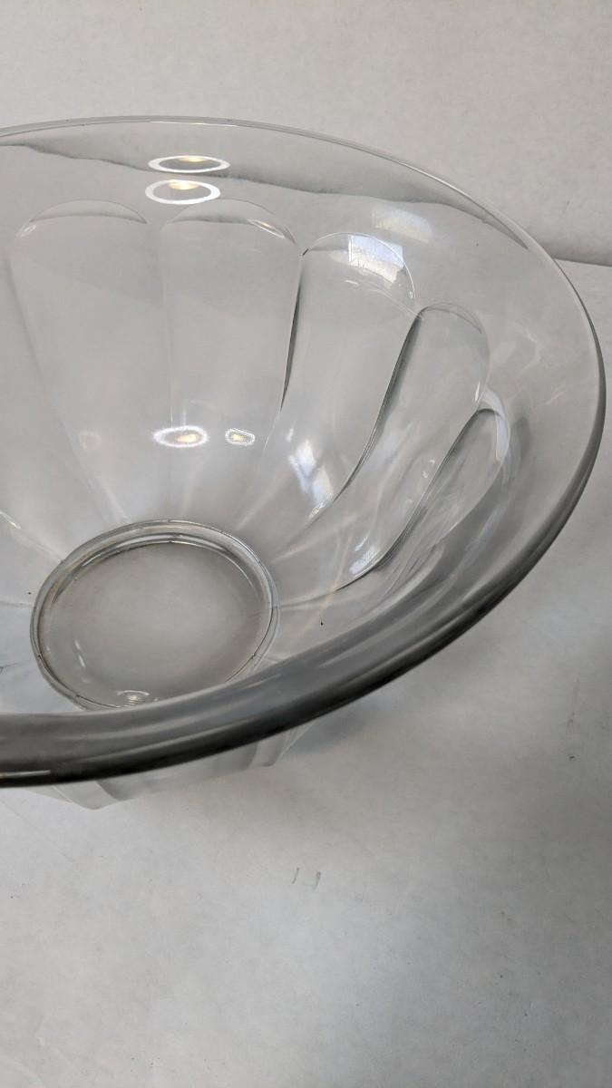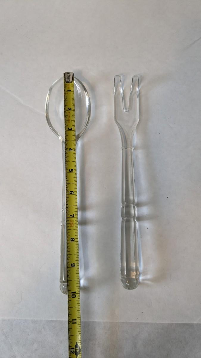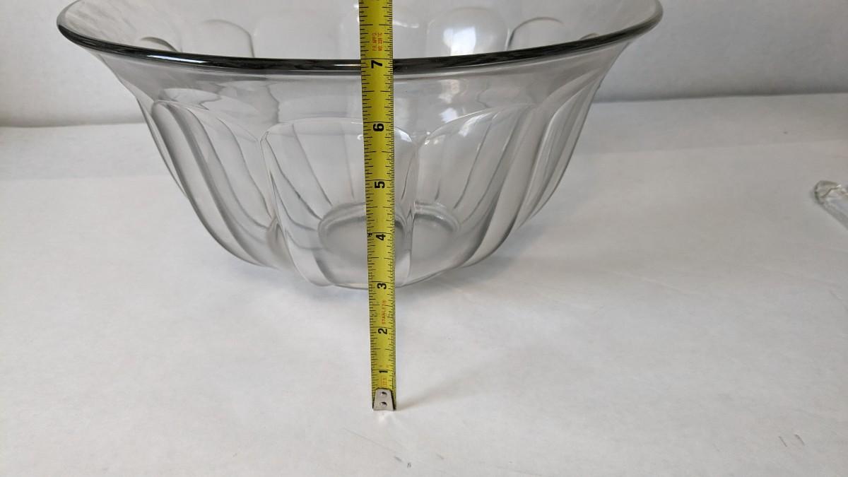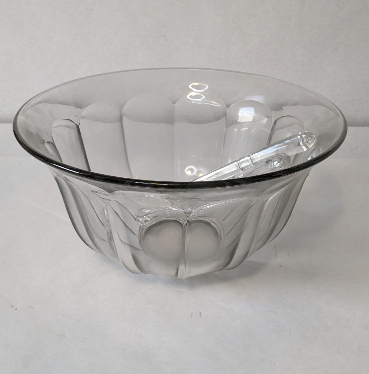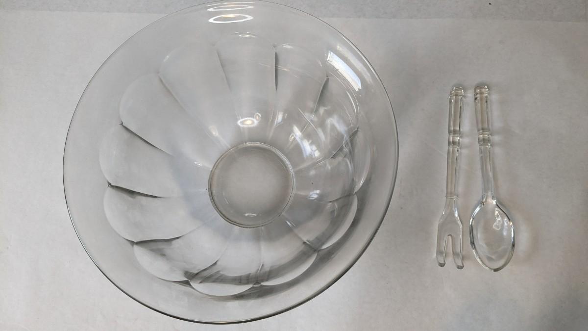 an immaculate 20" platter that looks like fruit slice or floral piece, 13.5"x6.75" smoky glass salad or punch bowl with 12 matching handled glasses, gorgeous 10" serving utensils and glass ladle. All pieces in excellent condition and beautiful! No shipping