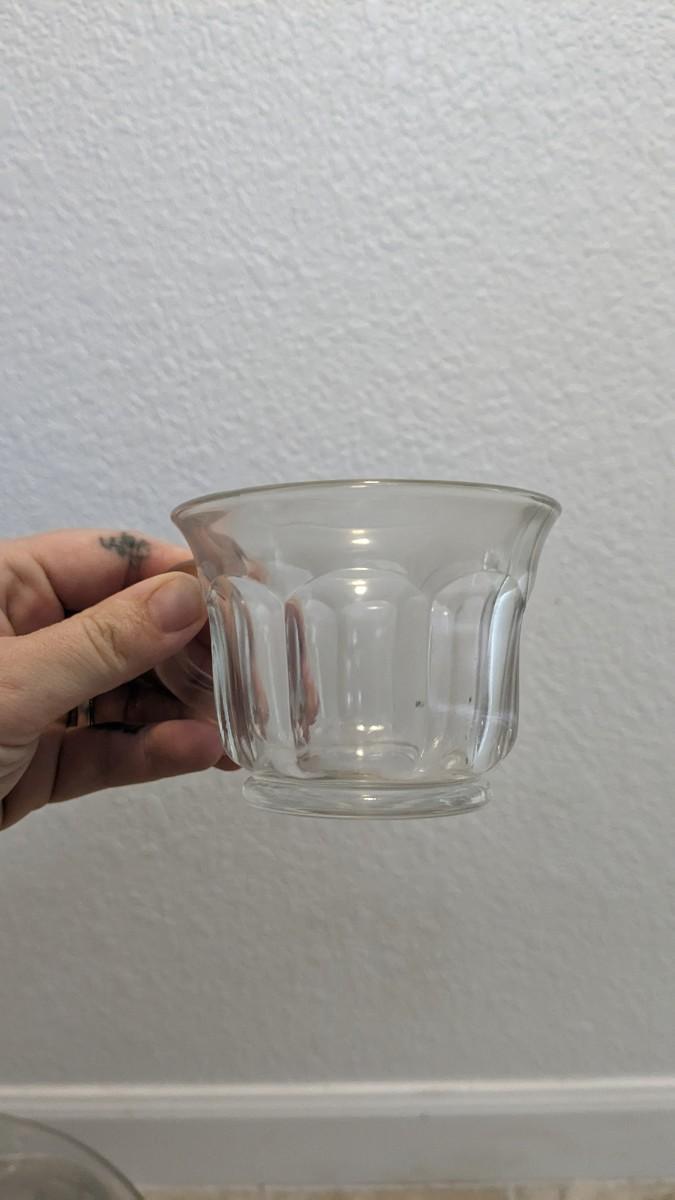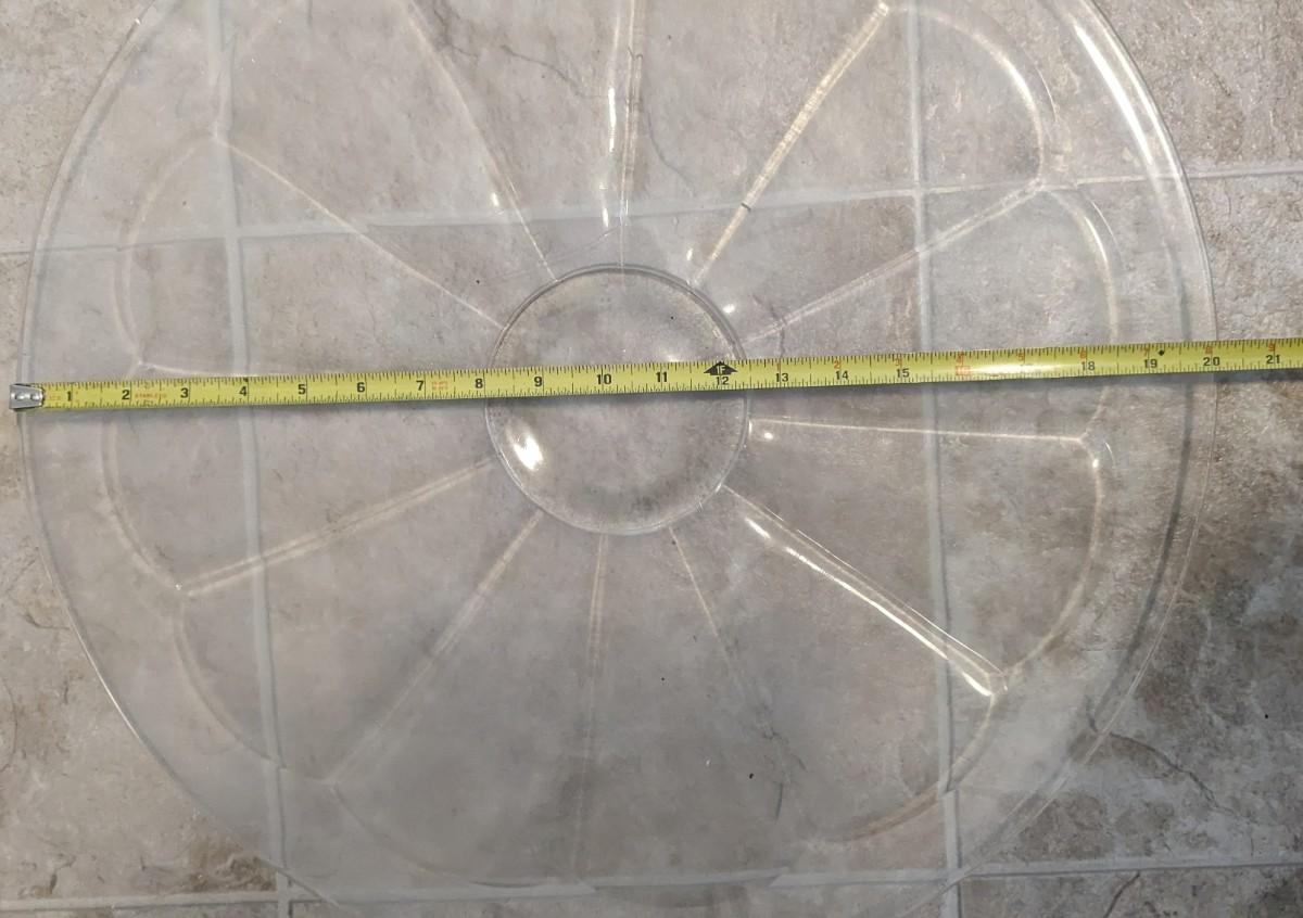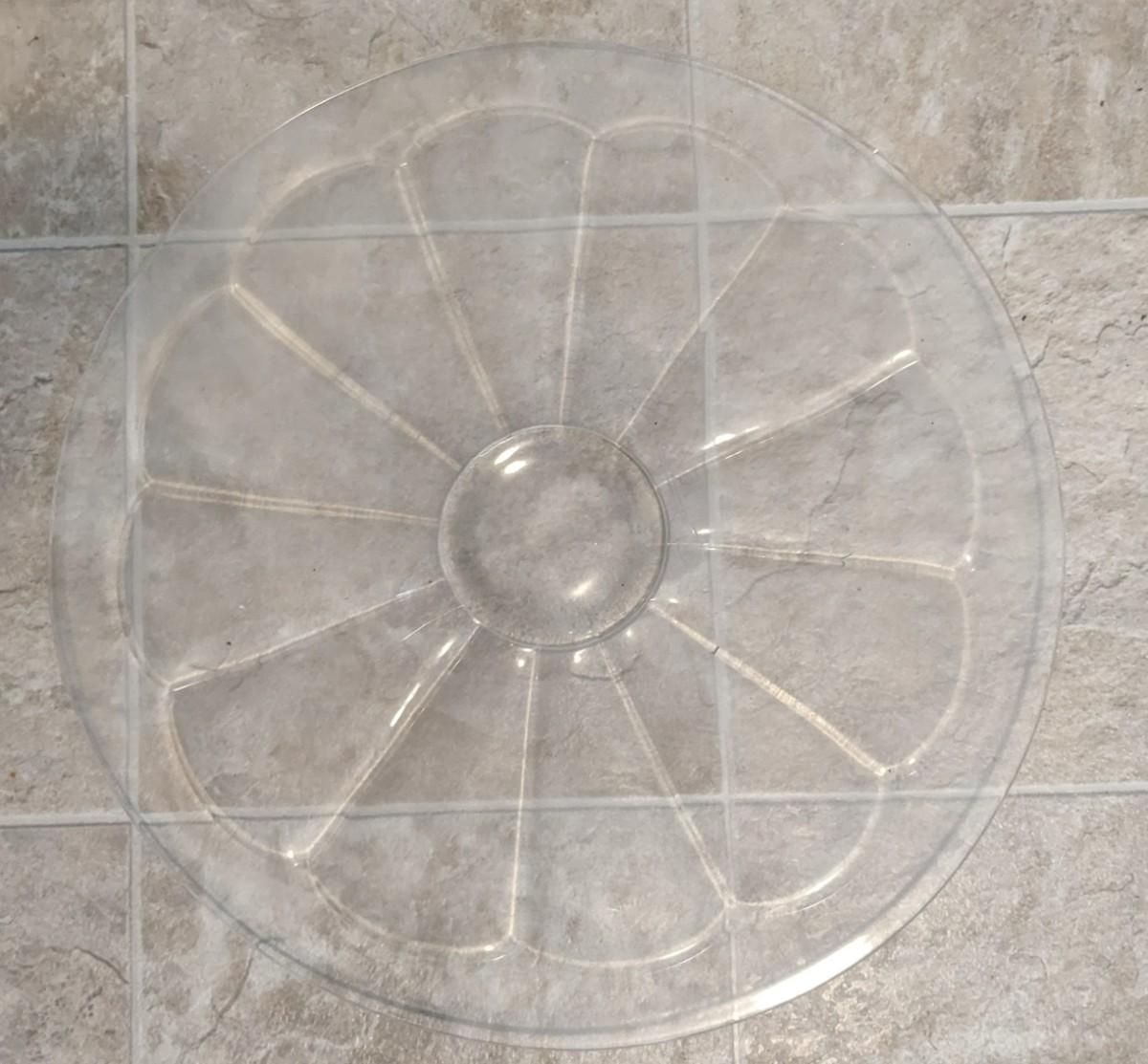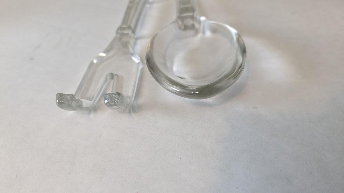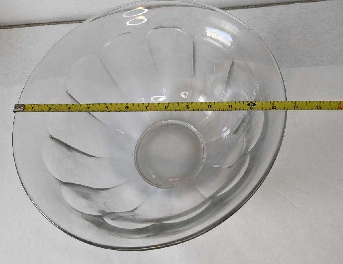an immaculate 20" platter that looks like fruit slice or floral piece, 13.5"x6.75" smoky glass salad or punch bowl with 12 matching handled glasses, gorgeous 10" serving utensils and glass ladle. All pieces in excellent condition and beautiful! No shipping
