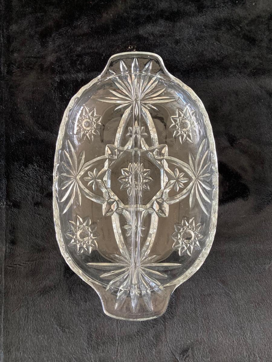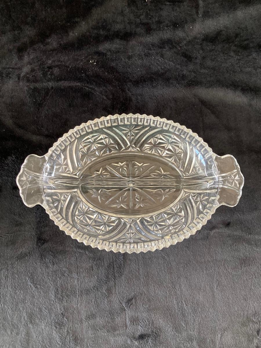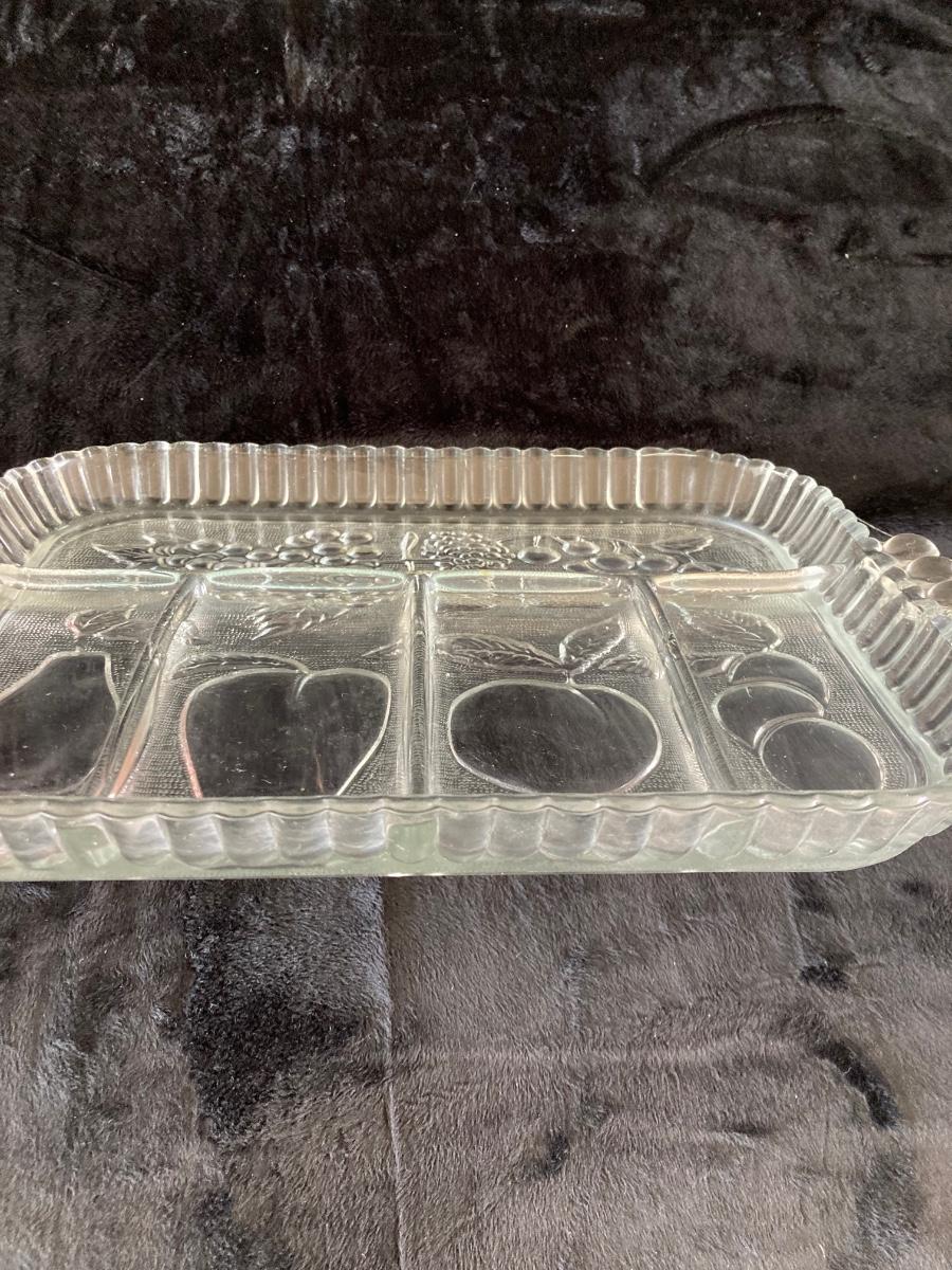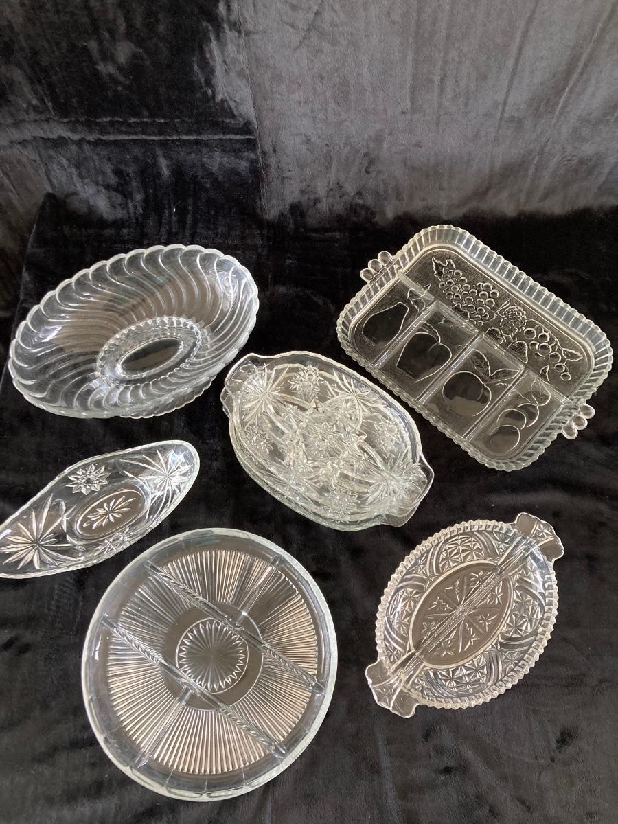 Group includes six pretty glass dishes great for entertaining. One Rectangular Dish with Fruit Design and dividers measures 11” x 9”. One Round. 9” diameter with dividers. One Oval Pedestal 11” x 7.5” x 5"H. One Oval 9.5" x 4”. And matching oblong dishes with handles measures 10” x 6”.