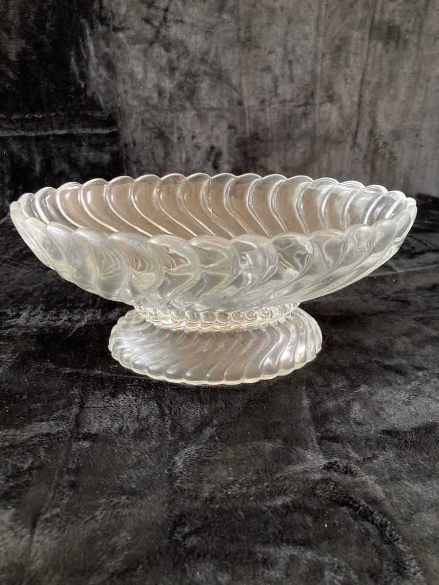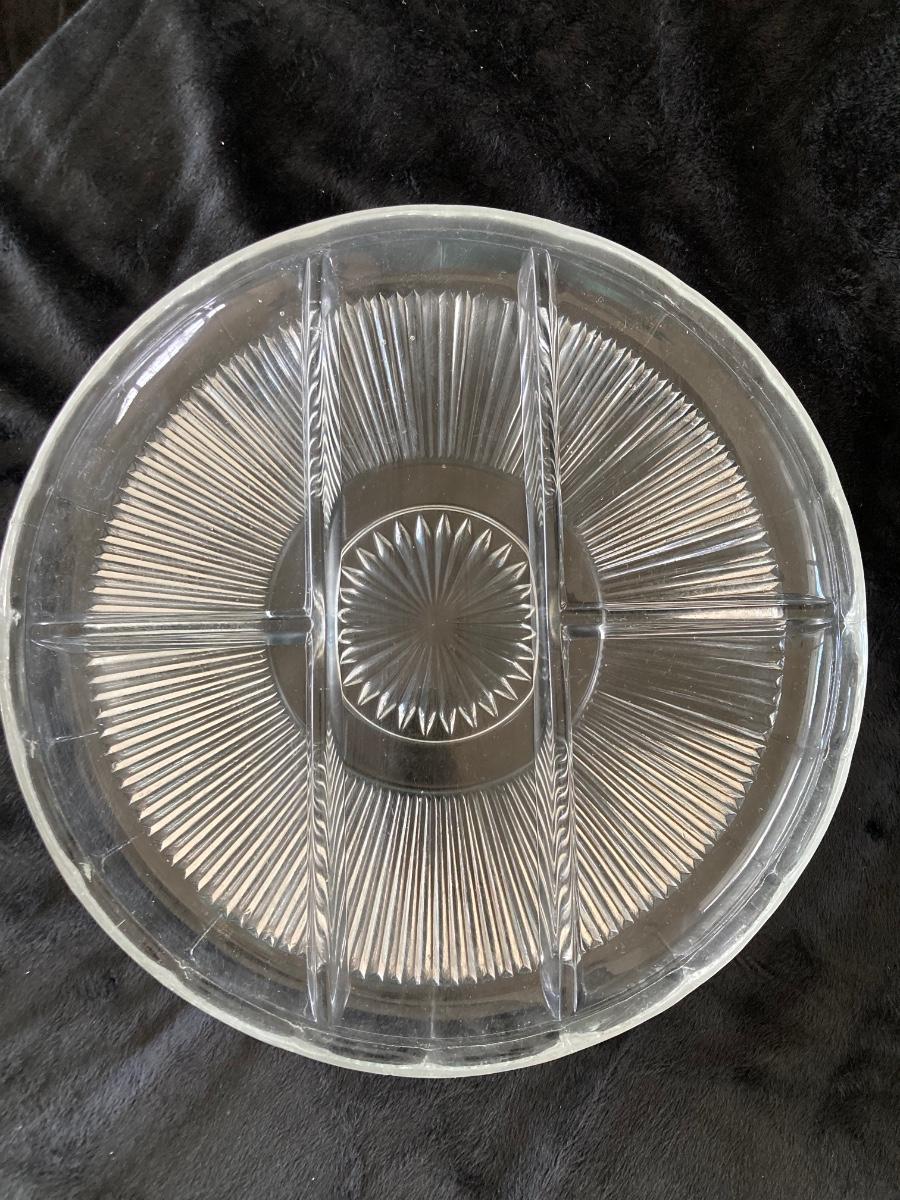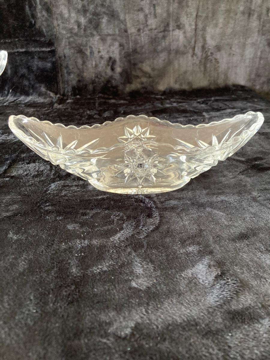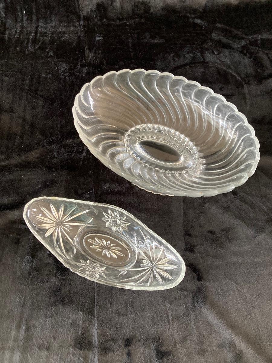 Group includes six pretty glass dishes great for entertaining. One Rectangular Dish with Fruit Design and dividers measures 11” x 9”. One Round. 9” diameter with dividers. One Oval Pedestal 11” x 7.5” x 5"H. One Oval 9.5" x 4”. And matching oblong dishes with handles measures 10” x 6”.