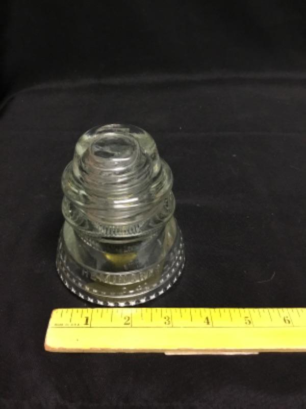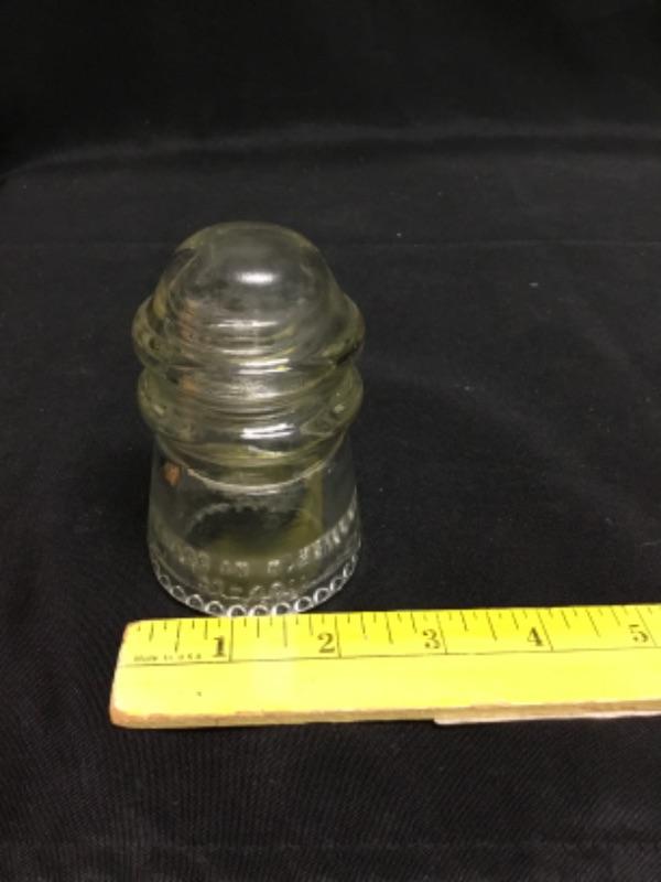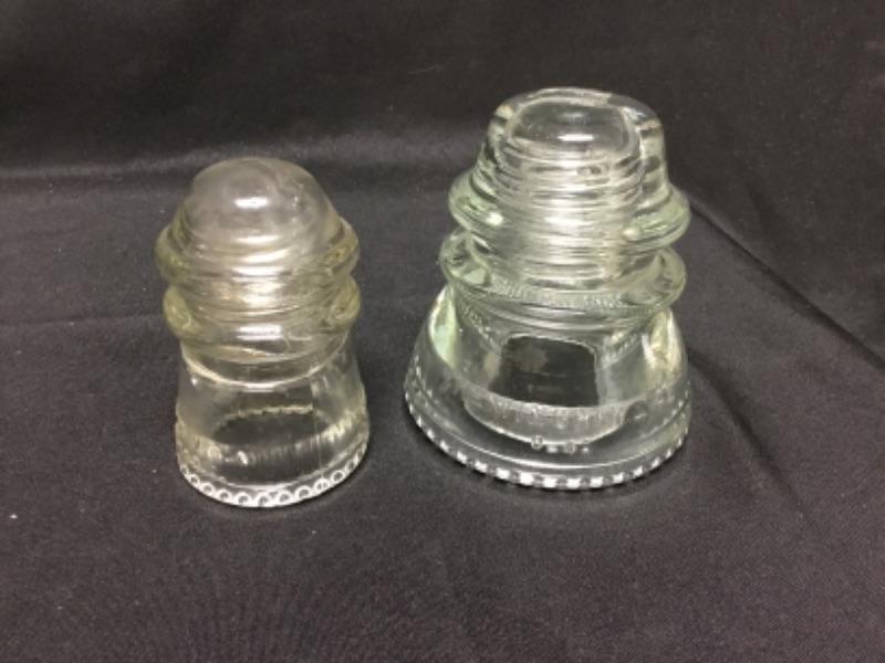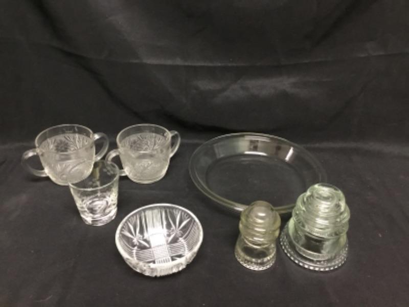 Seven piece glass lot. Pair of insulators, pyrex pie dish, bowl, cup, and 2 double handle cups.