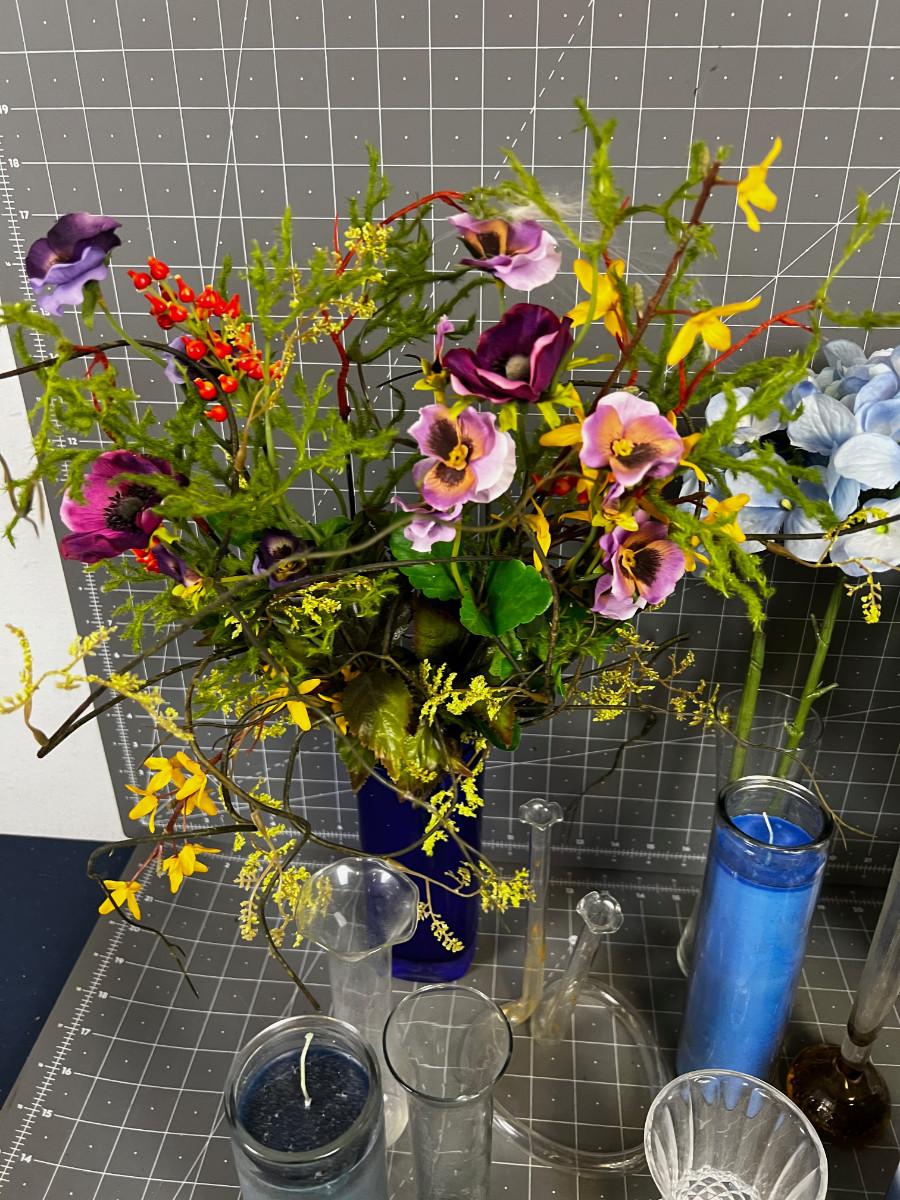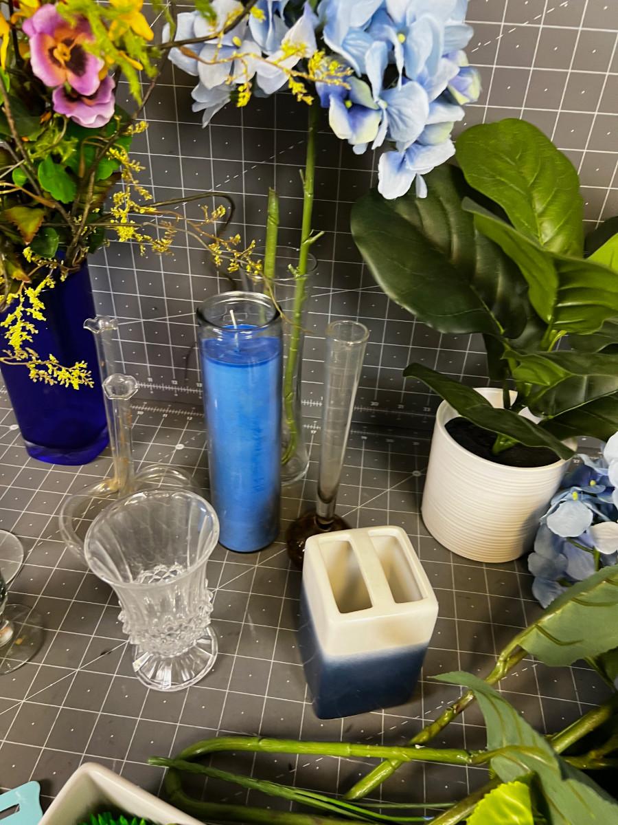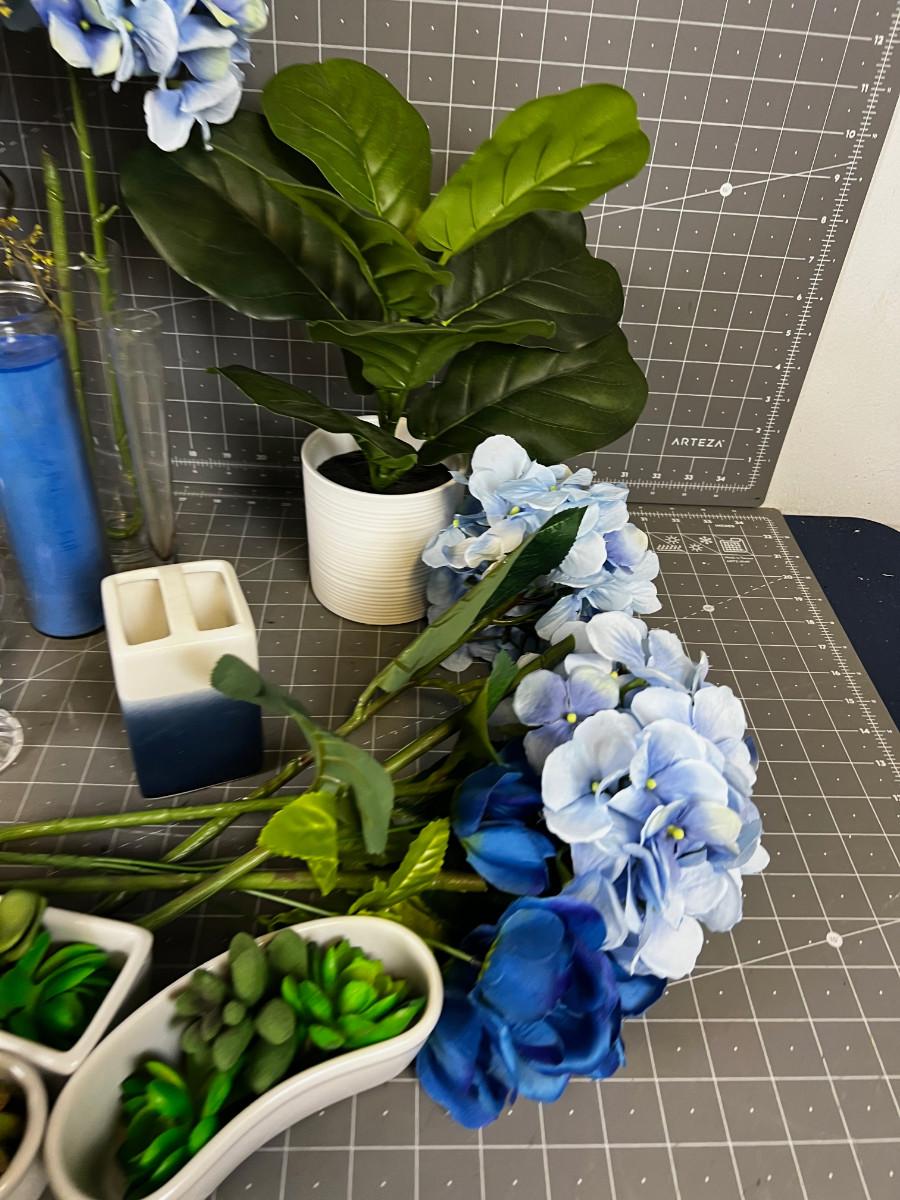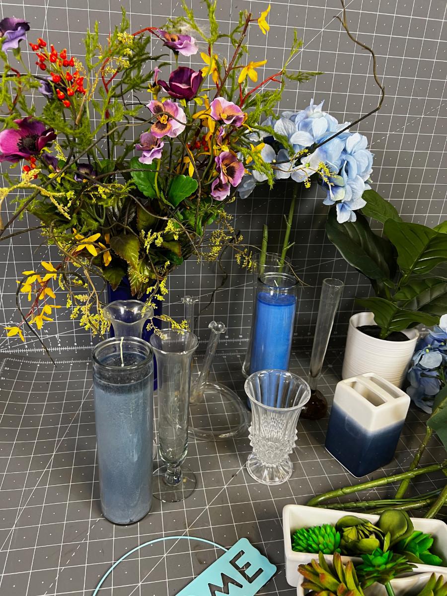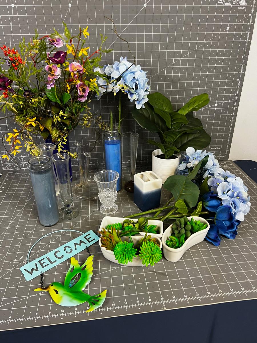Glass, Silk Flowers, Succulents Blue Themed lot